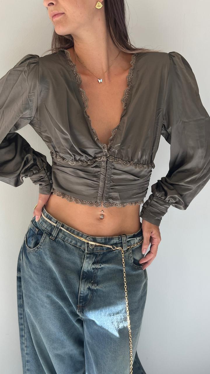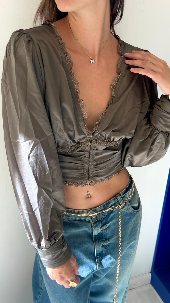Blusa de saten y encaje, con ballenitas y broches en la parte de adelante.Manga princesa, puño con botones forrados