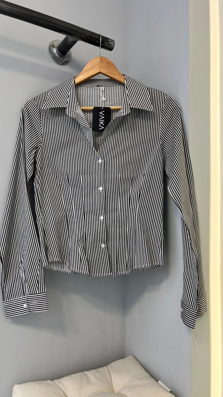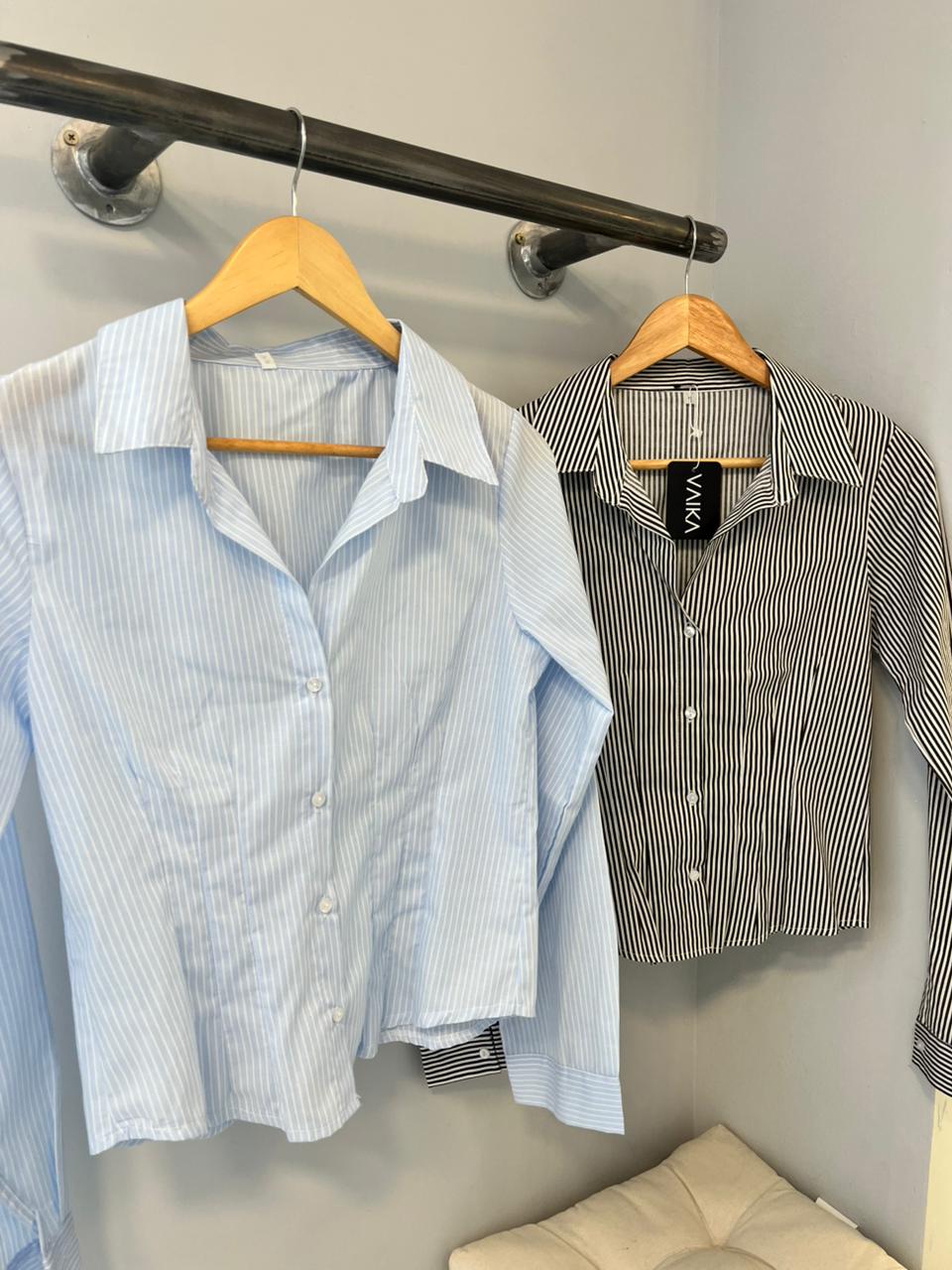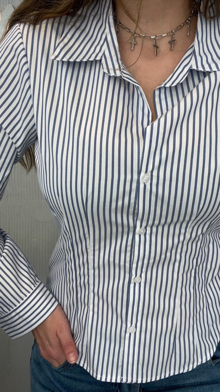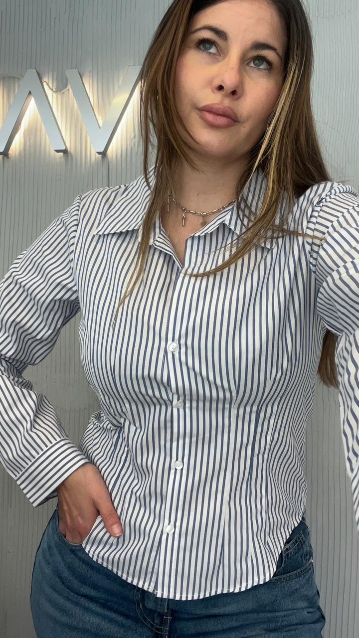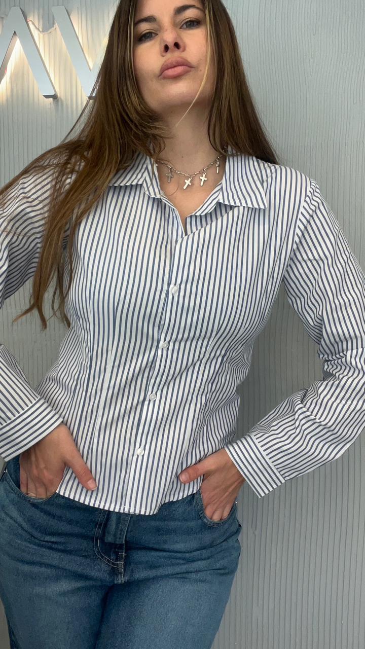 Camisa de mangas largas entallada con 3 pinzas, cuello solapa y escote en V. Cierre frontal con botones al tono.