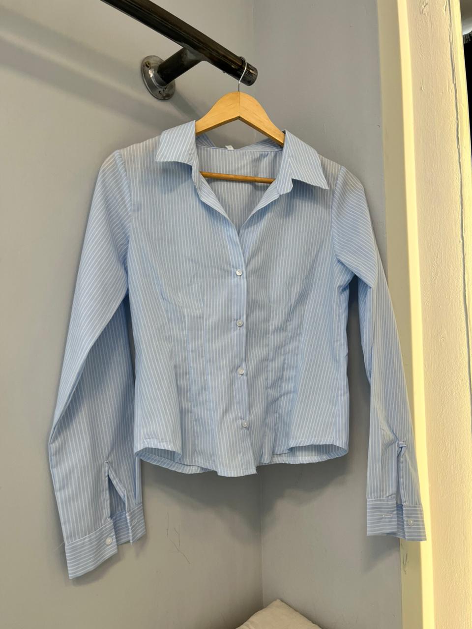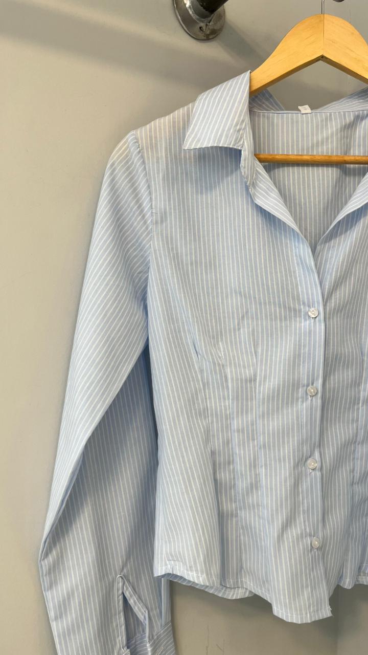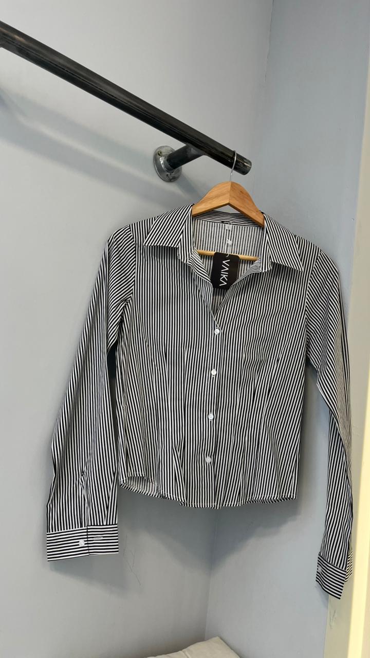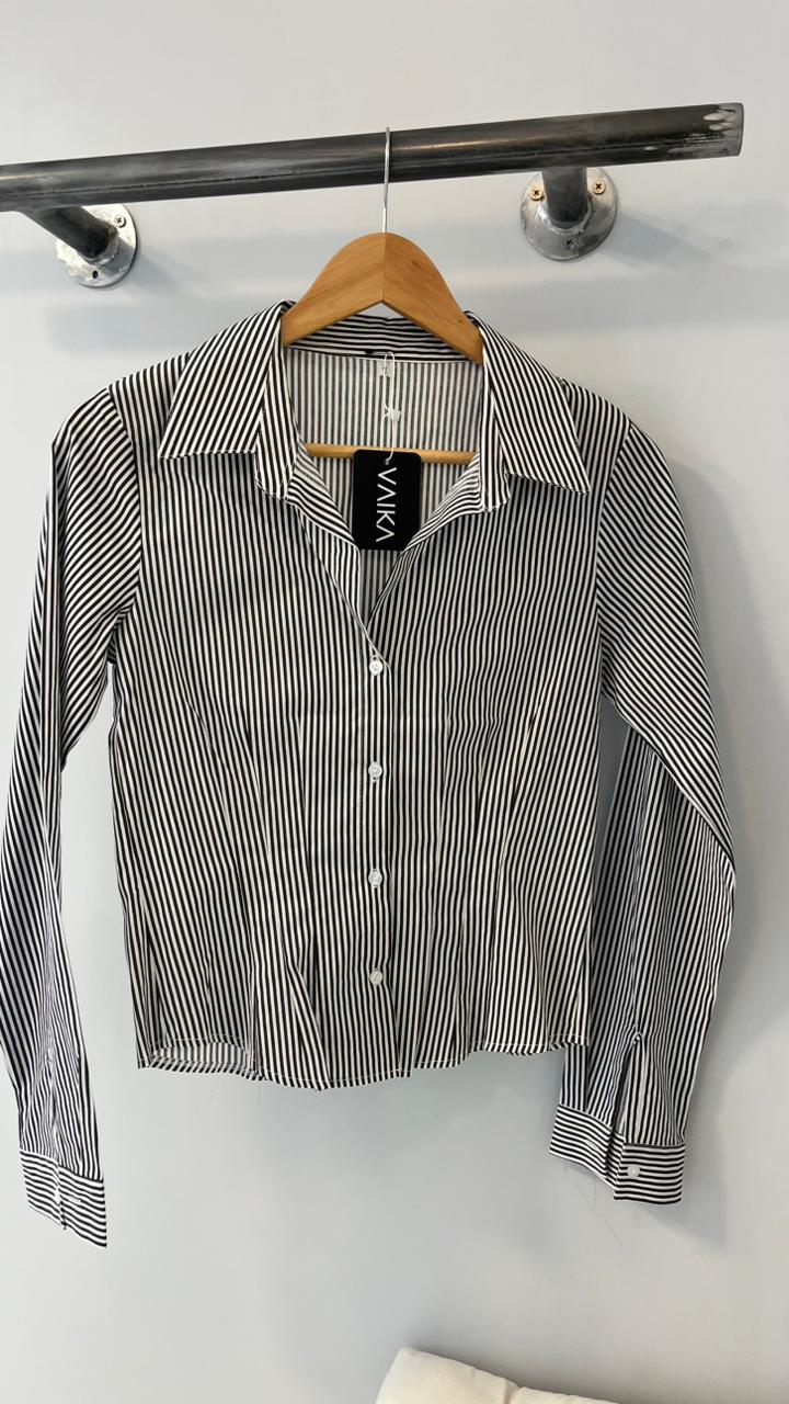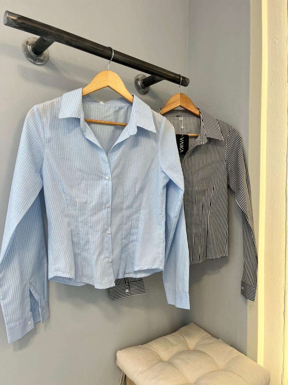 Camisa de mangas largas entallada con 3 pinzas, cuello solapa y escote en V. Cierre frontal con botones al tono.