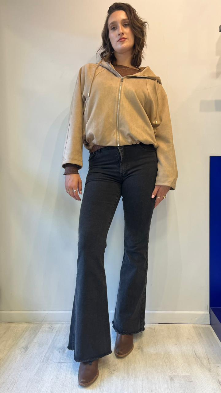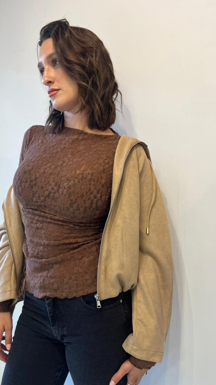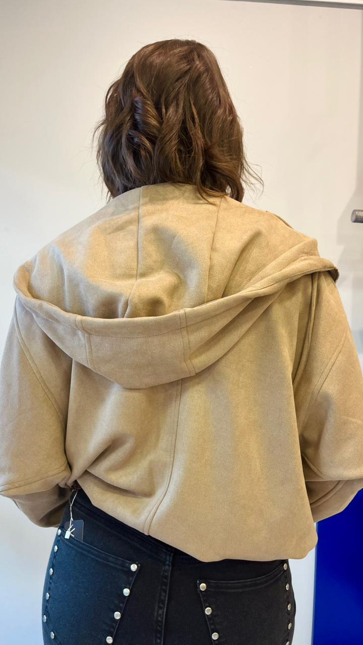 CAMPERA DE GAMUZA CON CAPUCHA 100% POLIESTER, CON FORRERÍA. CIERRE FRONTAL Y BOLSILLOS LATERALES. CON ELASTICO EN EL BAJO.
