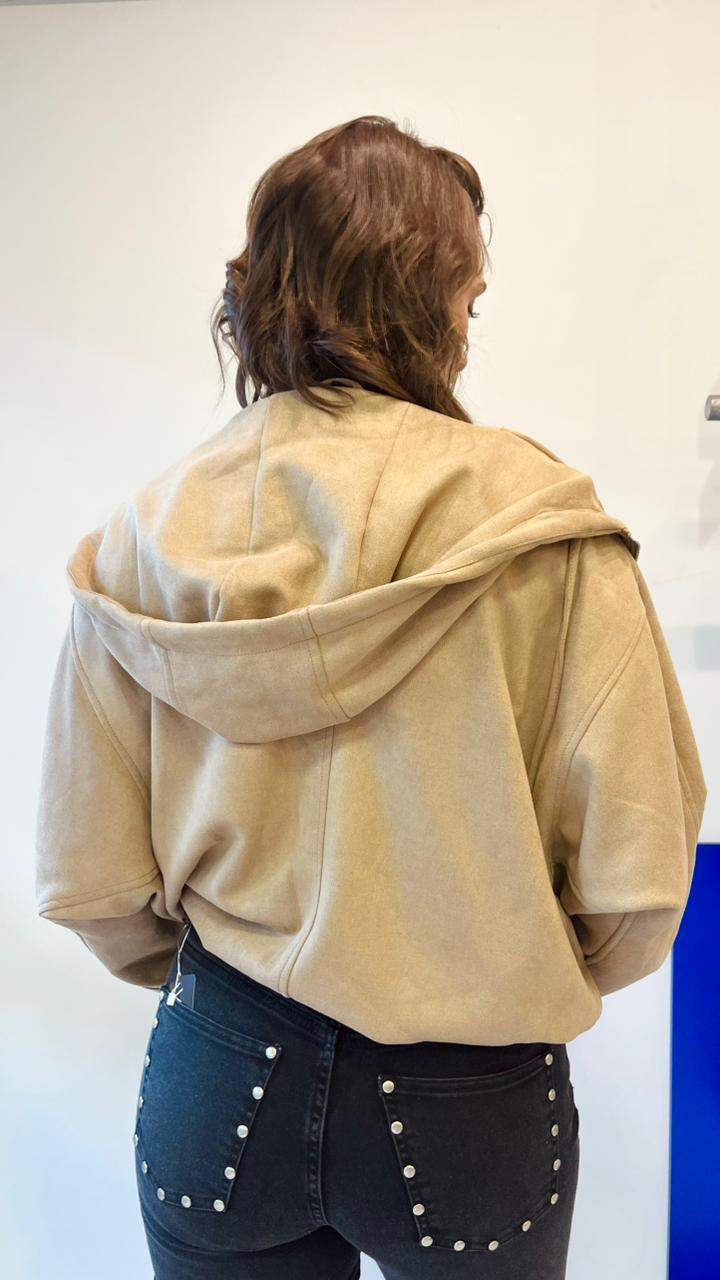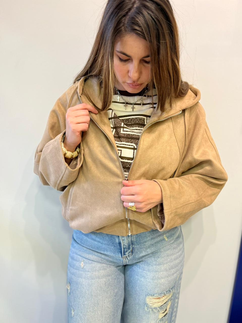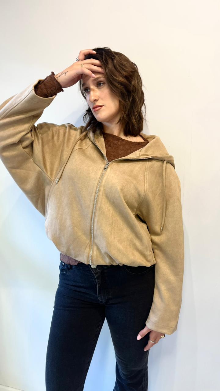 CAMPERA DE GAMUZA CON CAPUCHA 100% POLIESTER, CON FORRERÍA. CIERRE FRONTAL Y BOLSILLOS LATERALES. CON ELASTICO EN EL BAJO.