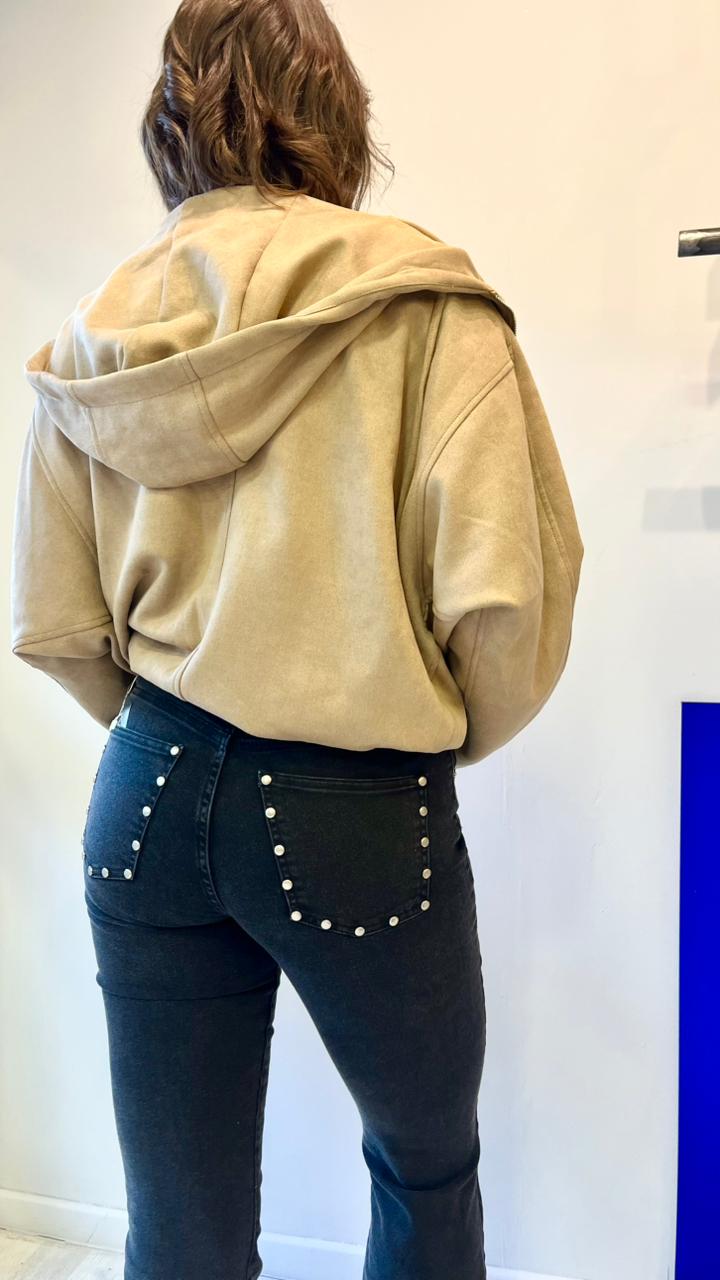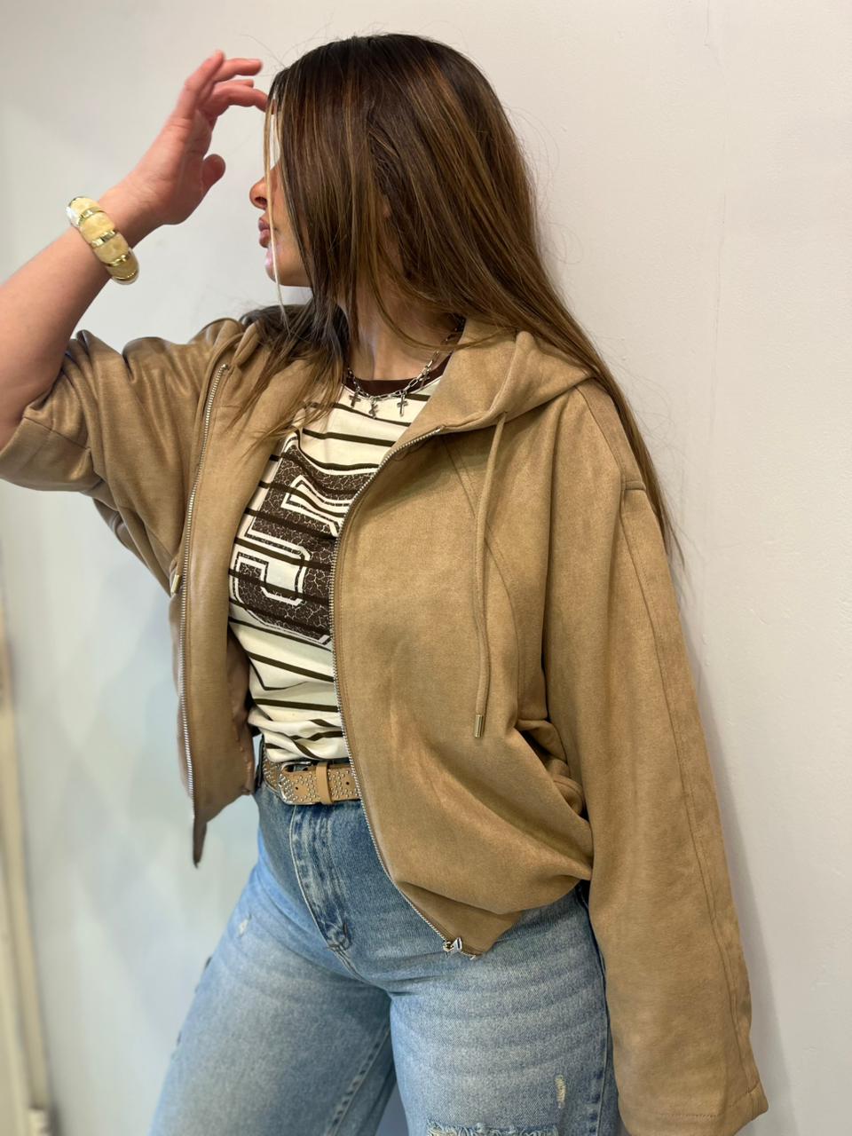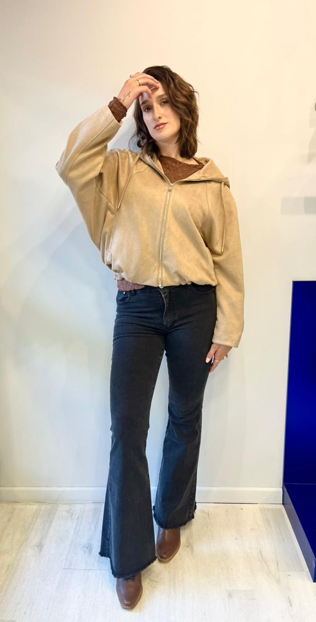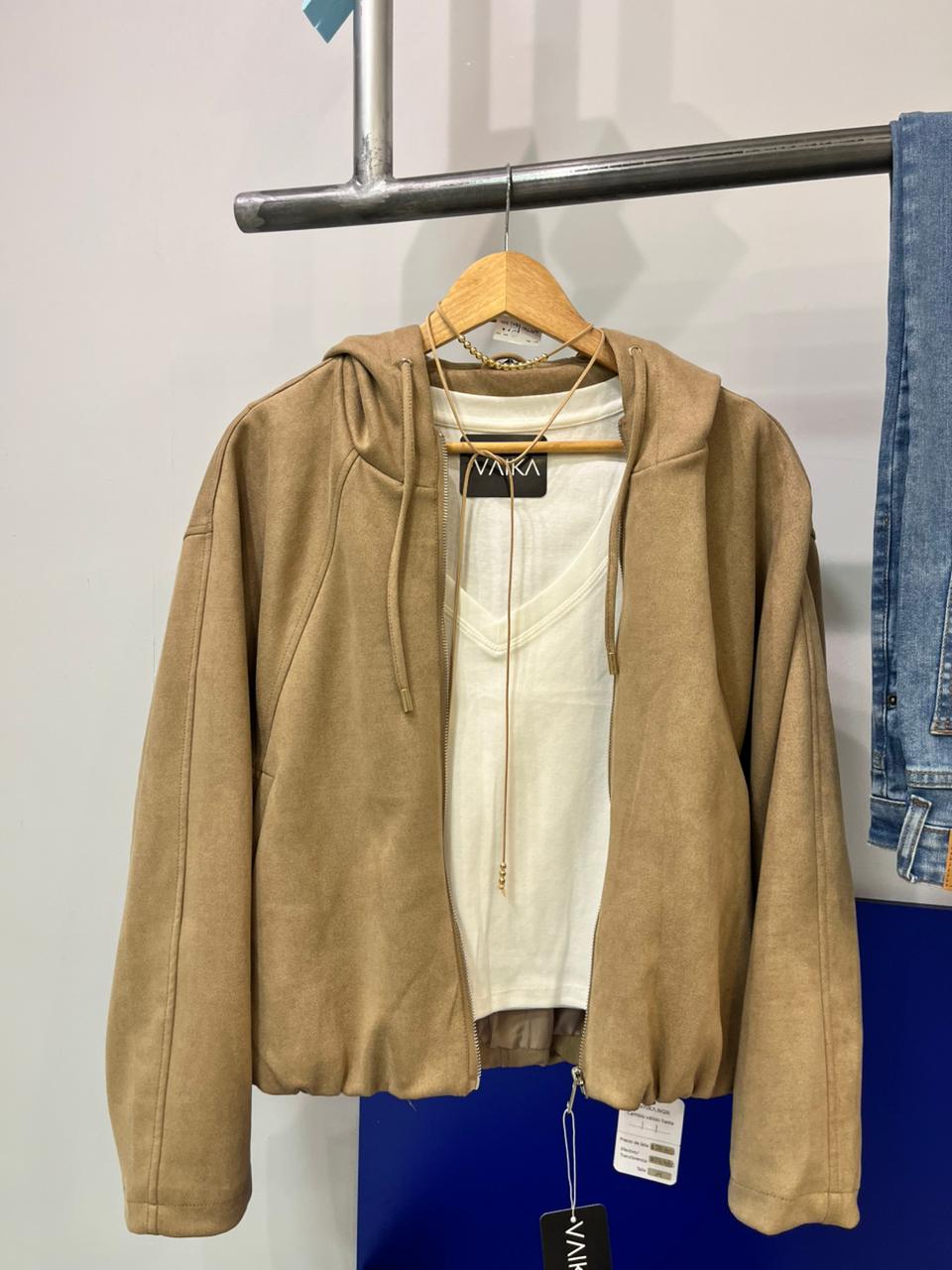 CAMPERA DE GAMUZA CON CAPUCHA 100% POLIESTER, CON FORRERÍA. CIERRE FRONTAL Y BOLSILLOS LATERALES. CON ELASTICO EN EL BAJO.