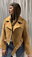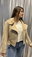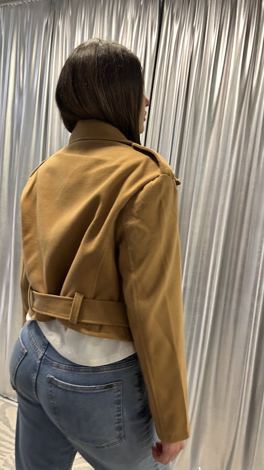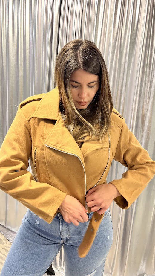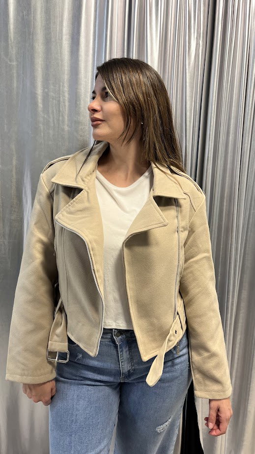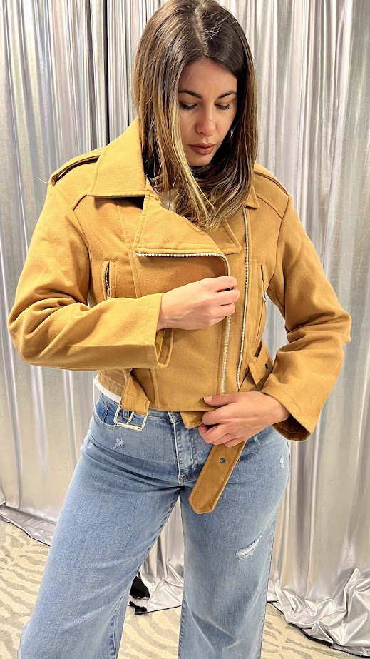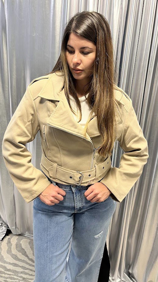 Campera corta estilo biker con solapas amplias, charretera en los hombros y cinto con hebilla para el ajuste. Cierre frontal cruzado y bolsillos con cierre.