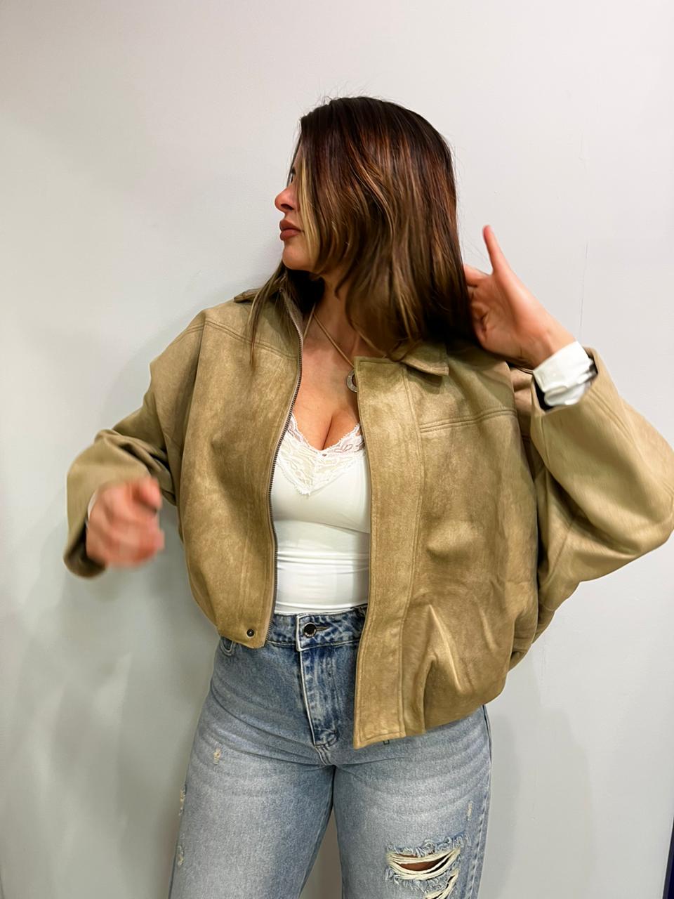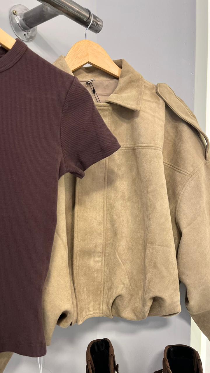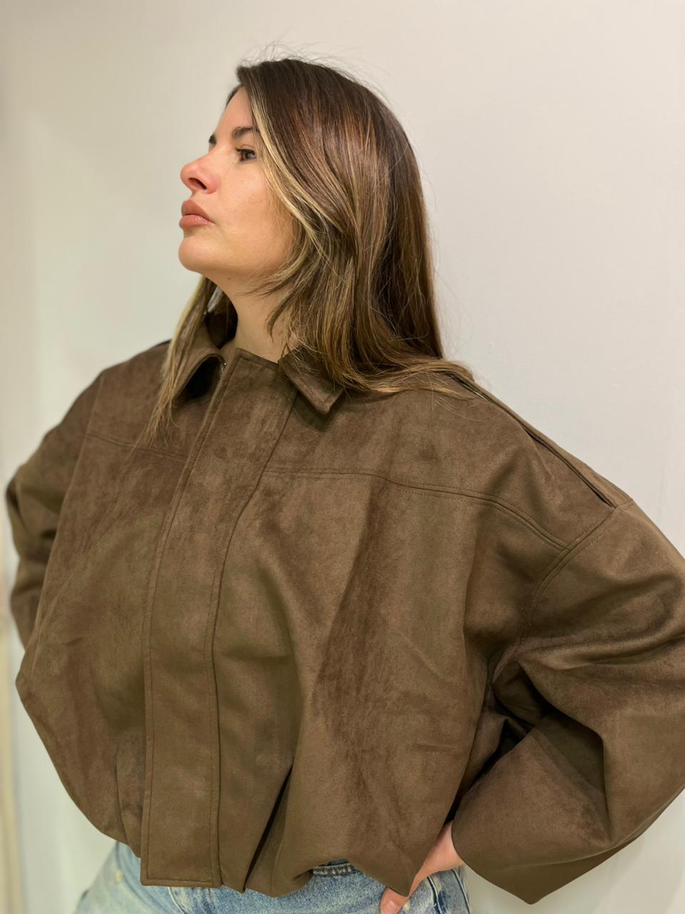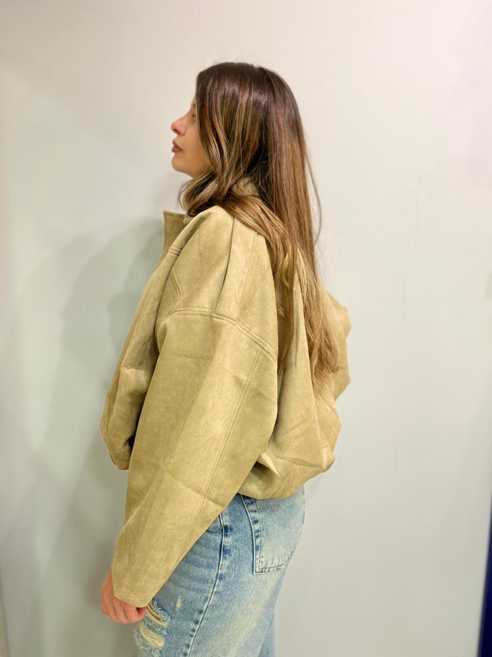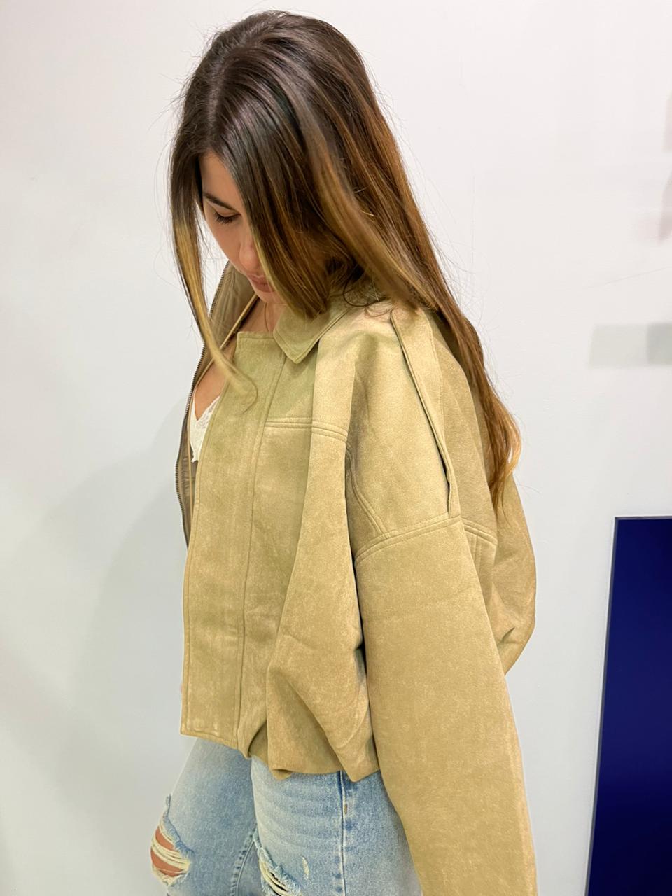Campera estilo bomber con forrería a tono. Confeccionada en tela gamuzada de textura suave y agradable al tacto, que aporta abrigo y un acabado sofisticado. Cuello solapa y manga larga con trabilla en hombro. Cierre frontal con cremallera y botones a presión ocultos por solapa. Bajo acabado con pliegues y volumen.