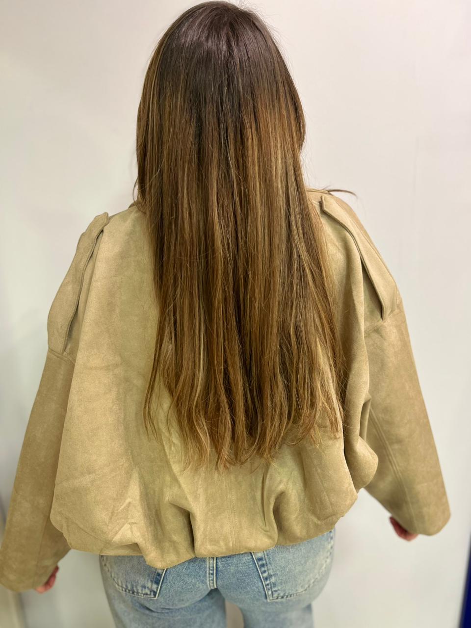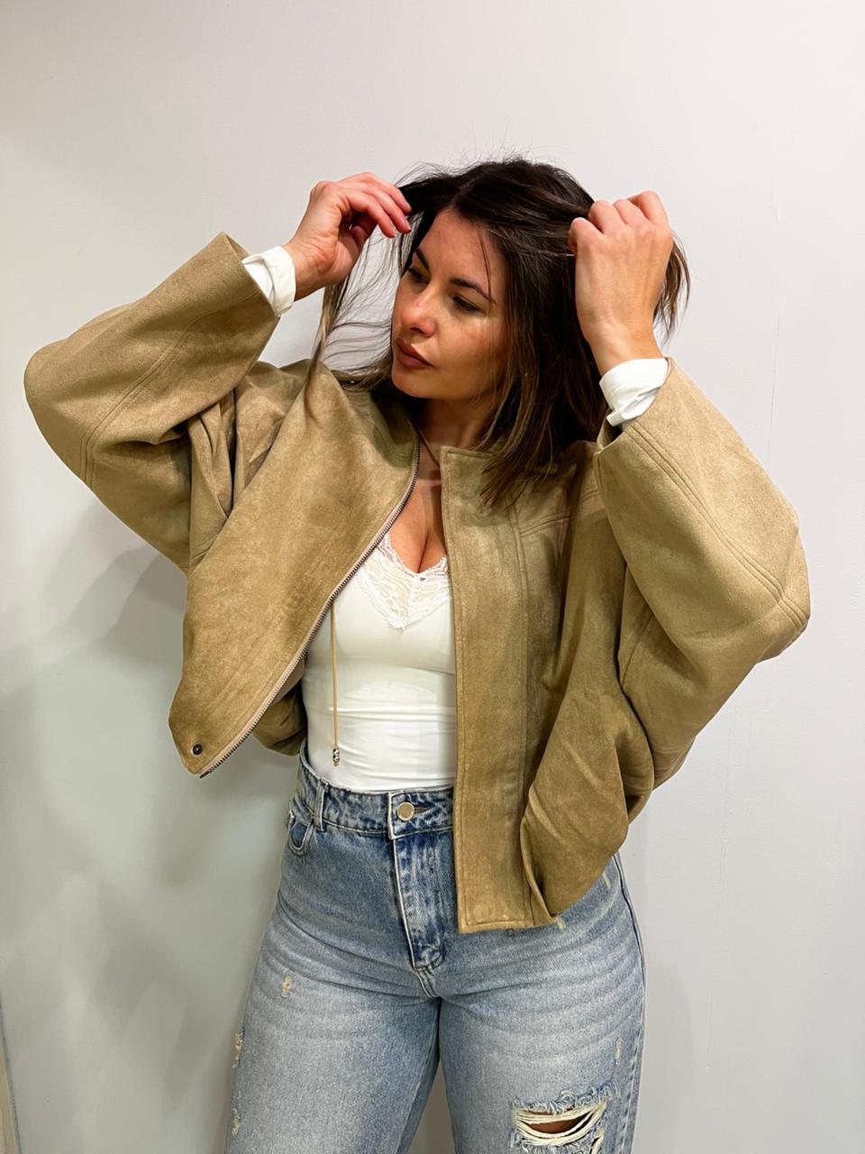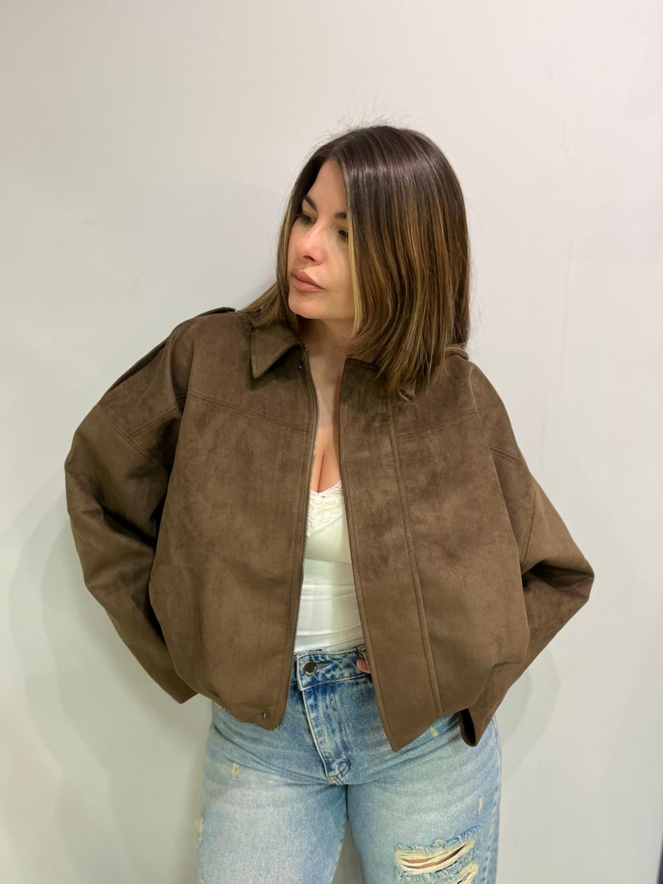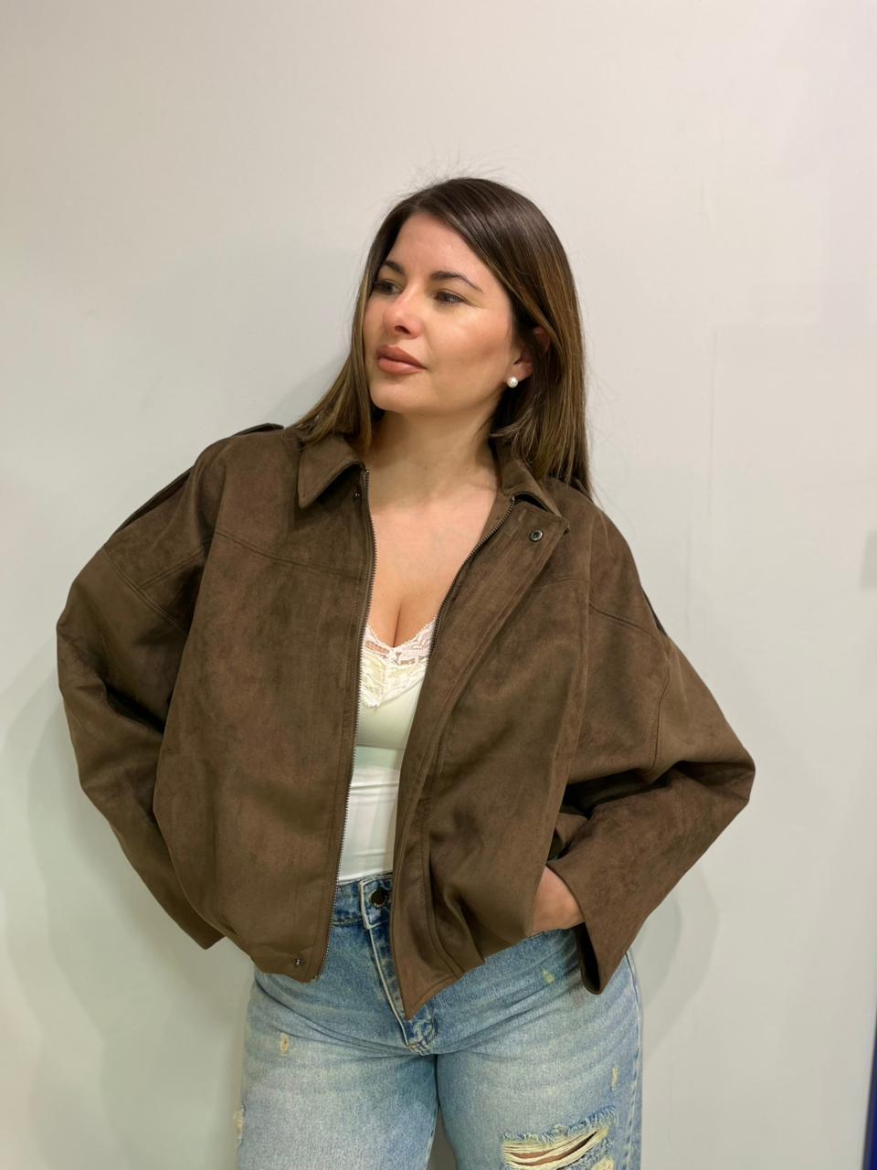 Campera estilo bomber con forrería a tono. Confeccionada en tela gamuzada de textura suave y agradable al tacto, que aporta abrigo y un acabado sofisticado. Cuello solapa y manga larga con trabilla en hombro. Cierre frontal con cremallera y botones a presión ocultos por solapa. Bajo acabado con pliegues y volumen.
