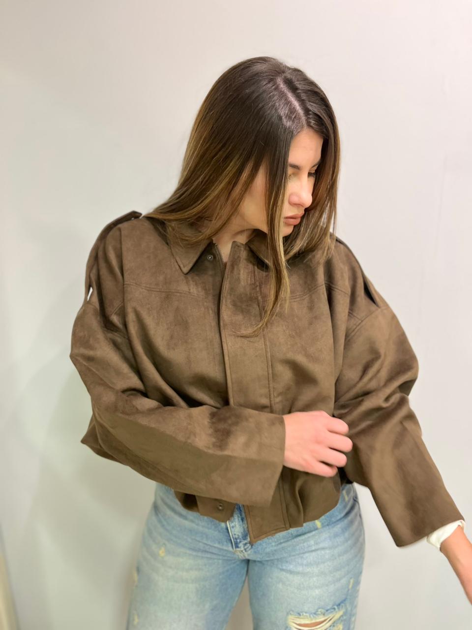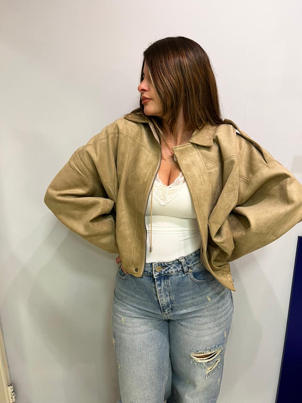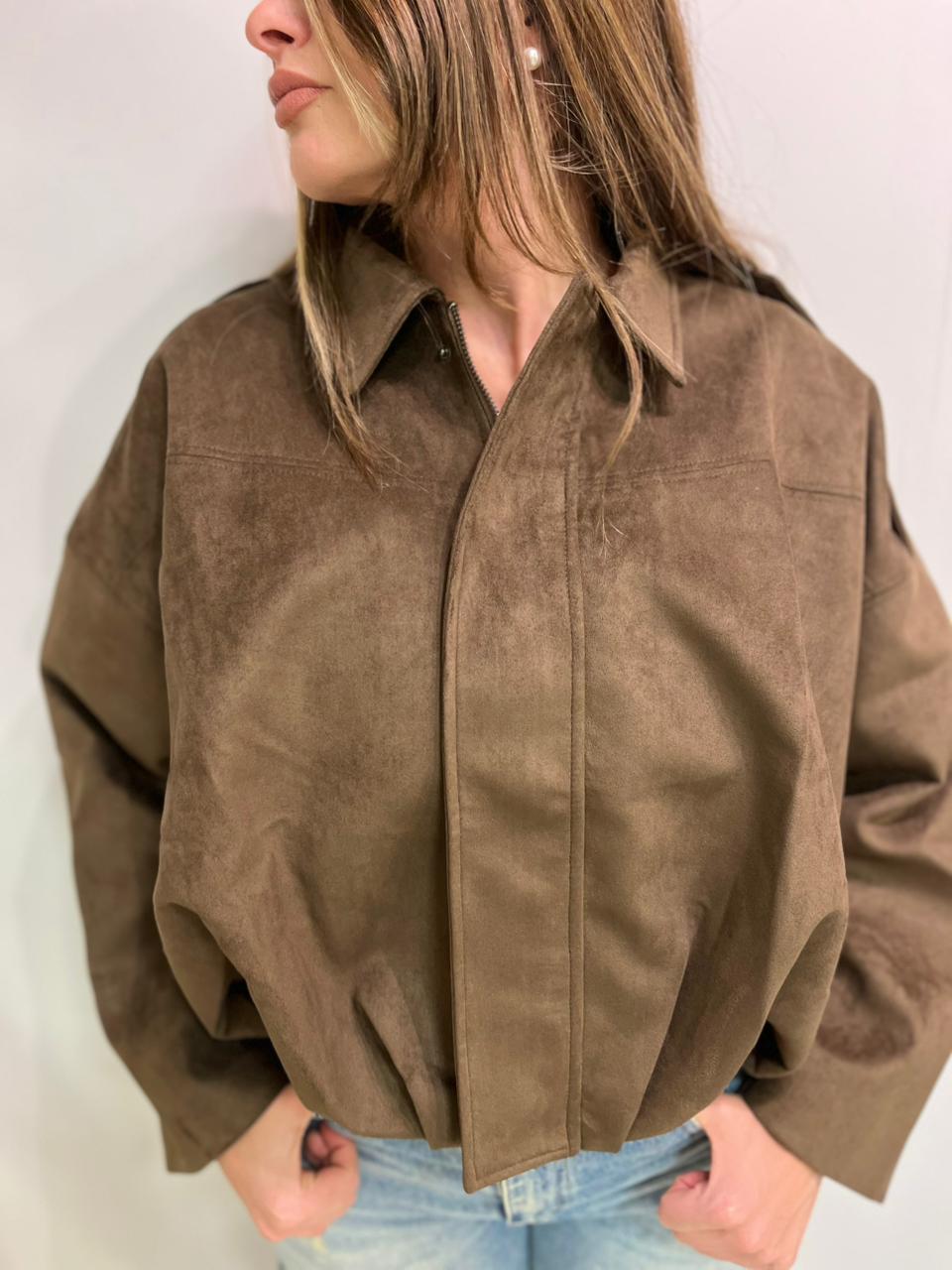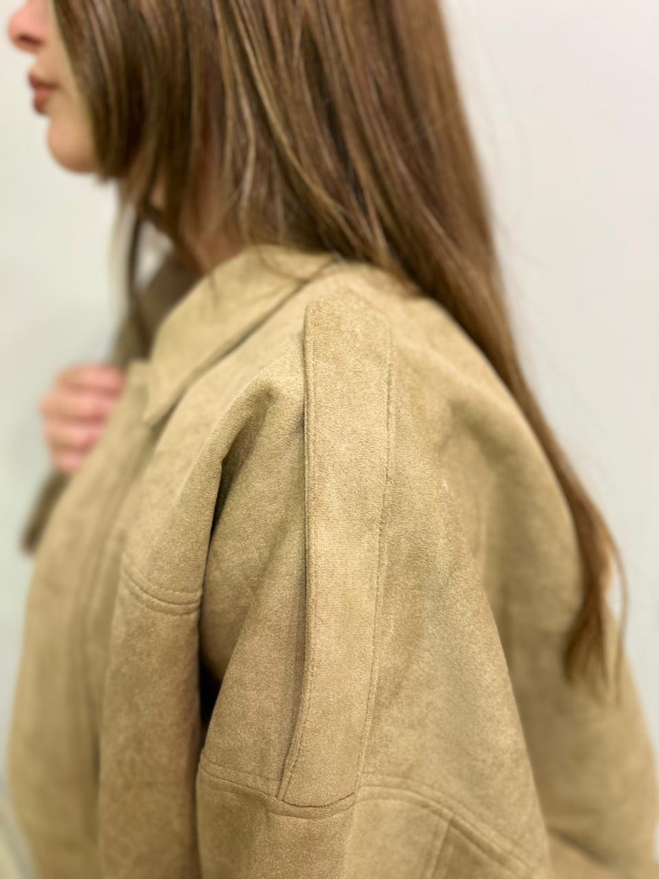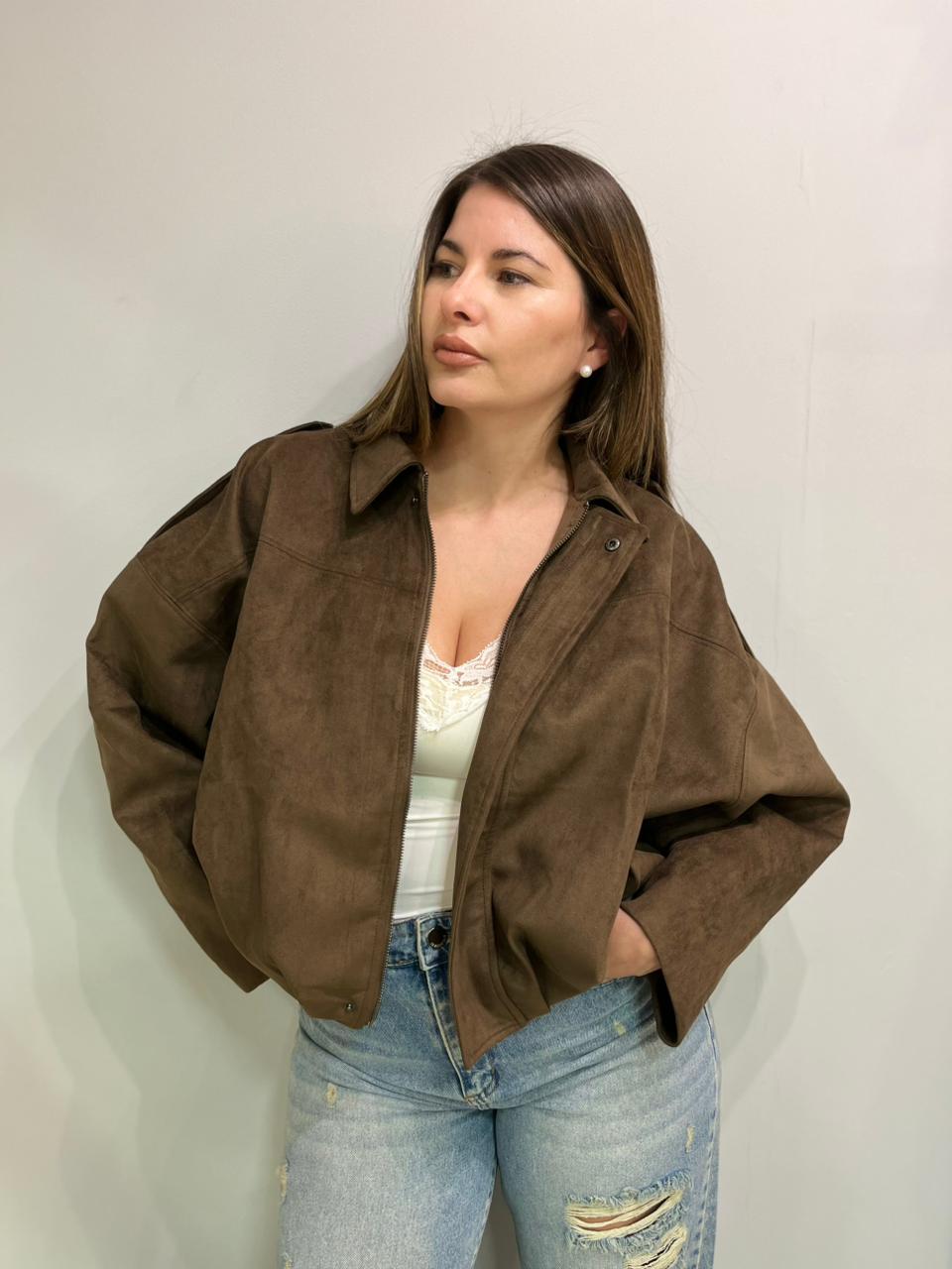 Campera estilo bomber con forrería a tono. Confeccionada en tela gamuzada de textura suave y agradable al tacto, que aporta abrigo y un acabado sofisticado. Cuello solapa y manga larga con trabilla en hombro. Cierre frontal con cremallera y botones a presión ocultos por solapa. Bajo acabado con pliegues y volumen.
