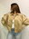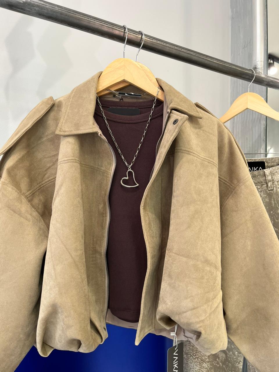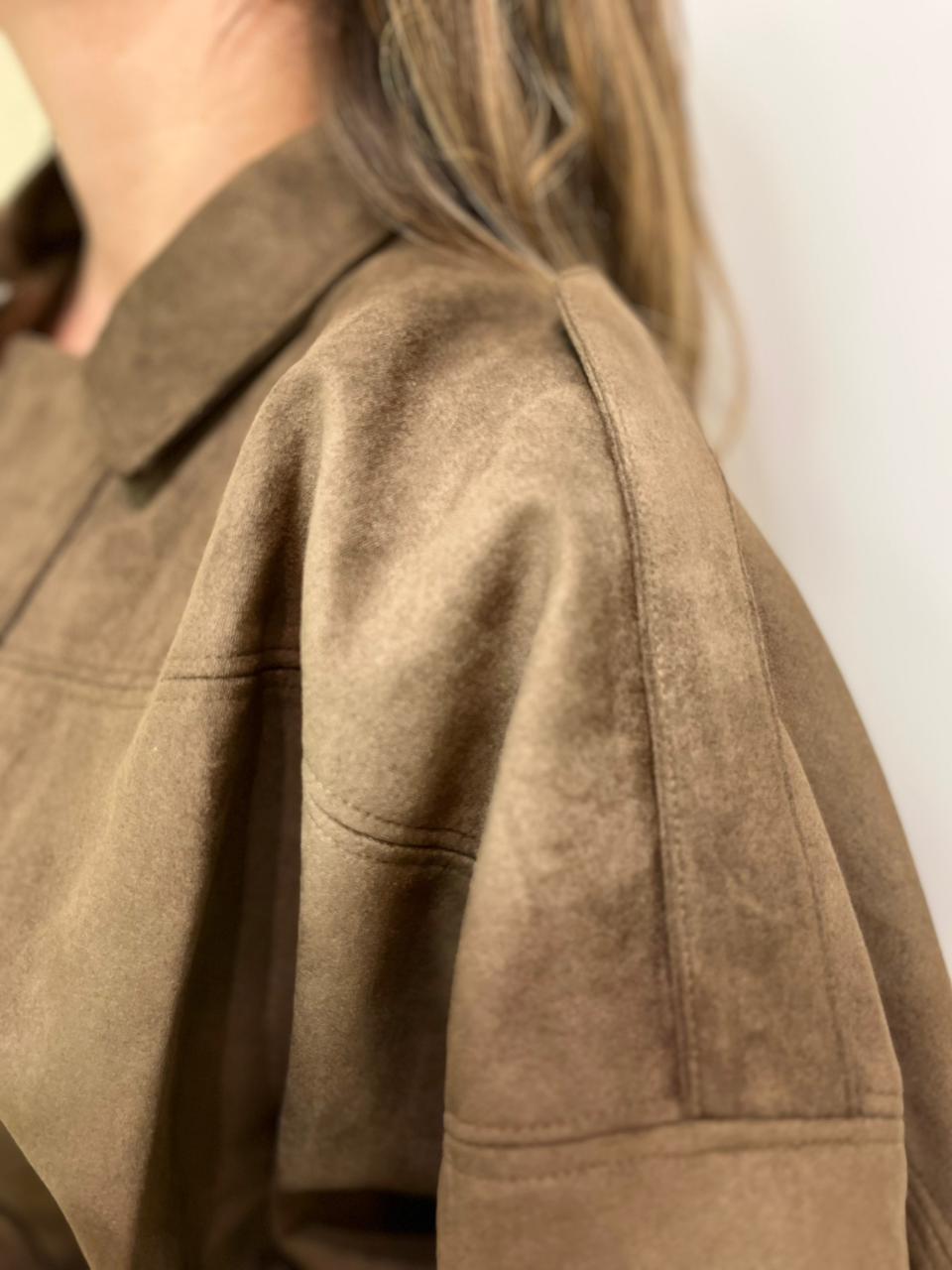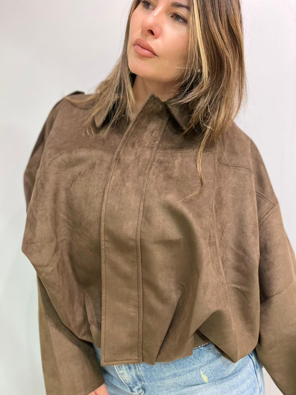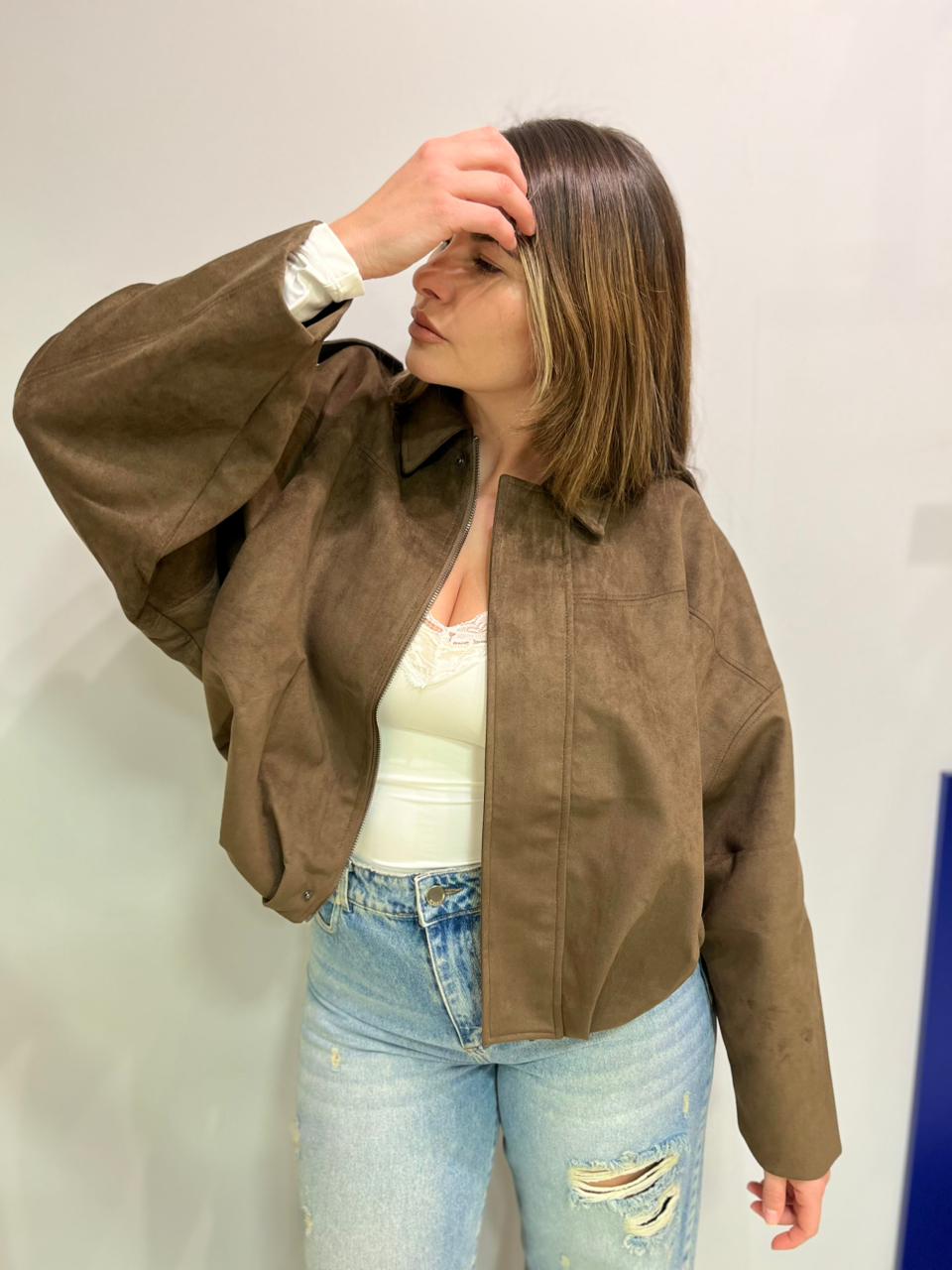 Campera estilo bomber con forrería a tono. Confeccionada en tela gamuzada de textura suave y agradable al tacto, que aporta abrigo y un acabado sofisticado. Cuello solapa y manga larga con trabilla en hombro. Cierre frontal con cremallera y botones a presión ocultos por solapa. Bajo acabado con pliegues y volumen.