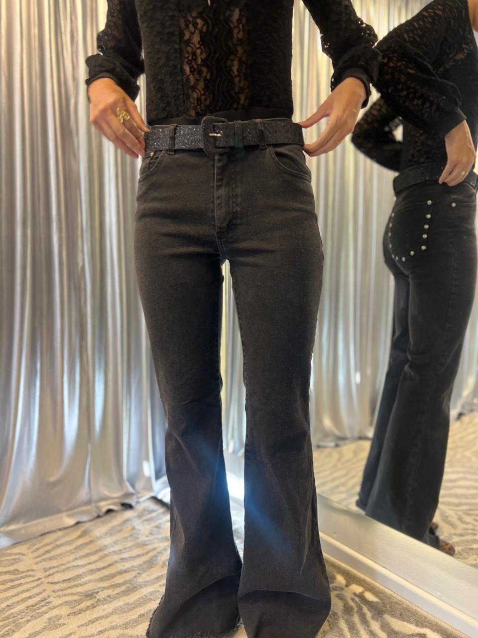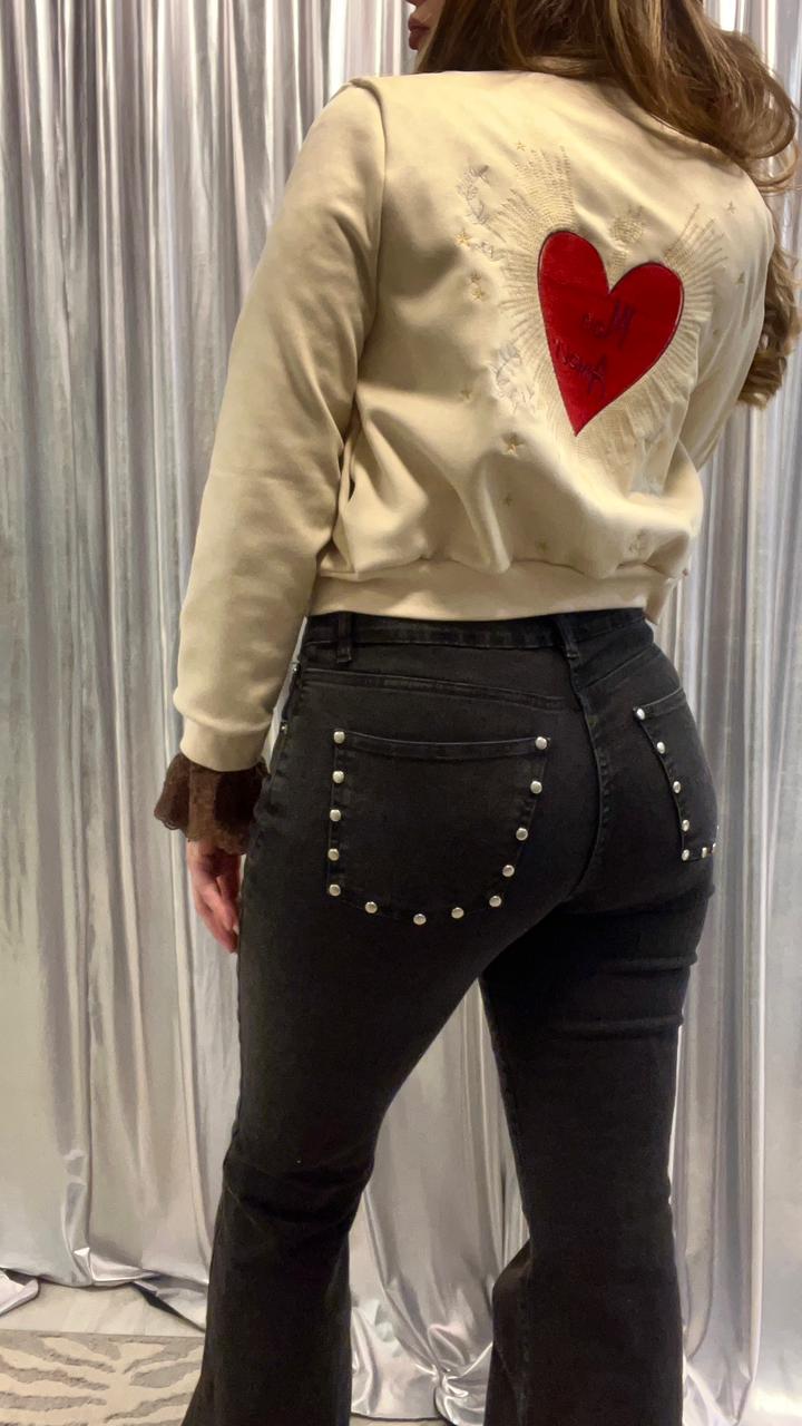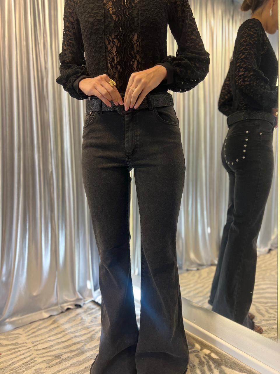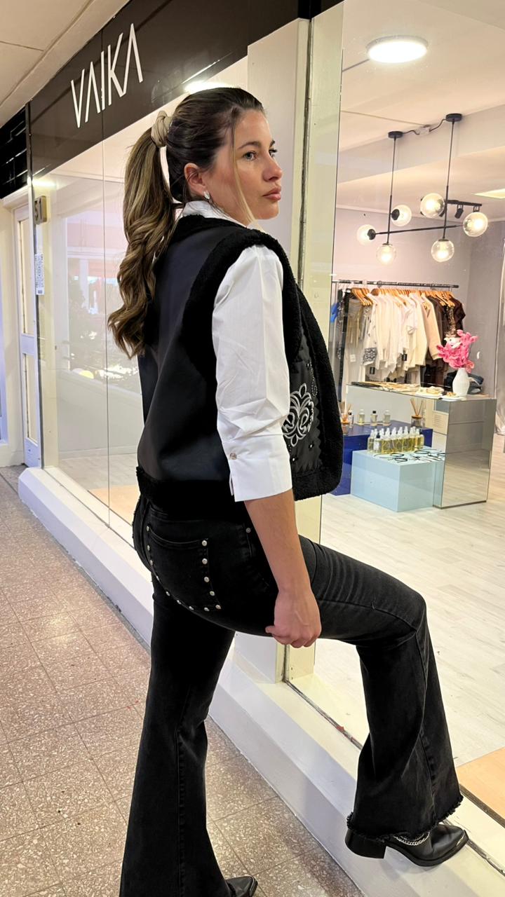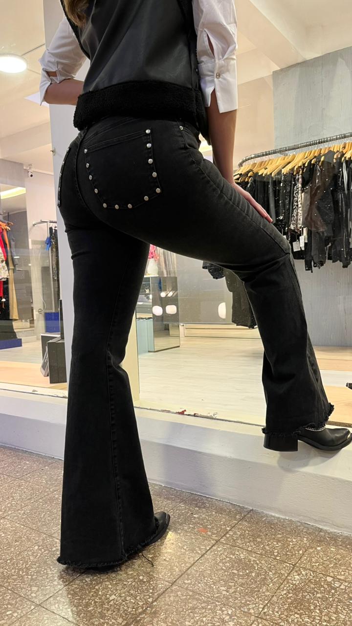 Pantalónde mujer oxford elastizado tiro alto bota con fleco. Tachas en los bolsillos traseros.Caidad SUPER PREMIUM