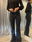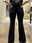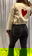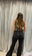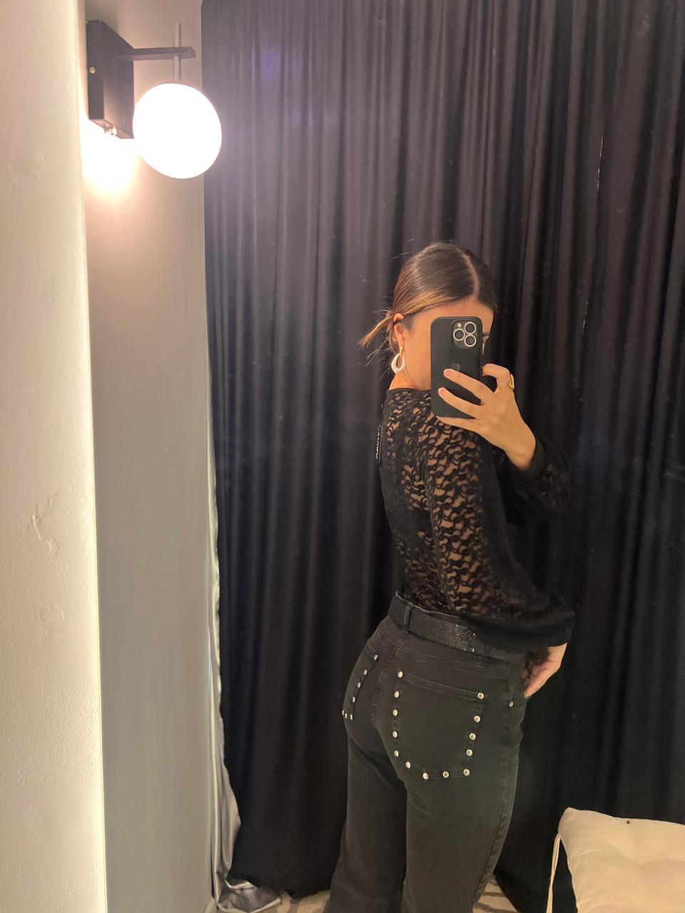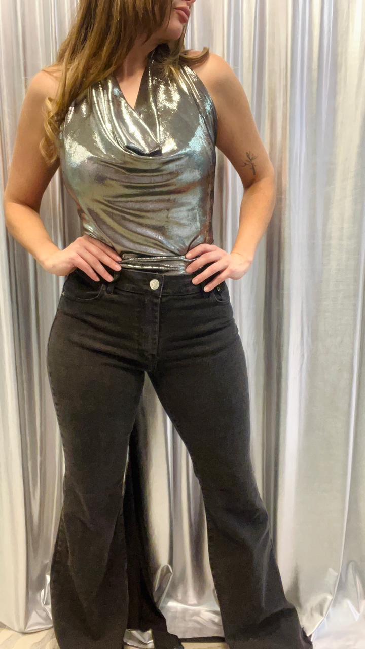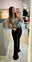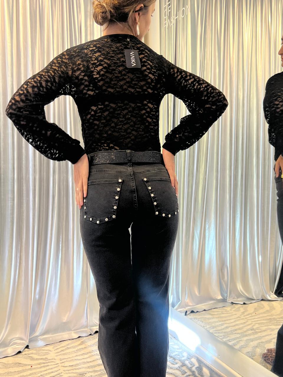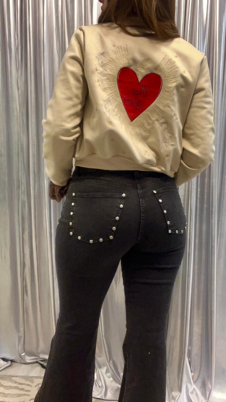 Pantalónde mujer oxford elastizado tiro alto bota con fleco. Tachas en los bolsillos traseros.Caidad SUPER PREMIUM