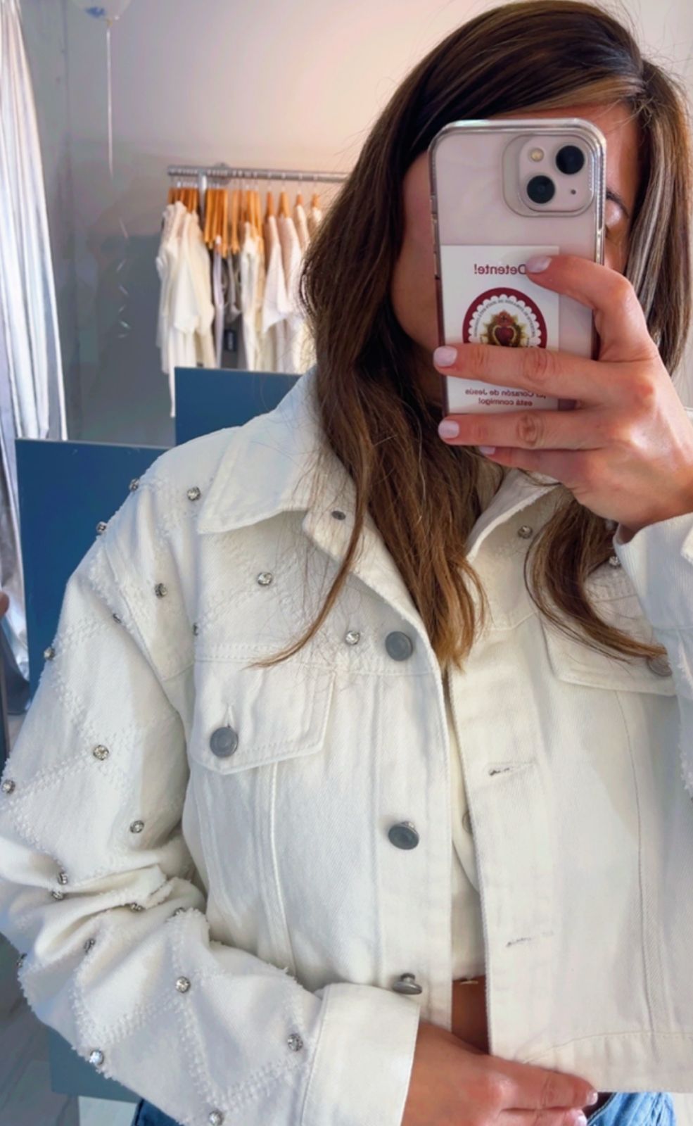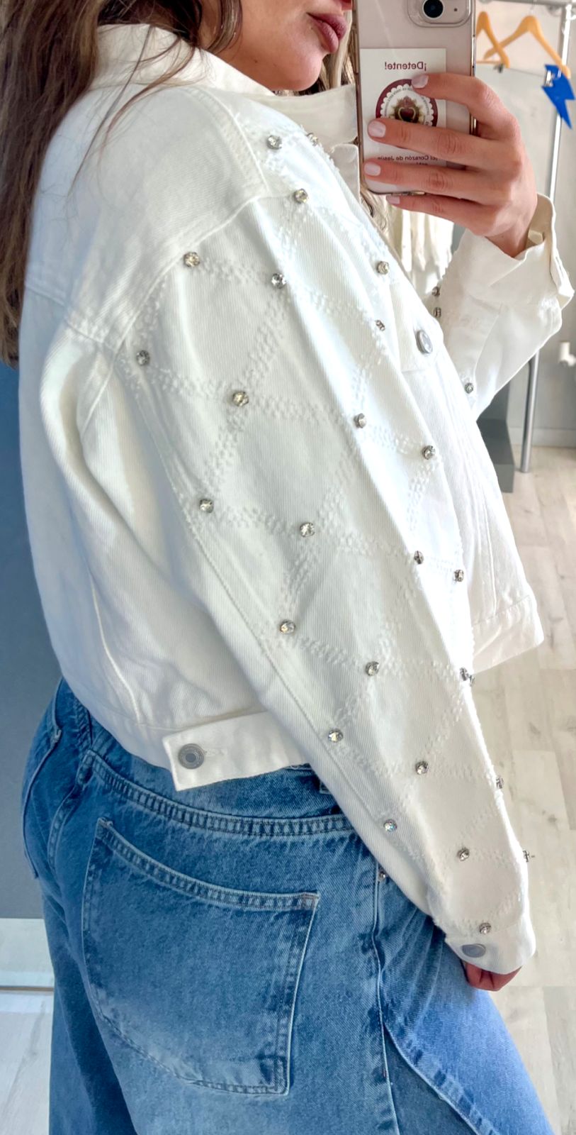 CHAQUETA 97% ALGODÓN, 3% POLIESTER CON DETALLE DE PIEDRAS EN EL FRENTE Y MANGAS. CIERRE FRONTAL CON BOTONES PLATEADOS.