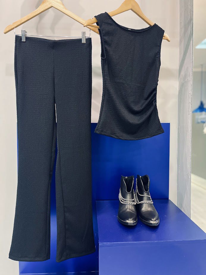 Pantalón recto de tiro medio con elástico interno en cintura.
