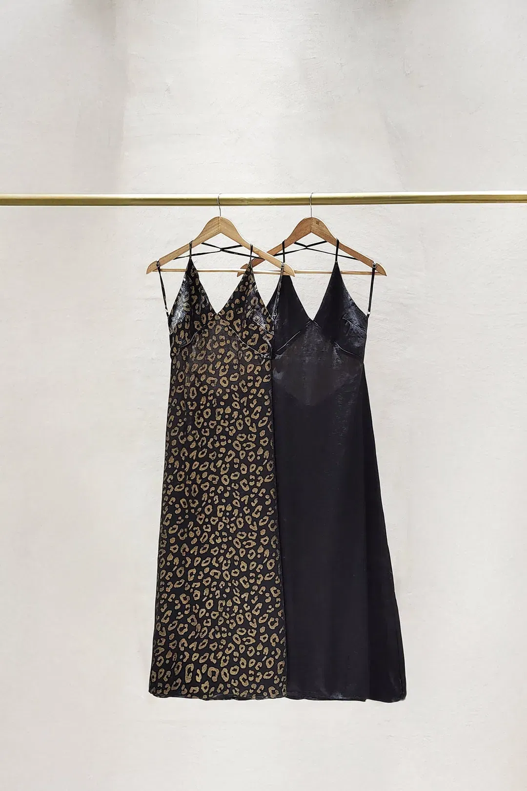 Vestido de mujer animal print en sedita con estampada foil de calce evasé.