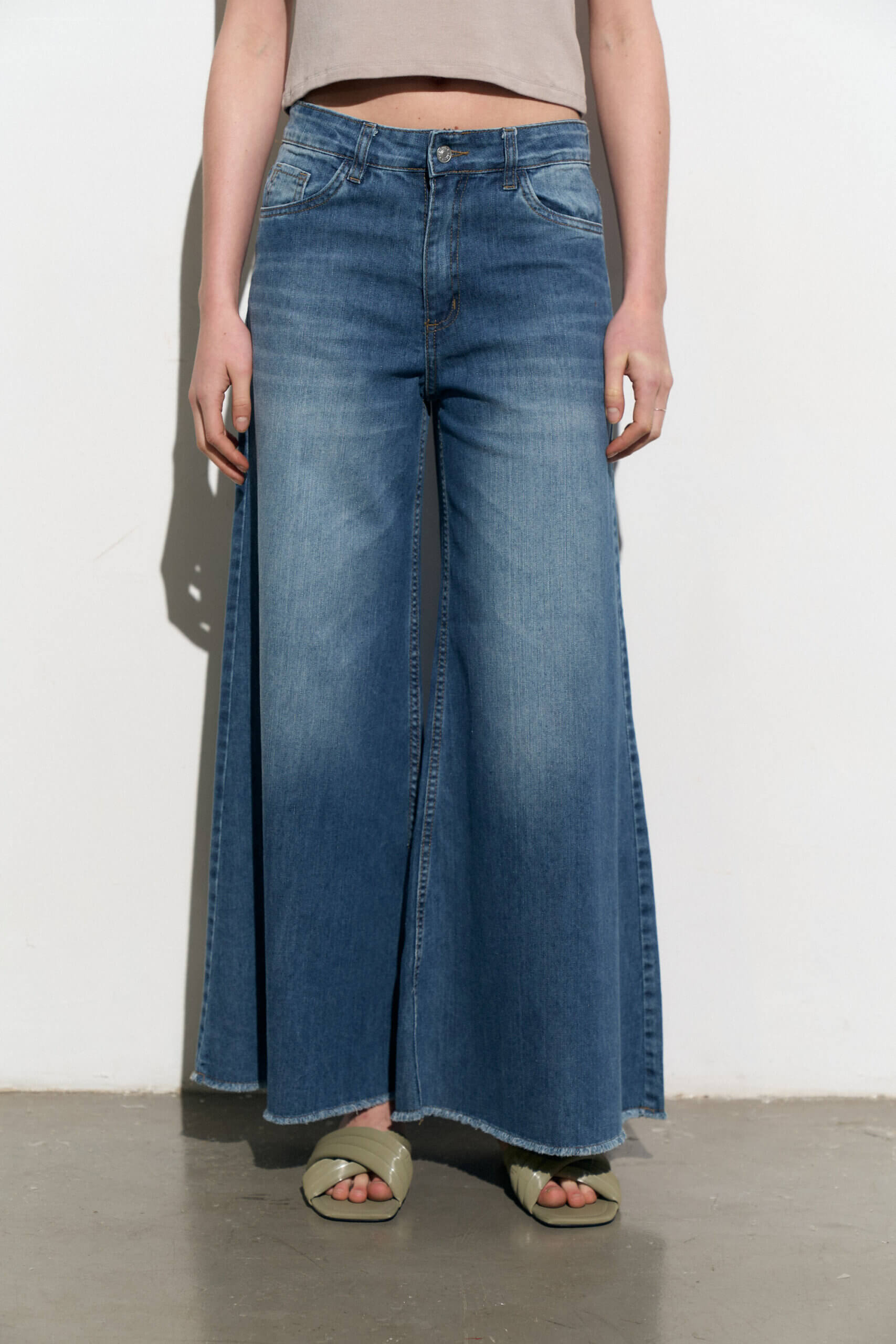Jean palazzo elastizado tiro medio, 5 bolsillos con ruedo al corte.