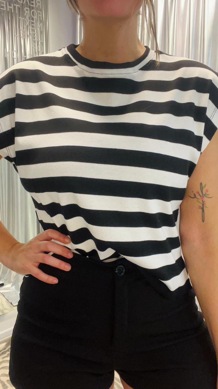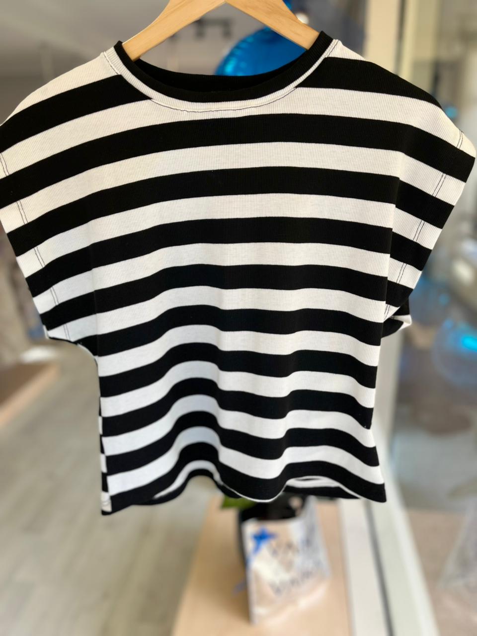 Remera amplia de morley con estampa a rayas, escorte redondo y manga japonesa.