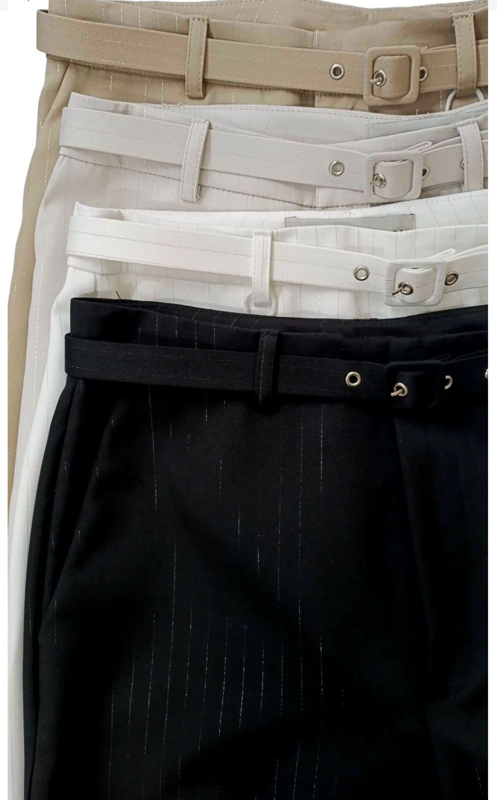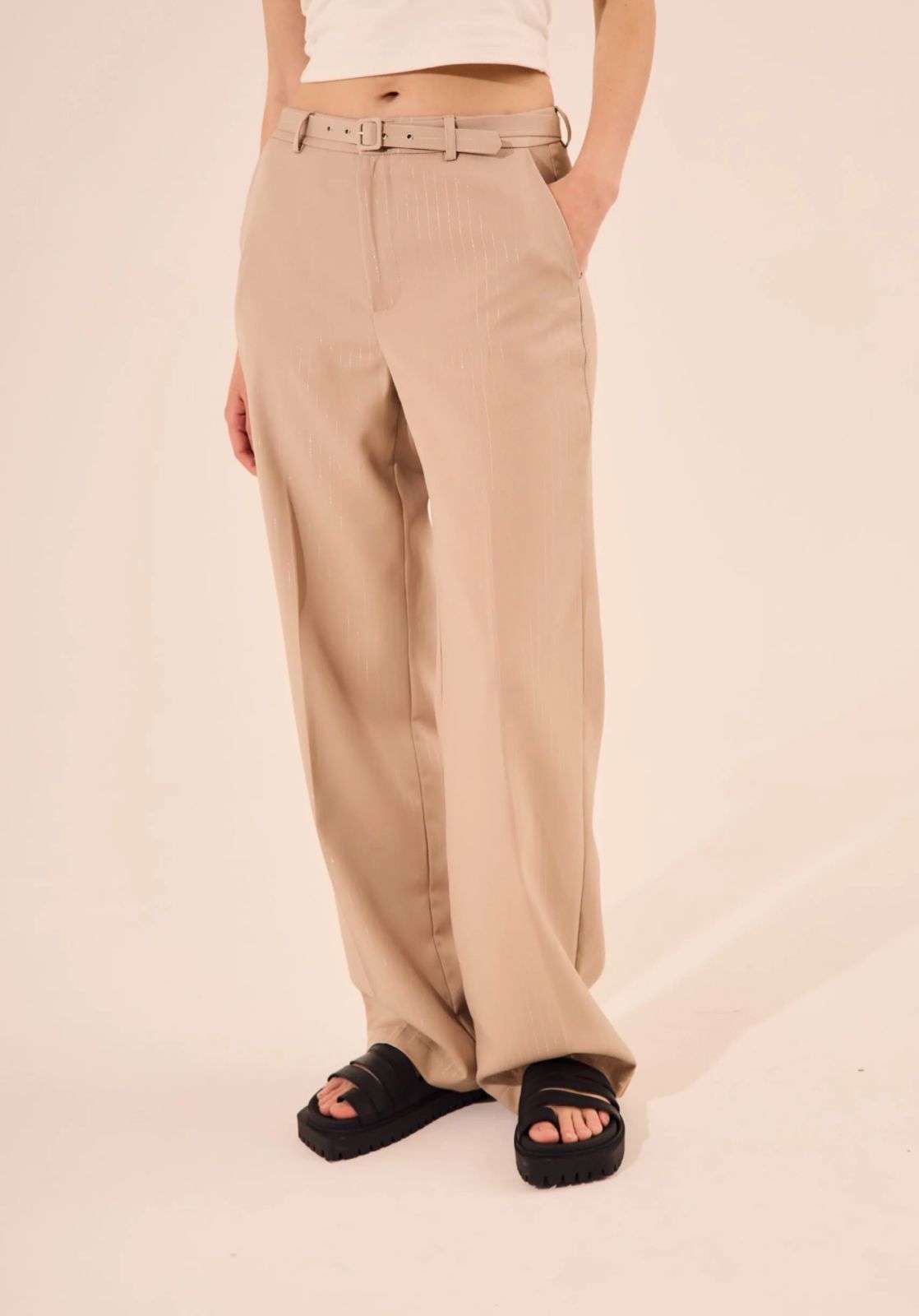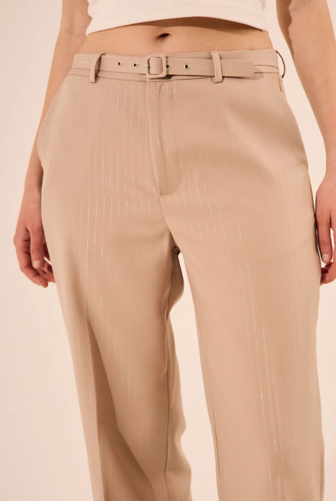 Pantalon sastrero con cinto. Tela con lineas de lurex.