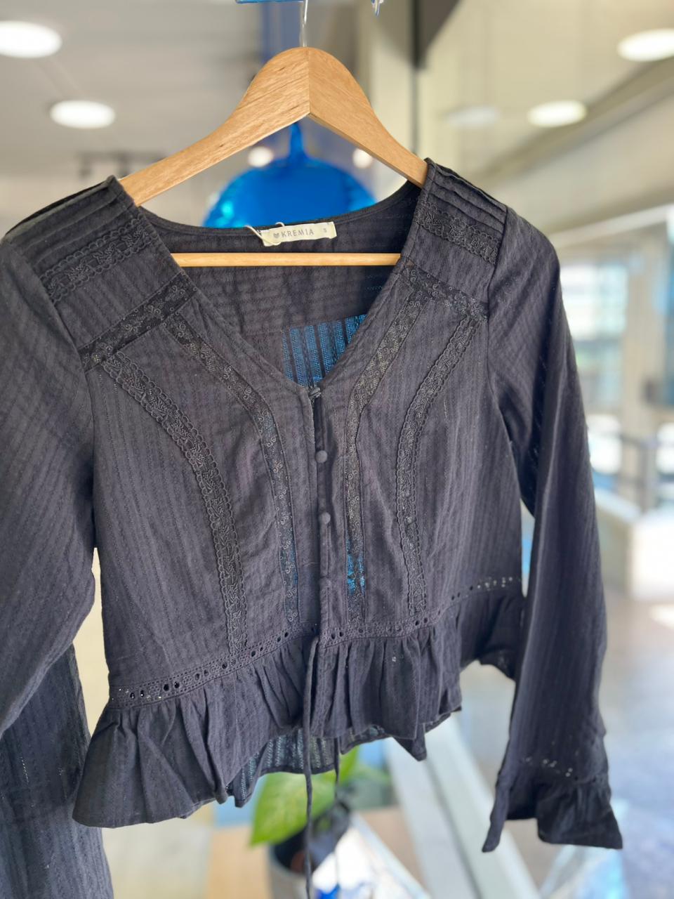 BLUSA 100% ALGODÓN. ESCOTE EN V. DETALLE DE PUNTILLA Y TABLAS EN FRENTE Y MANGAS. CIERRE FRONTAL CON BOTONES Y LAZOS. BAJO Y PUÑOS CON VOLADOS.
