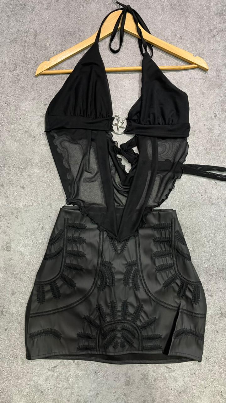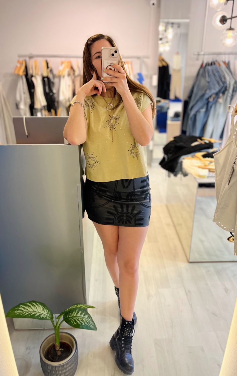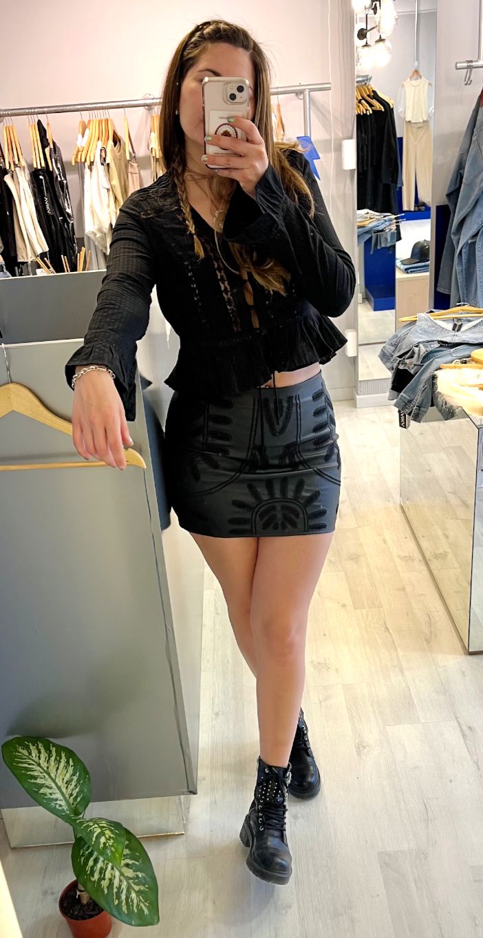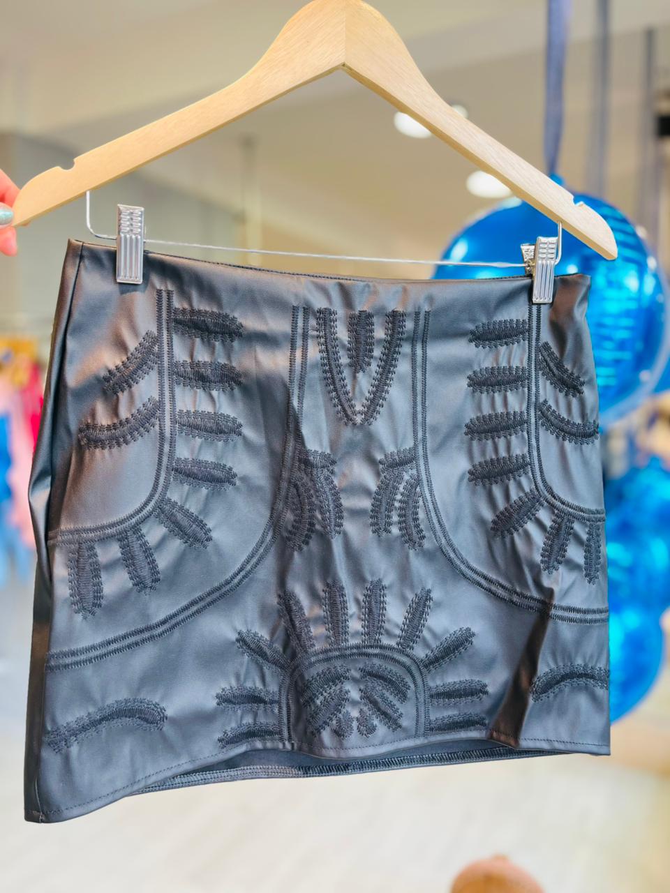 Mini de cuero ecologico, bordada en la parte de adelante.