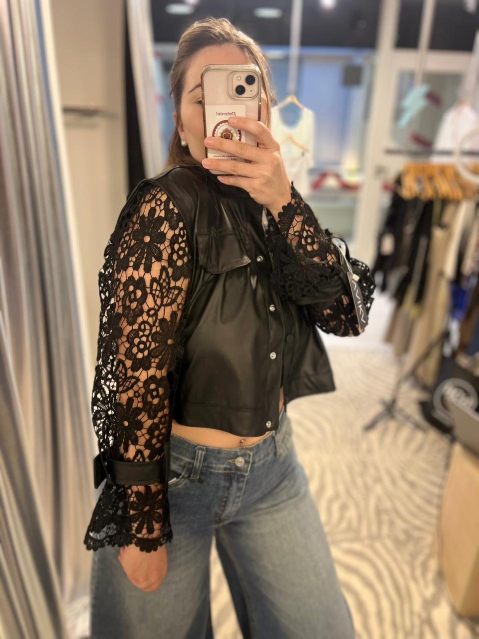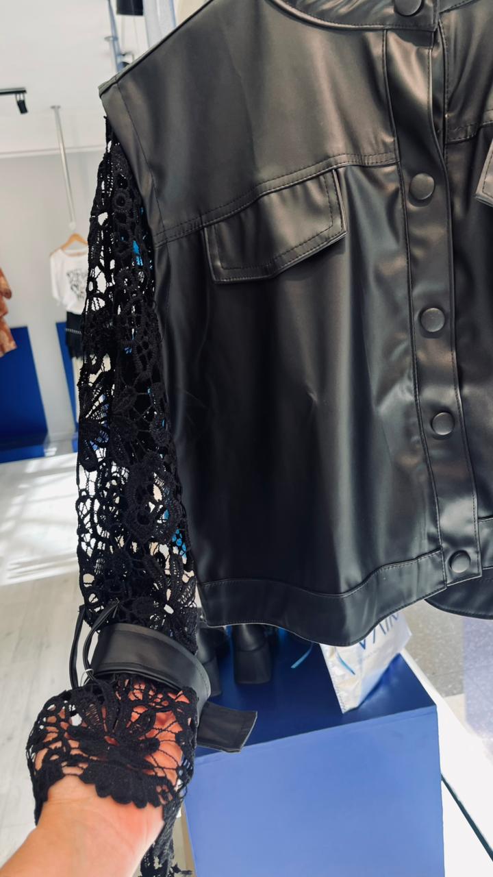 Campera de cuero Ecologico con mangas de encaje.