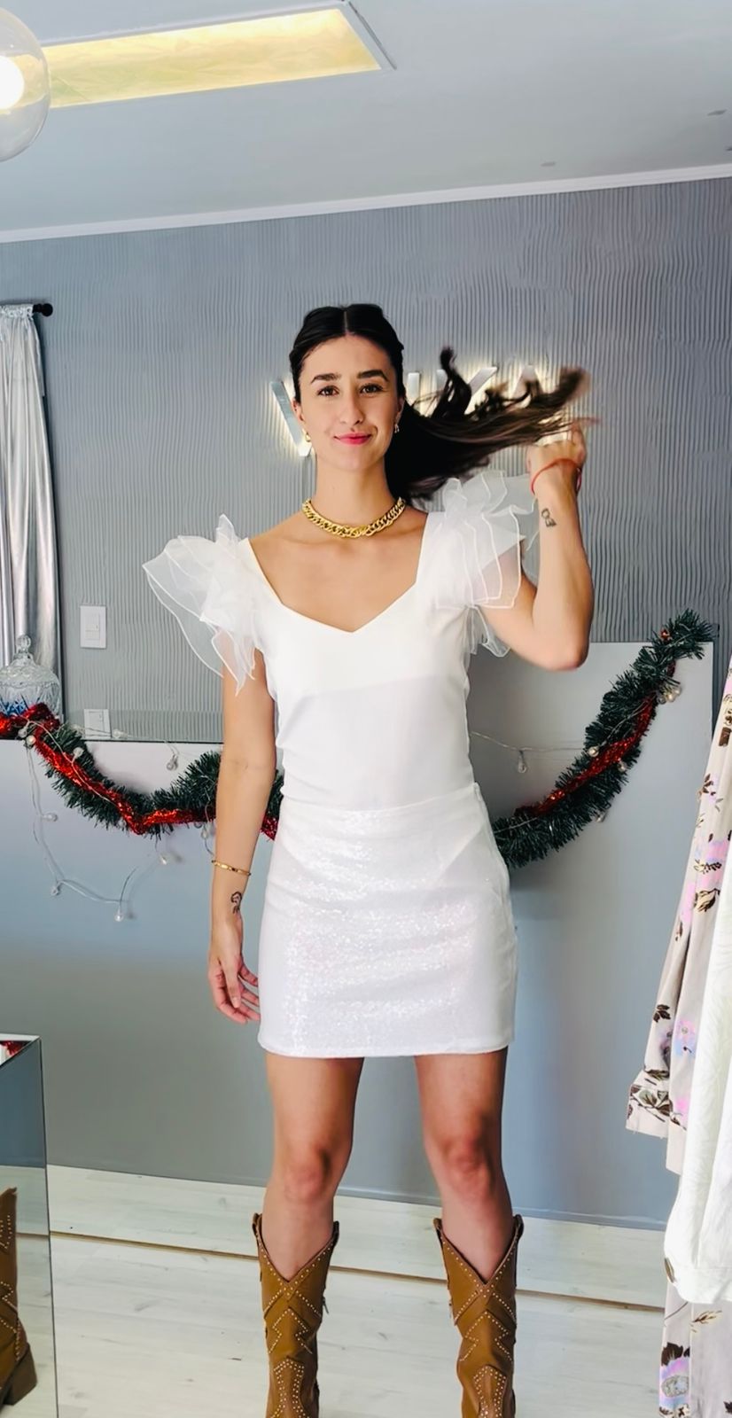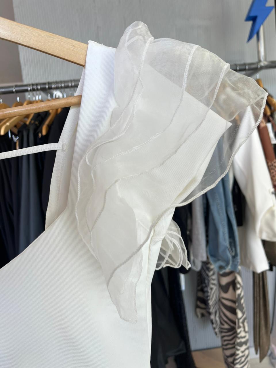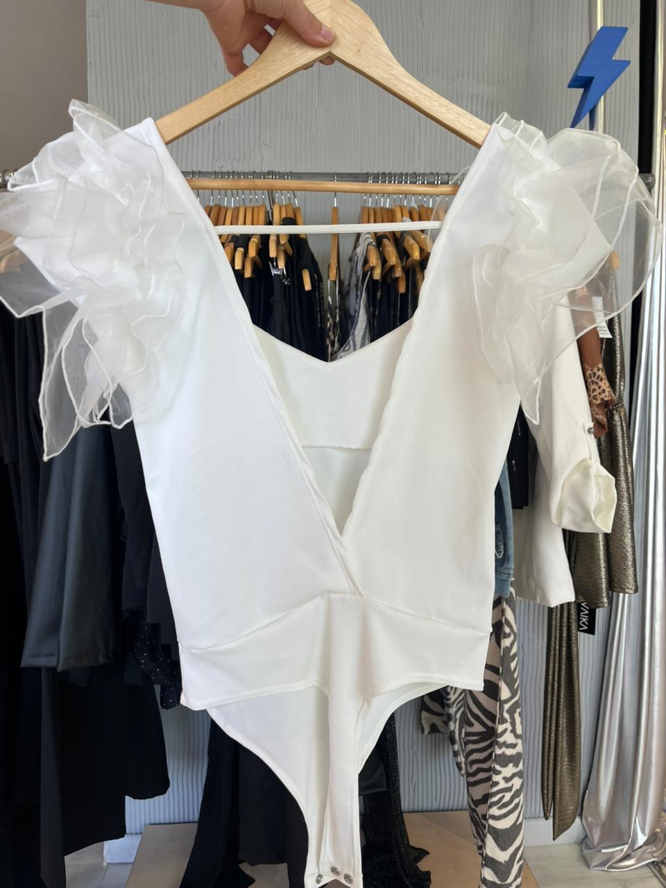 Body elastizado, espalda descubierta con mangas de volados de gasa.