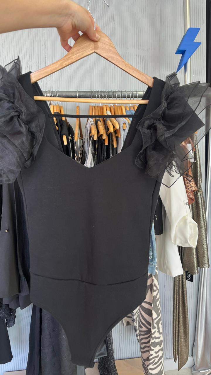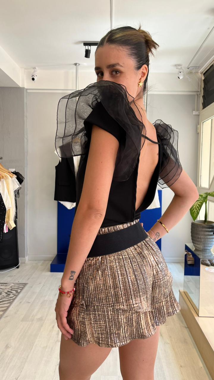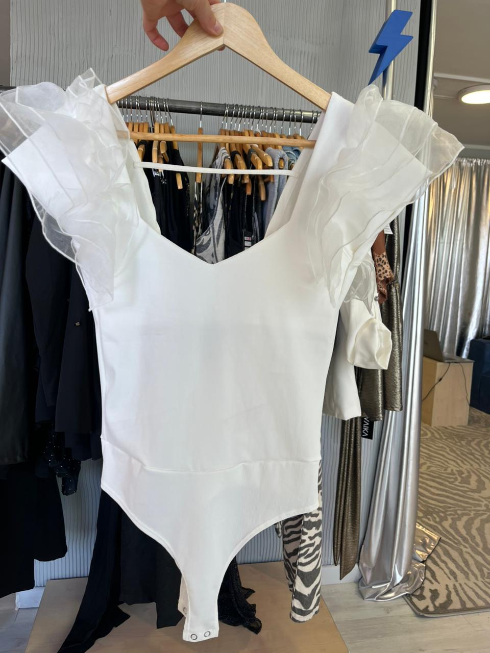 Body elastizado, espalda descubierta con mangas de volados de gasa.