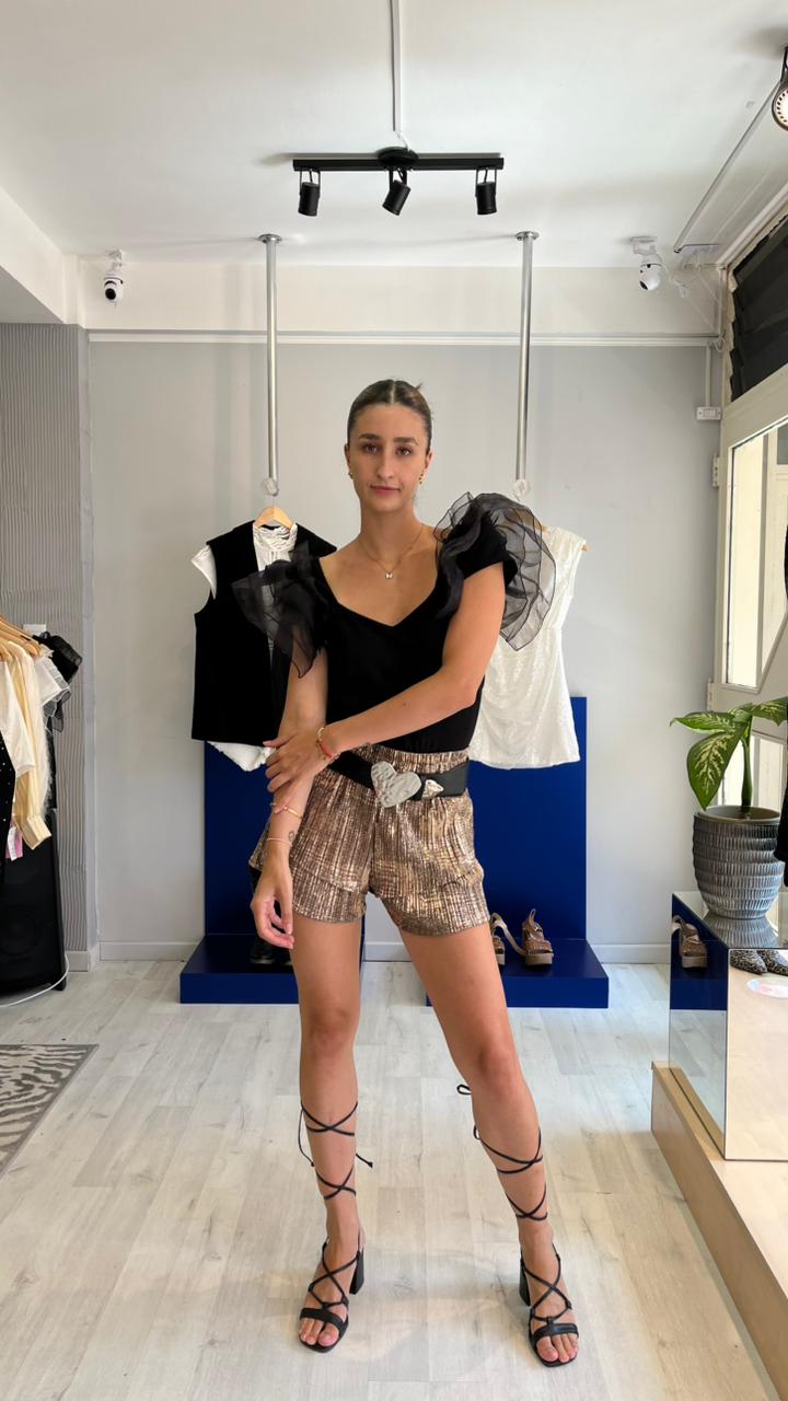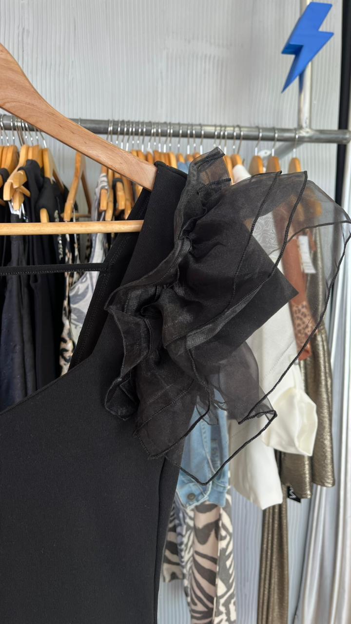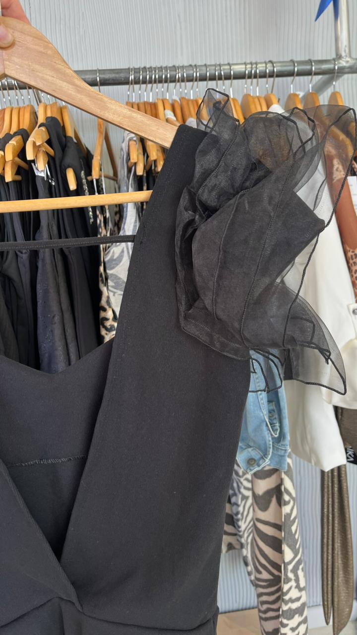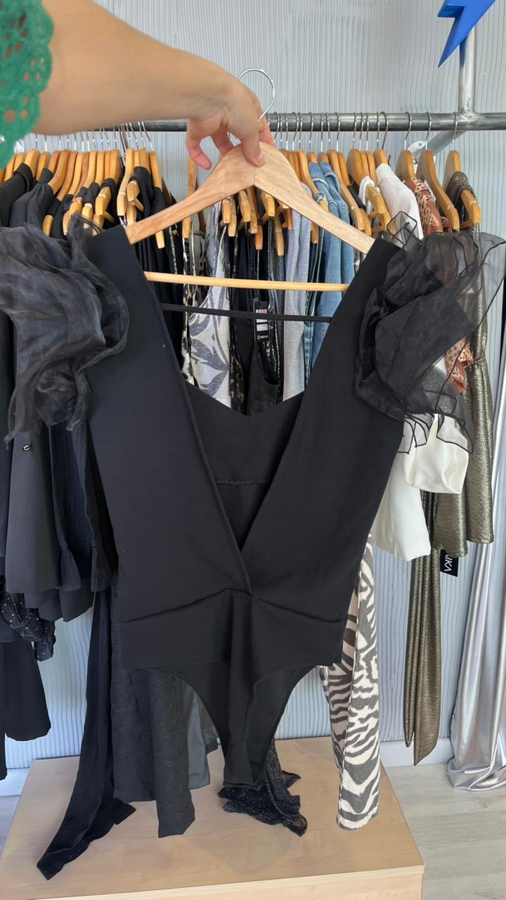Body elastizado, espalda descubierta con mangas de volados de gasa.