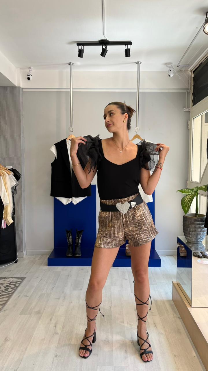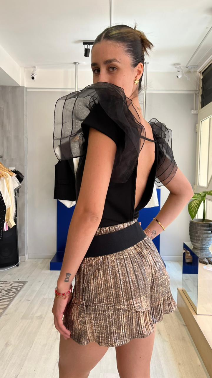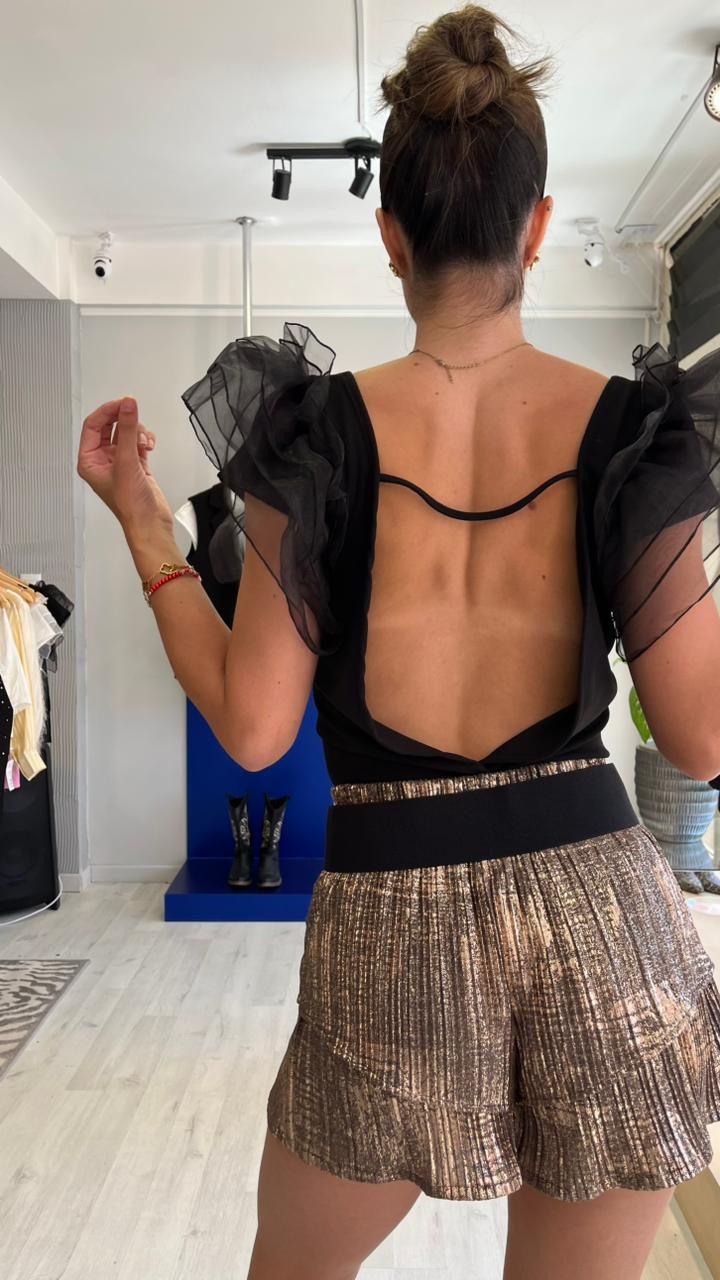 Body elastizado, espalda descubierta con mangas de volados de gasa.