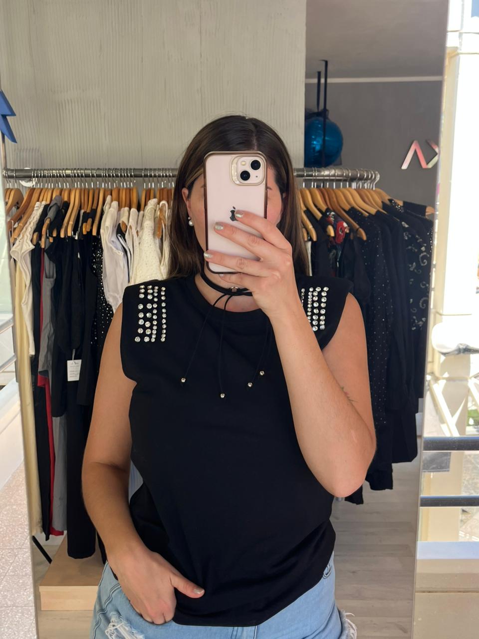 REMERA SIN MANGAS 95% ALGODON, 5% SPANDEX. CON HOMBRERAS. DETALLE DE PIEDRAS EN HOMBROS.