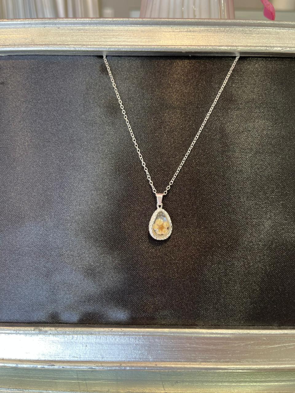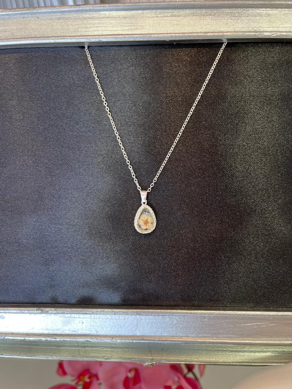 Cadena de acero blanco y dije de bronce bañado en metales blancos.