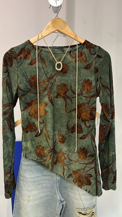 Remera de mujer de calce adherente con largo modular asimétrico.Estampa gamuzada.Ultima disponible en talle M