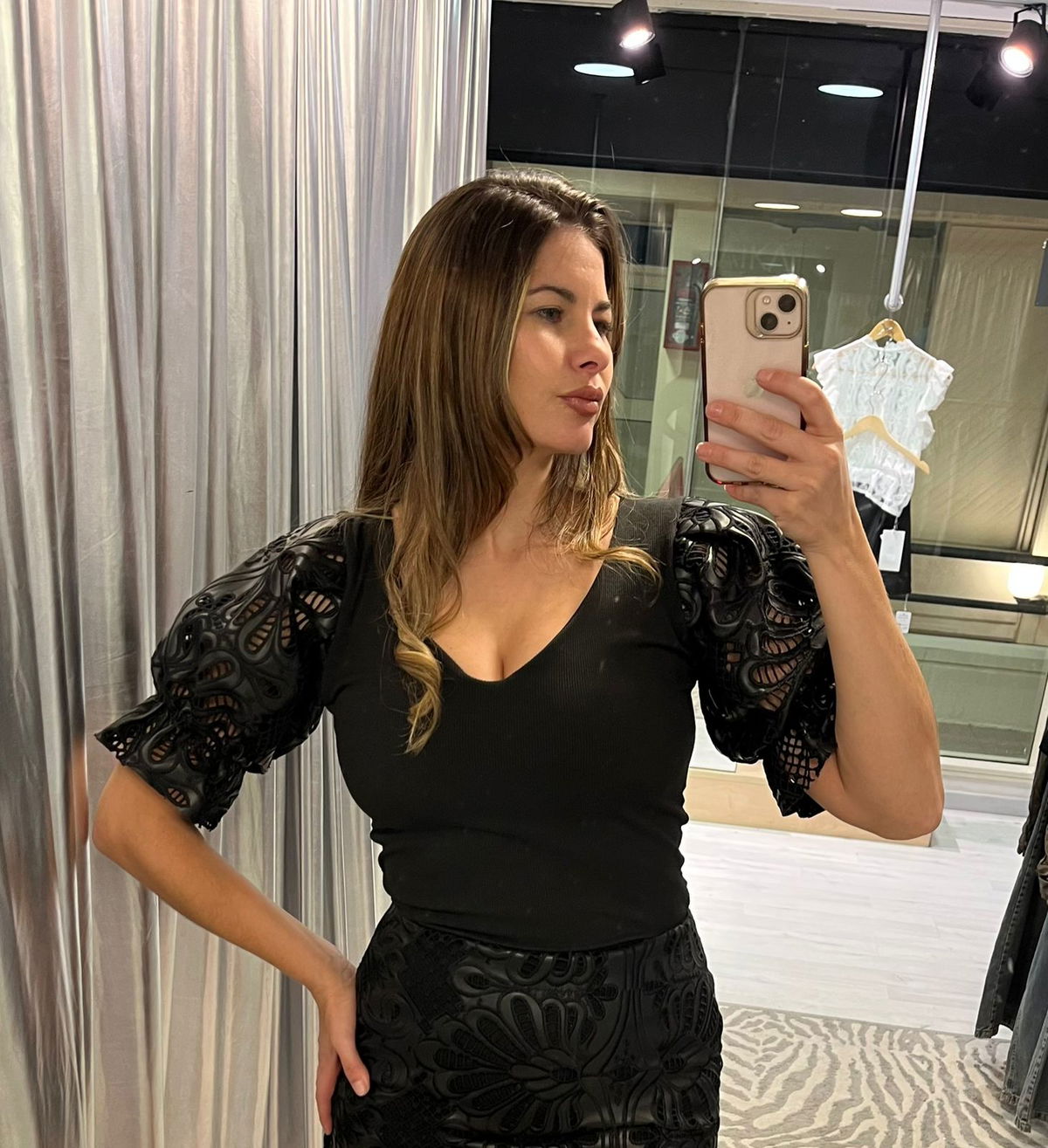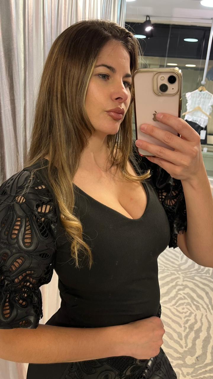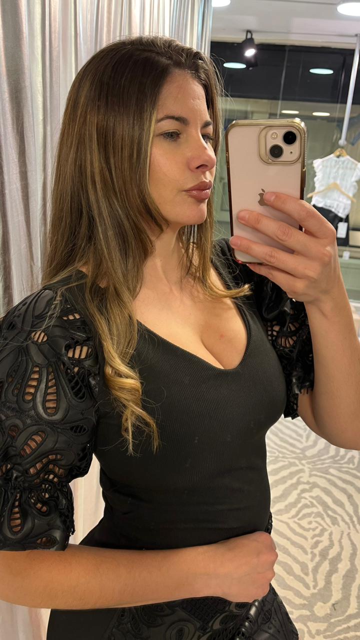 Remera de morley (elastizada) con escote en v y mangas princesas de cuero bordado