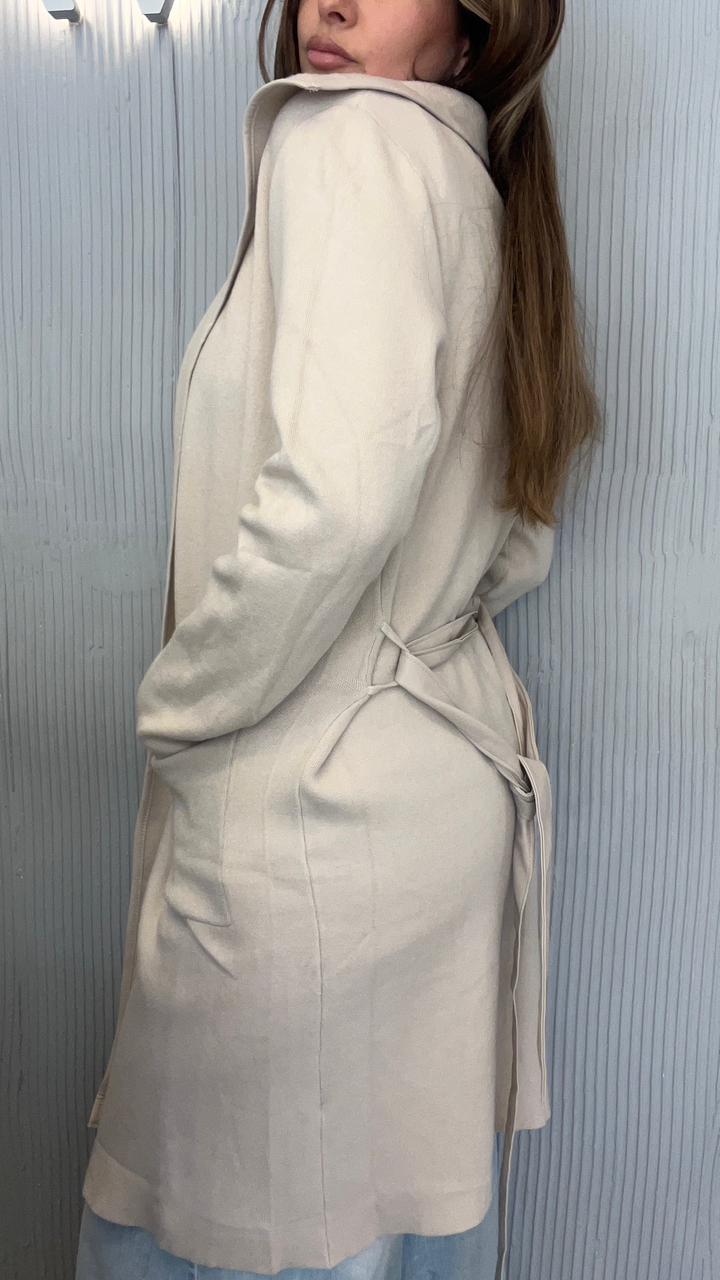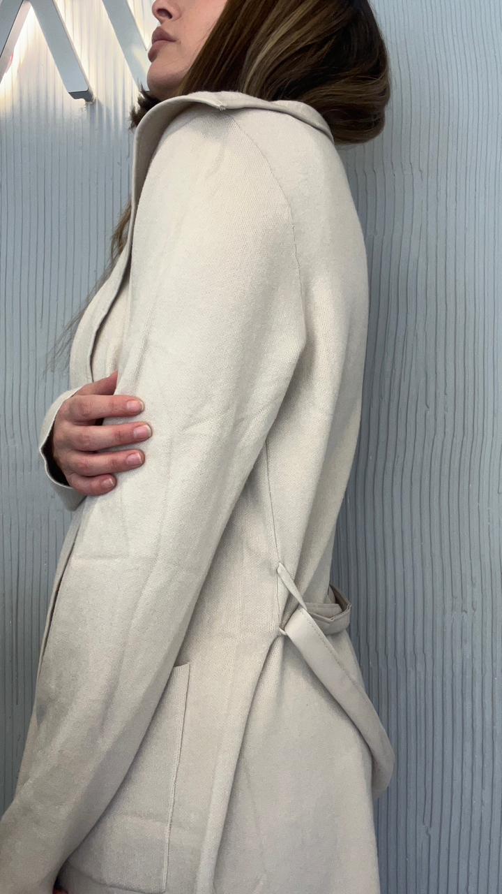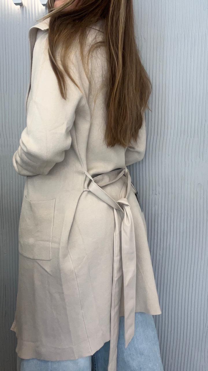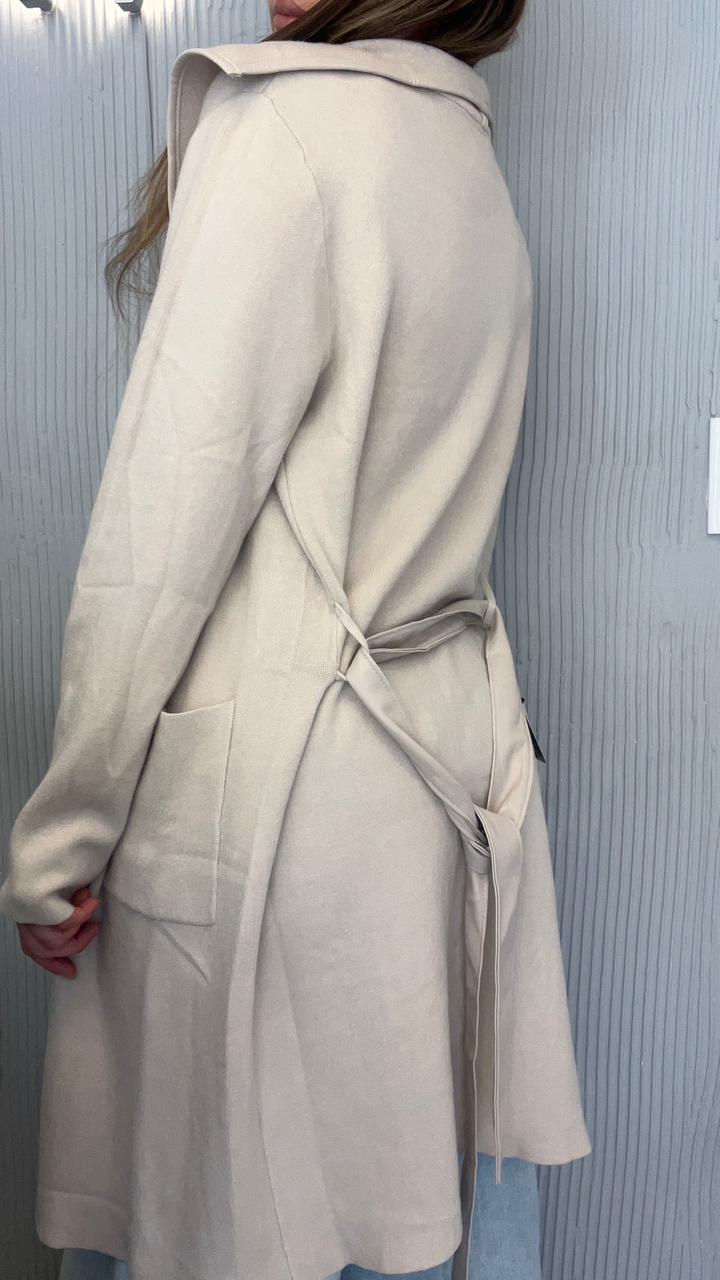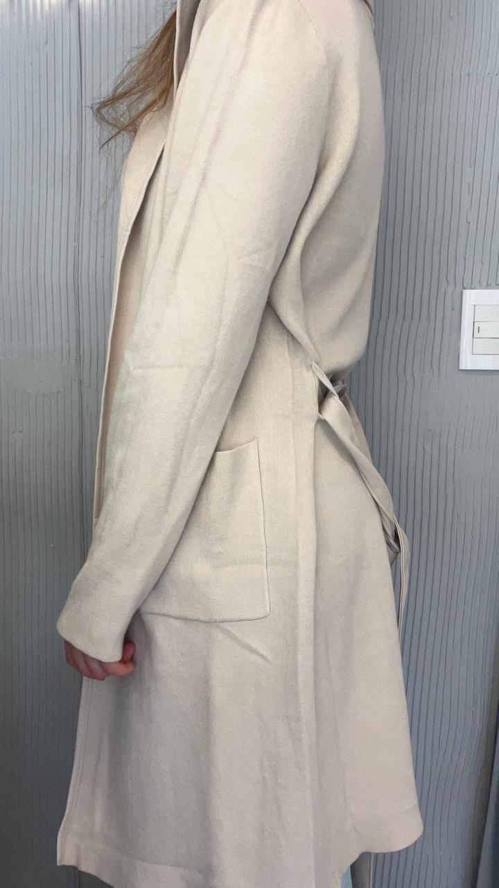 SACO LARGO DE BREMER 50% VISCOSA, 28% POLIESTER, 22% NAILON. CUELLO CON SOLAPA. DOS BOLSILLOS DELANTEROS. DETALLE DE VIVO DE CUERINA EN EL FRENTE. CON CINTO DE CUERINA.