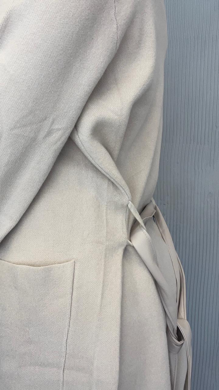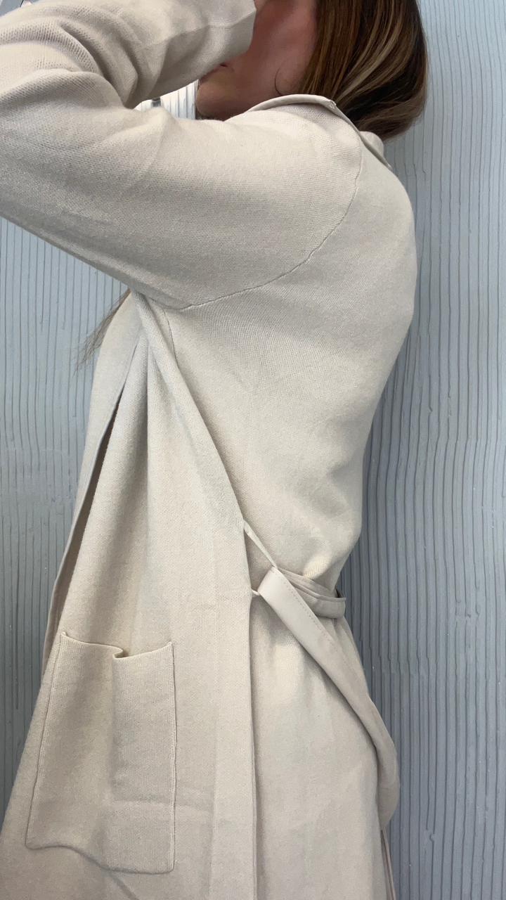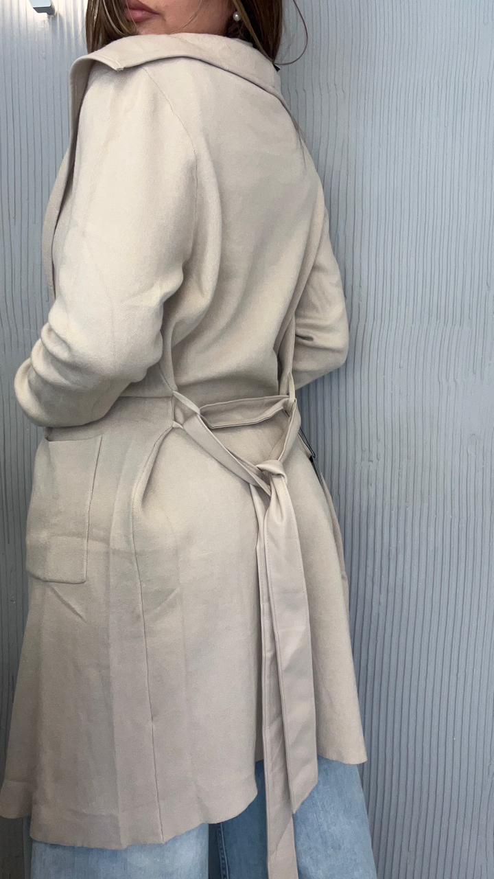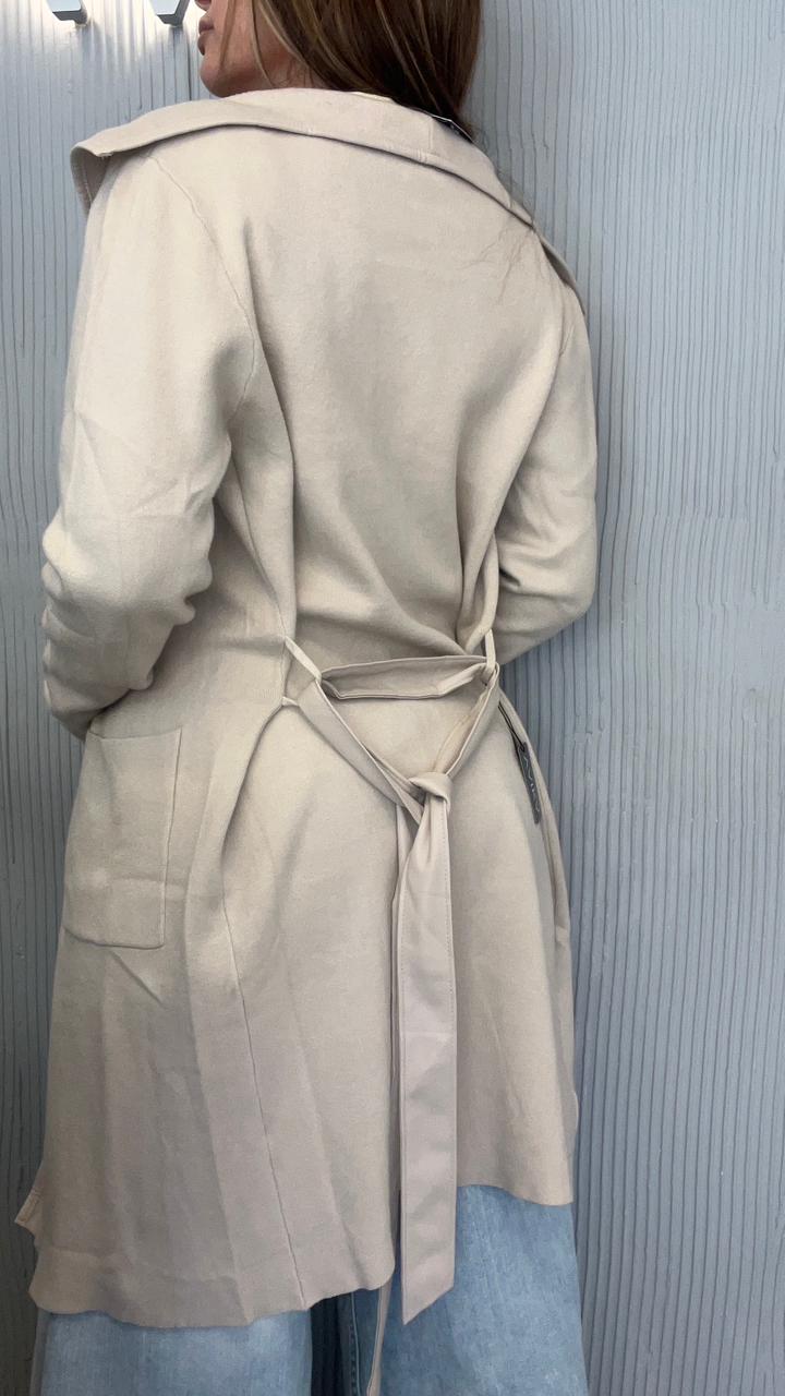 SACO LARGO DE BREMER 50% VISCOSA, 28% POLIESTER, 22% NAILON. CUELLO CON SOLAPA. DOS BOLSILLOS DELANTEROS. DETALLE DE VIVO DE CUERINA EN EL FRENTE. CON CINTO DE CUERINA.