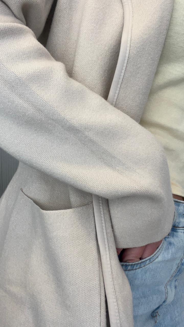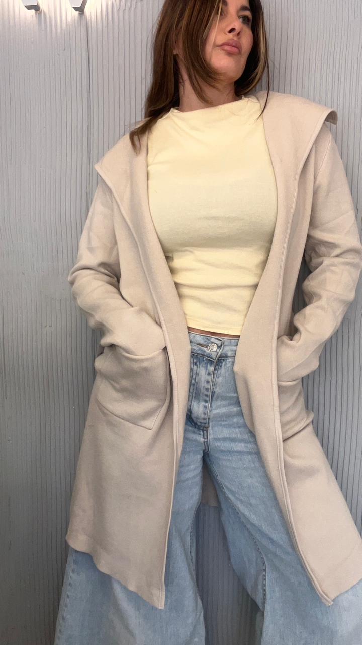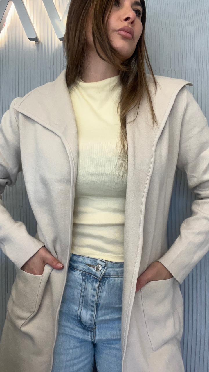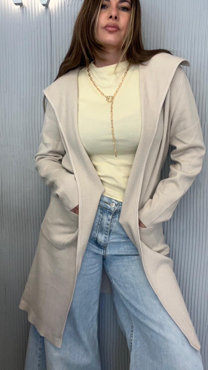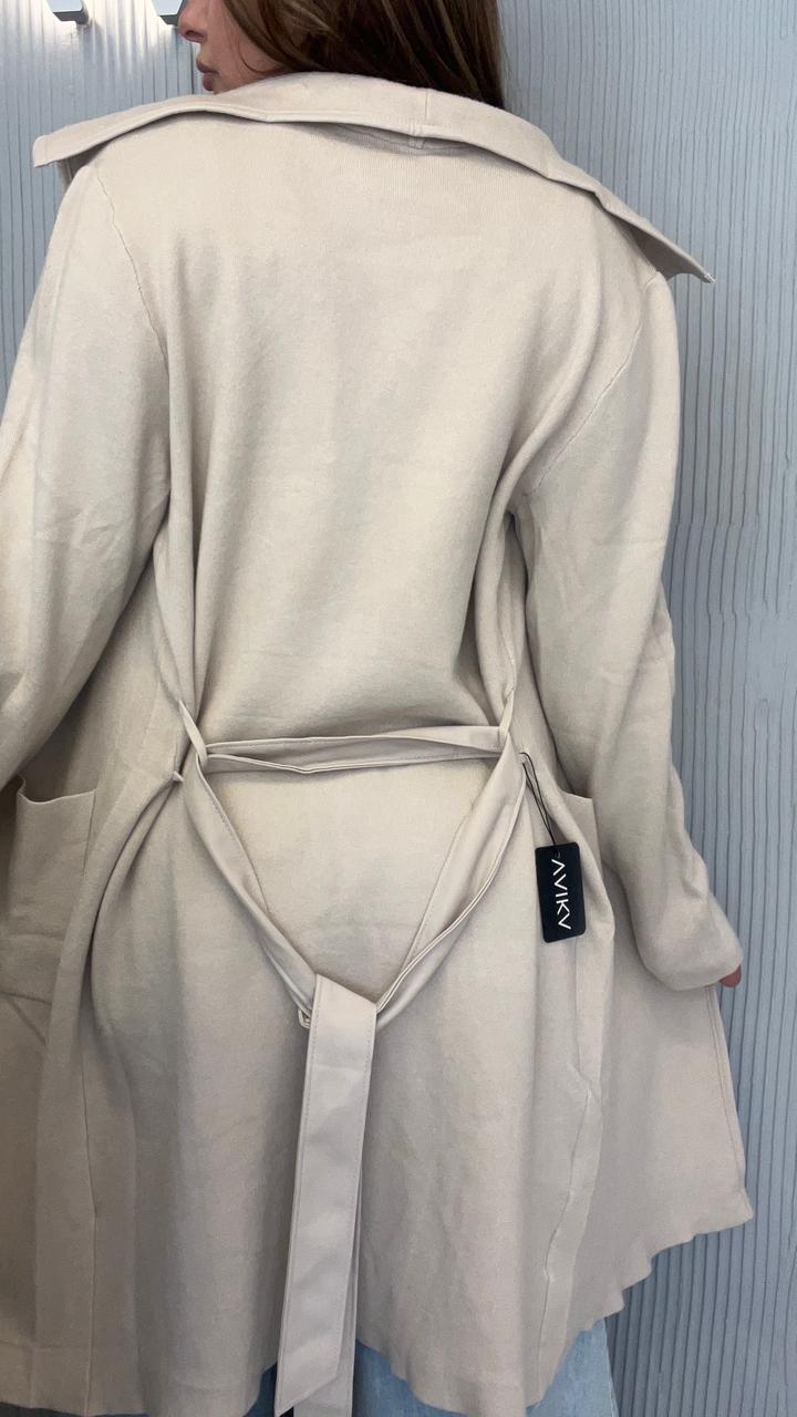 SACO LARGO DE BREMER 50% VISCOSA, 28% POLIESTER, 22% NAILON. CUELLO CON SOLAPA. DOS BOLSILLOS DELANTEROS. DETALLE DE VIVO DE CUERINA EN EL FRENTE. CON CINTO DE CUERINA.