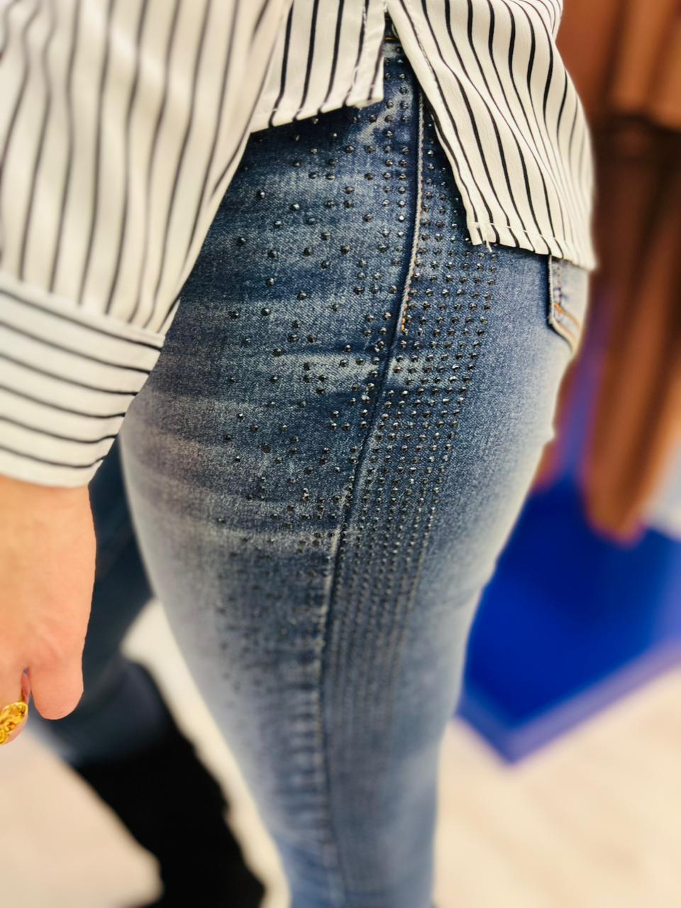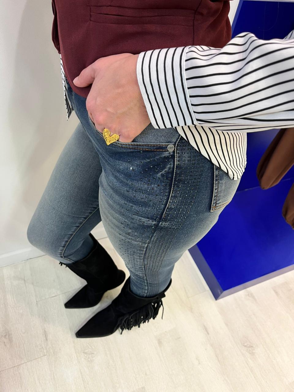 Jean calce skinny elastizado. Tiro alto. Cinco bolsillos.