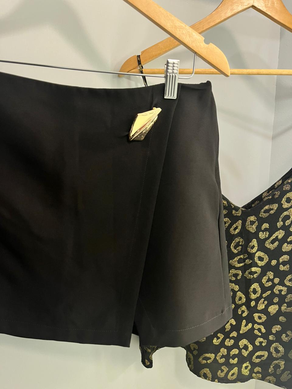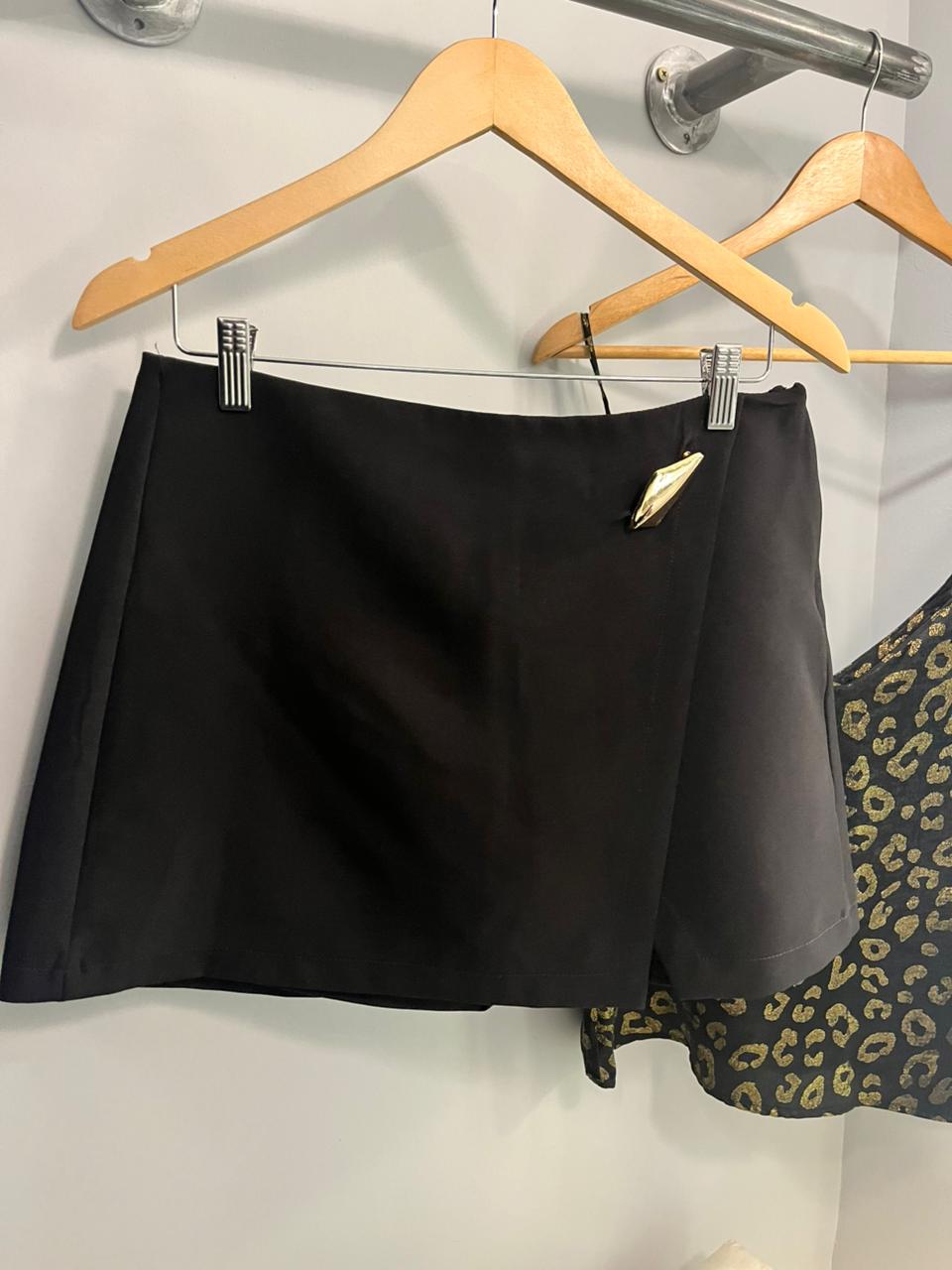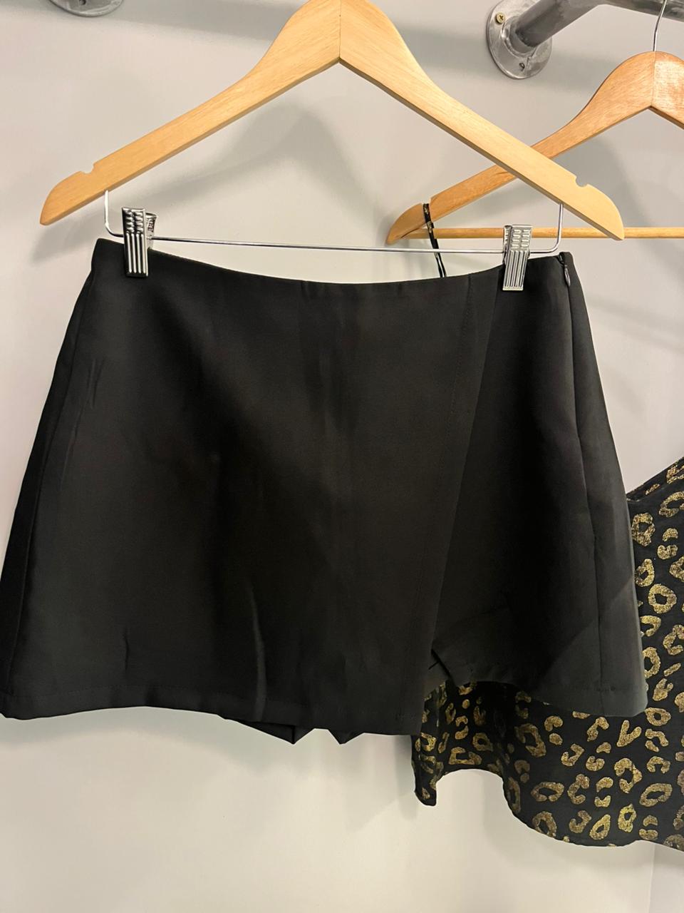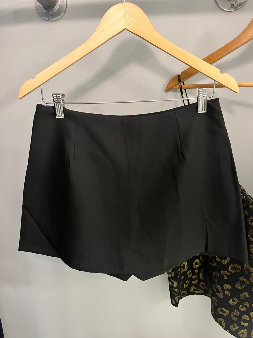 Short pollera portafolio de crepe sastrero. Tiene cierre lateral y detalle de aplique metalico dorado.La talle 42 no tiene aplique, las demas si.