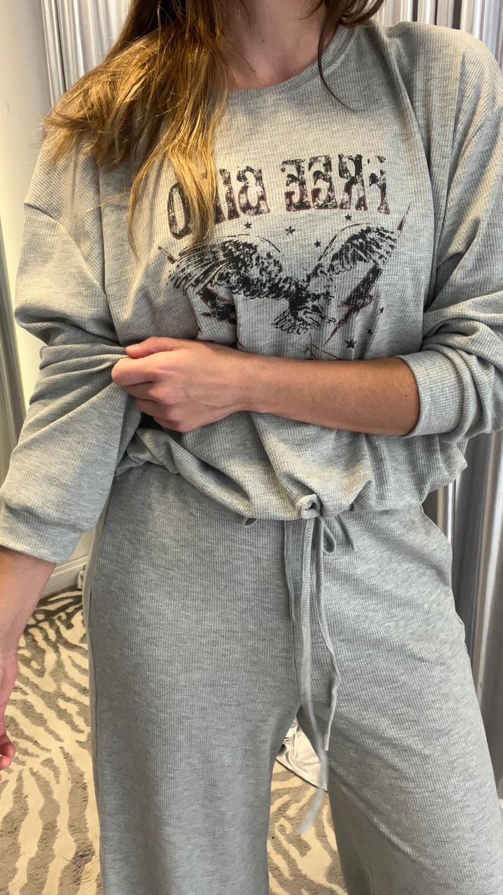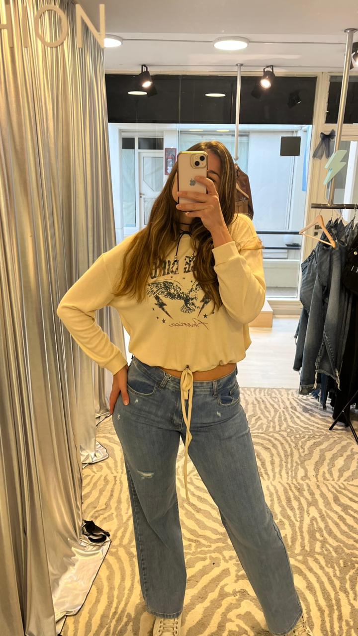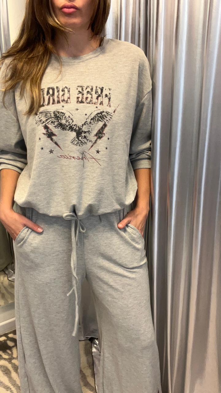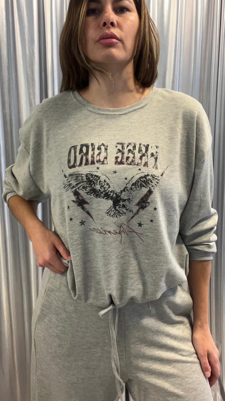 Buzo en tela waffle de punto con estampa central en delantero. Cuello redondo, sisa baja y tirita para ajustar en el ruedo. Podés hacer conjunto con *Pantalón Lewis.