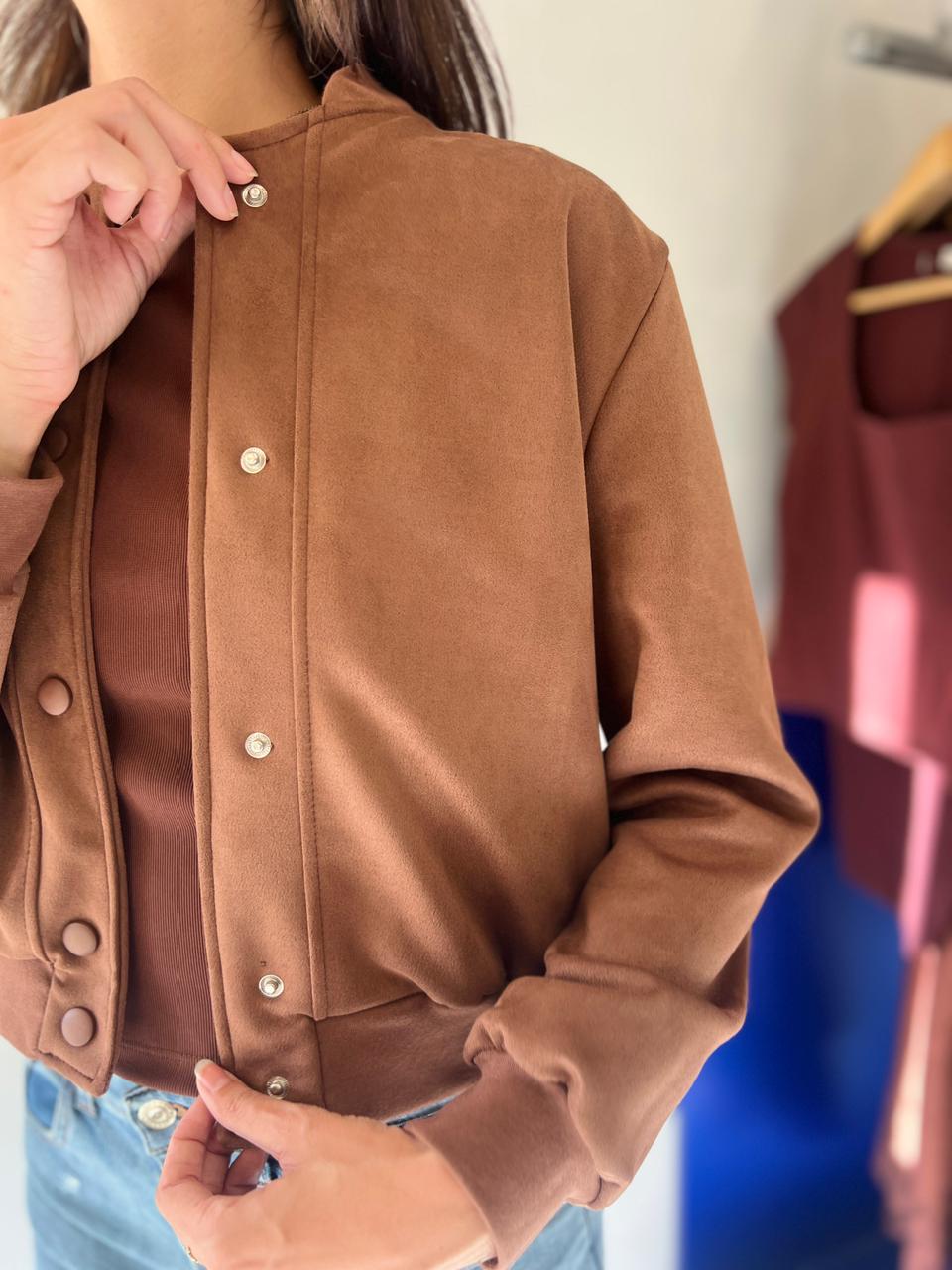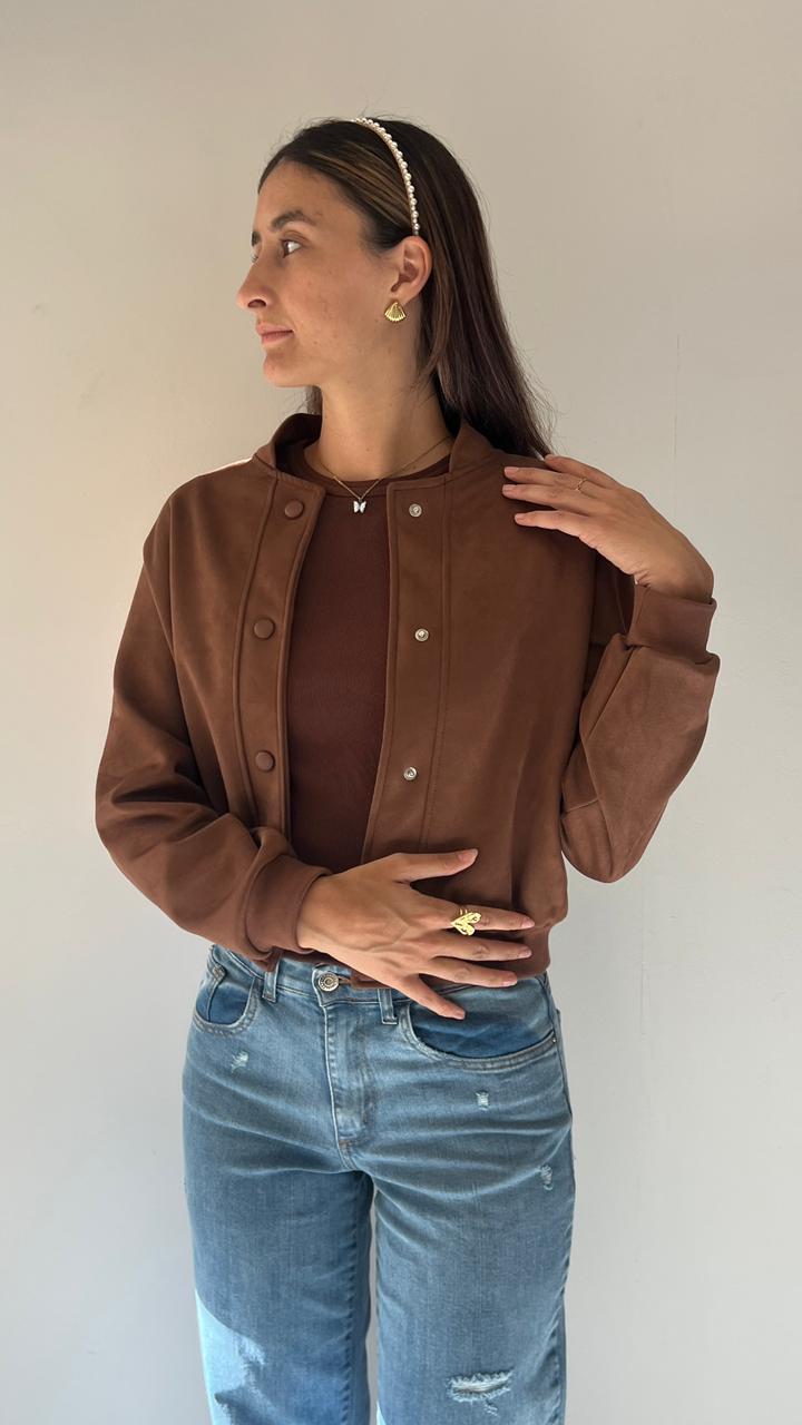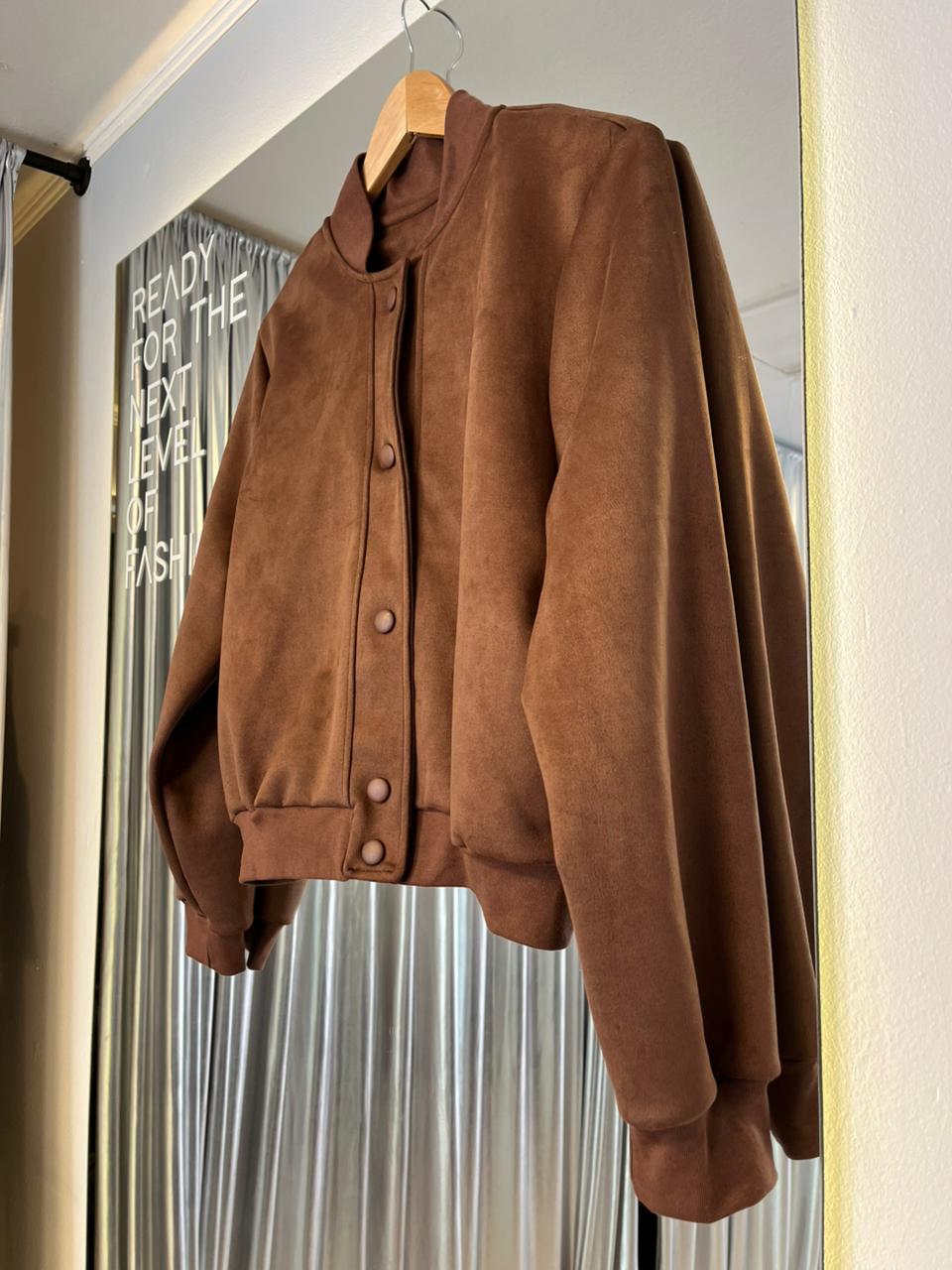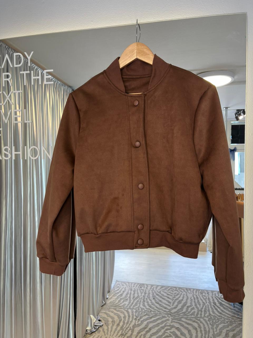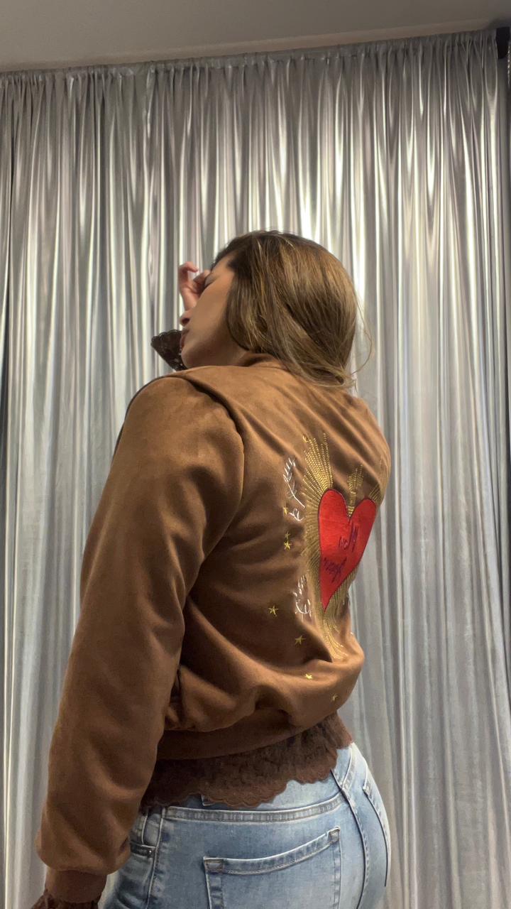 Campera bombera de cuero gamuzado con bordado en la espalda y detalles en ribs (cuello, puños terminacion)
