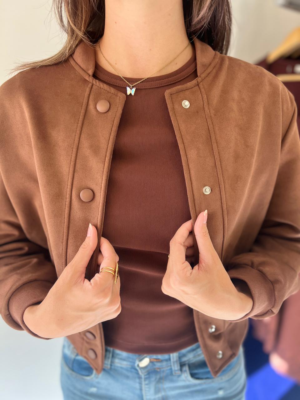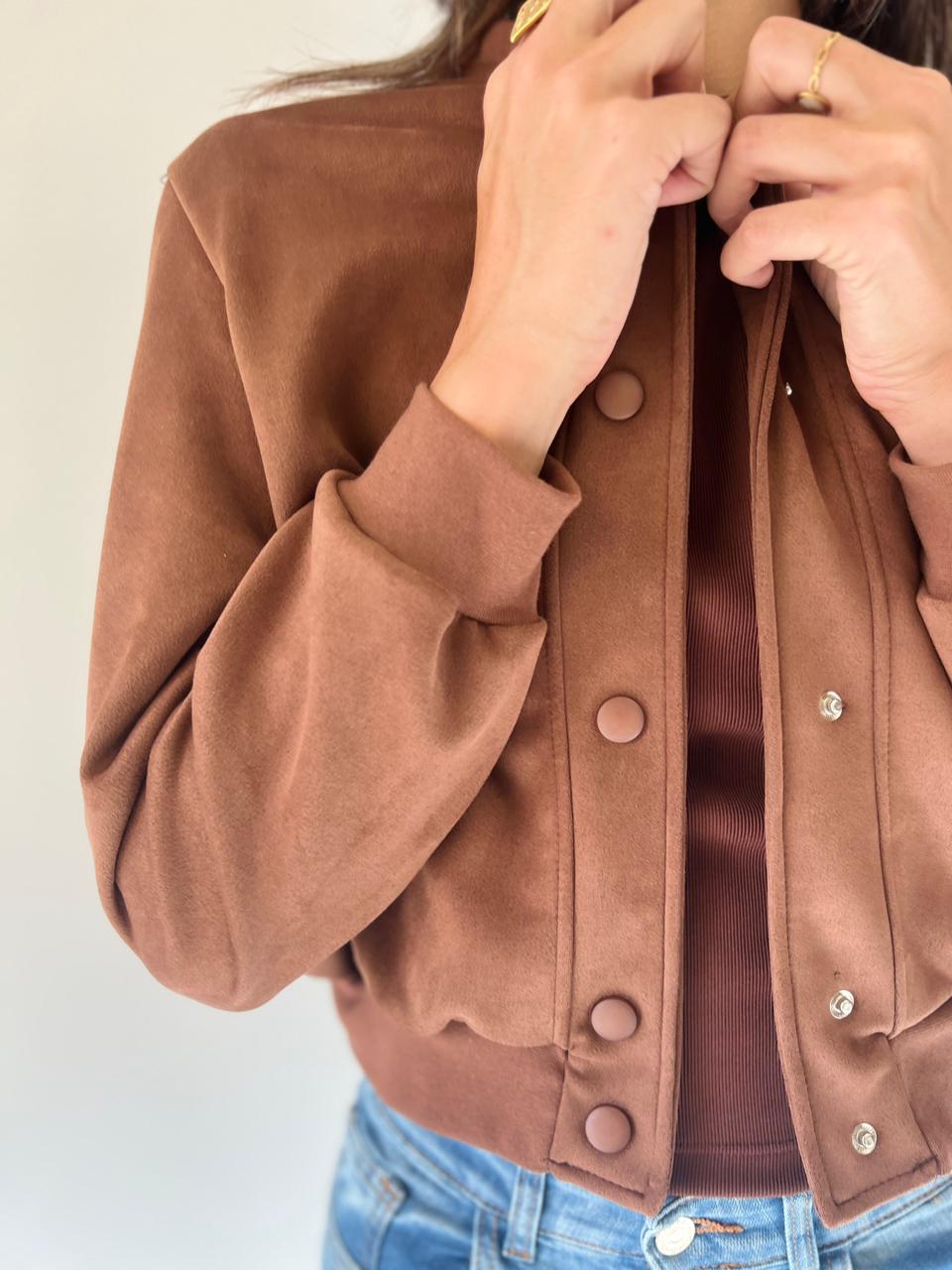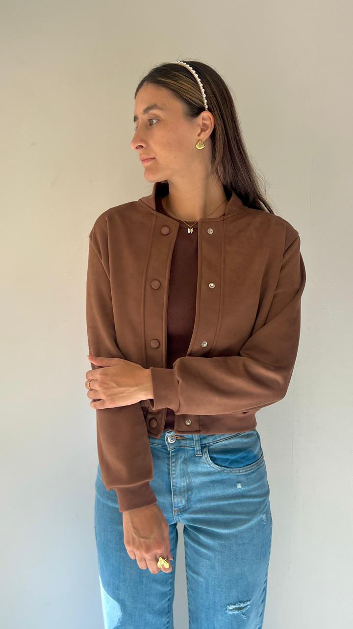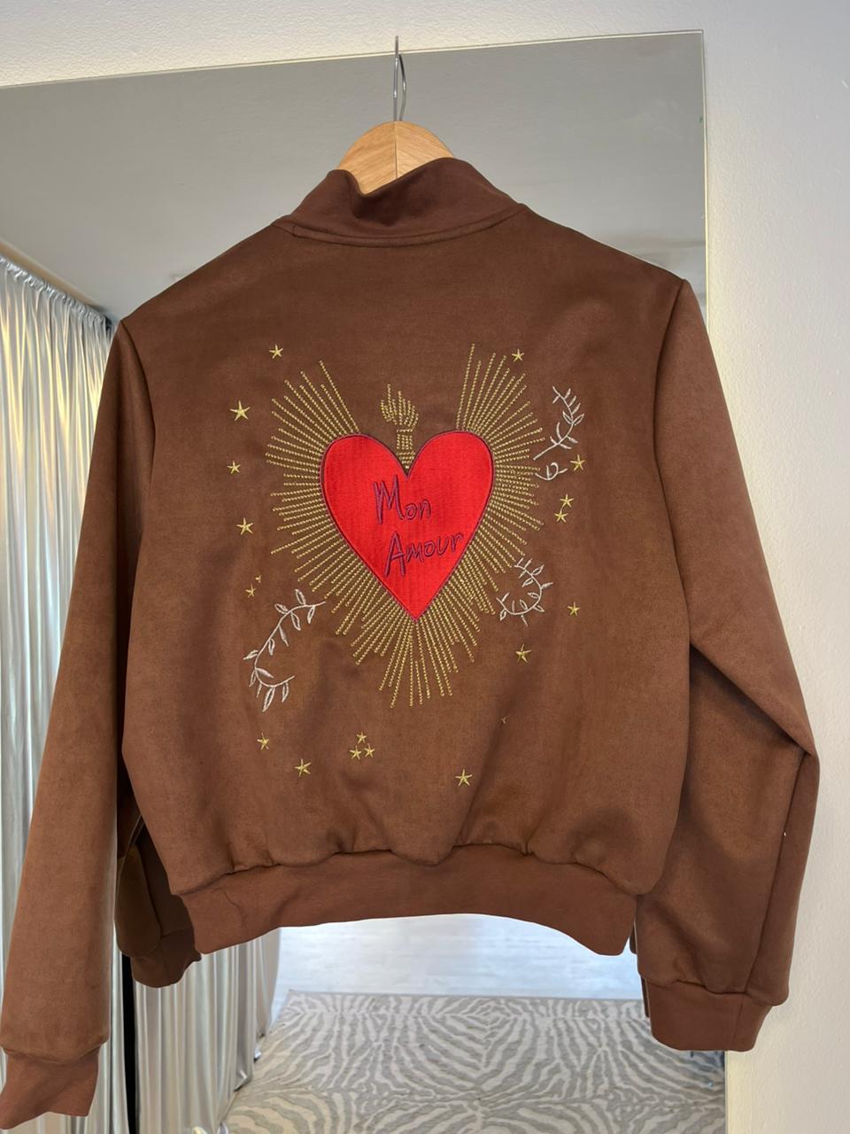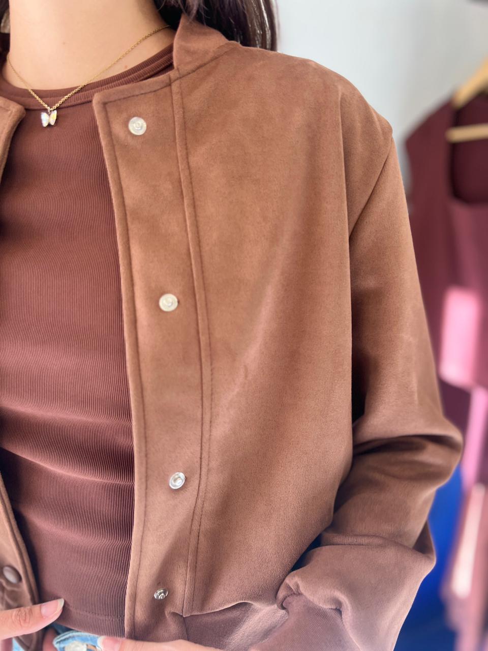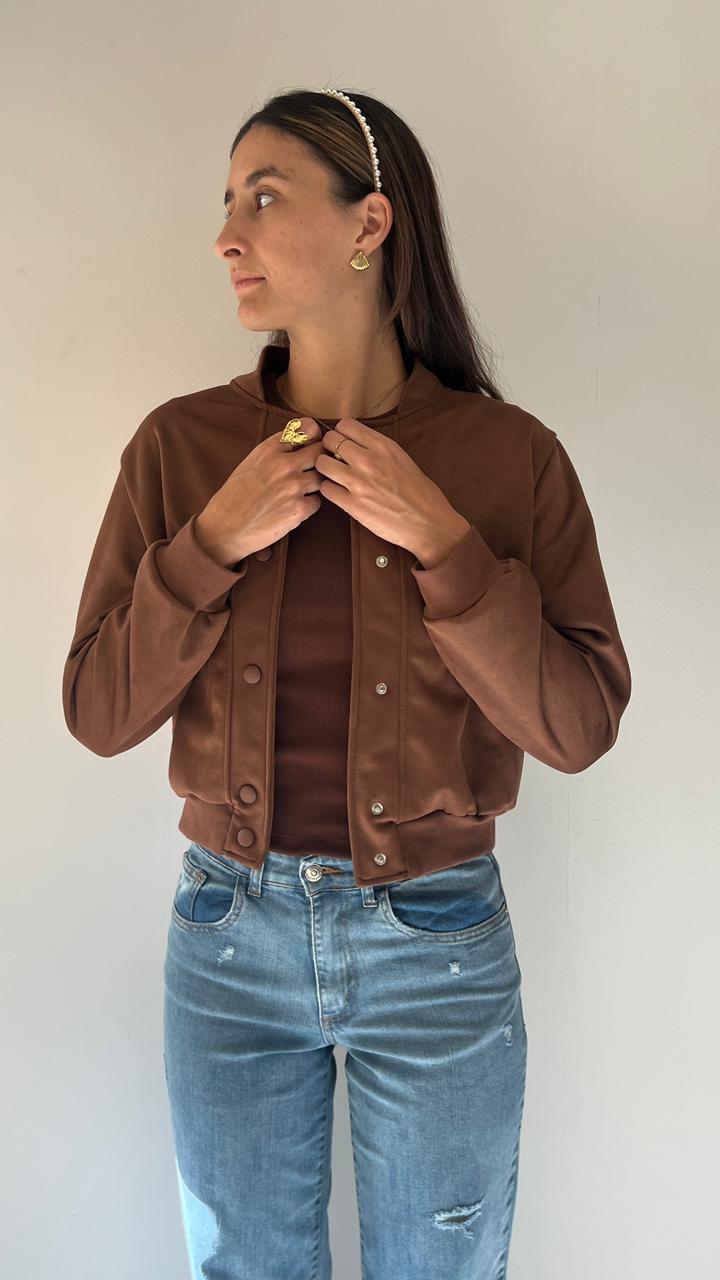 Campera bombera de cuero gamuzado con bordado en la espalda y detalles en ribs (cuello, puños terminacion)