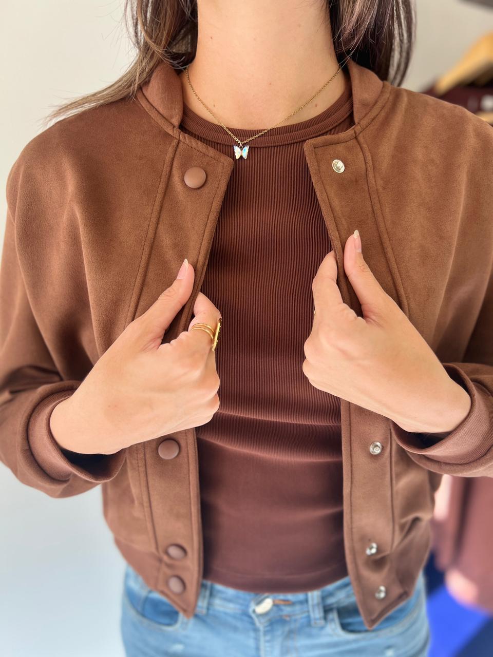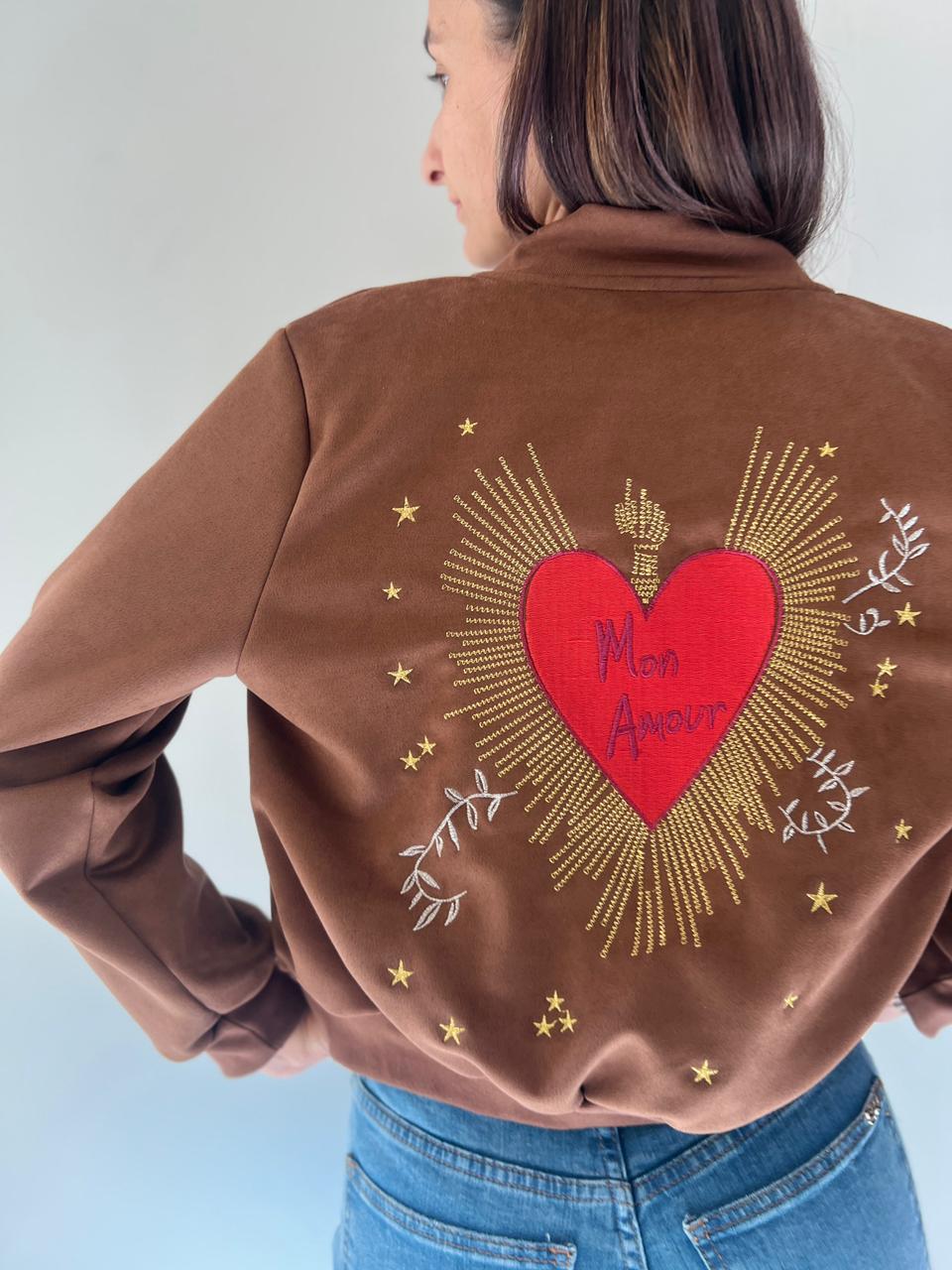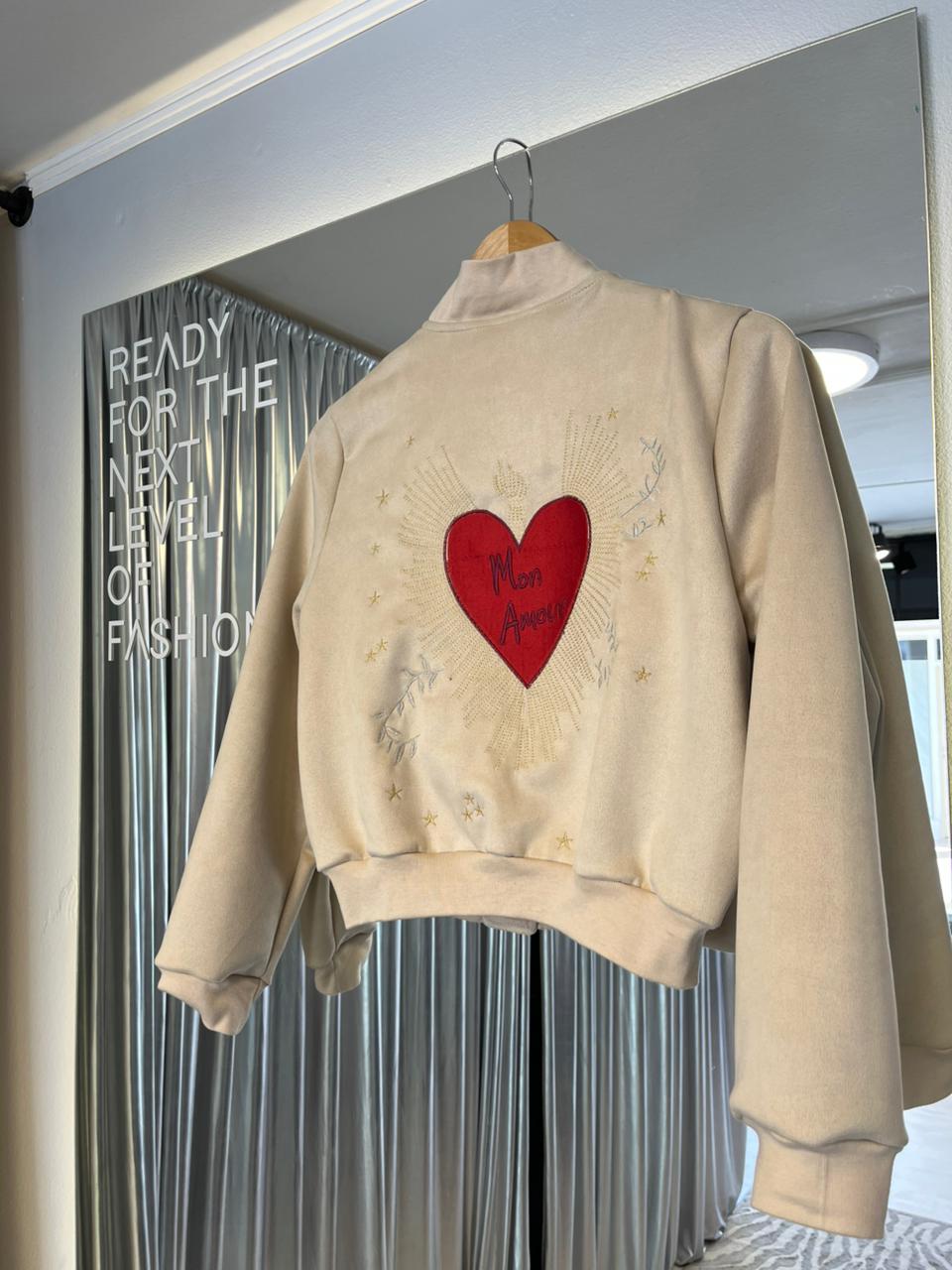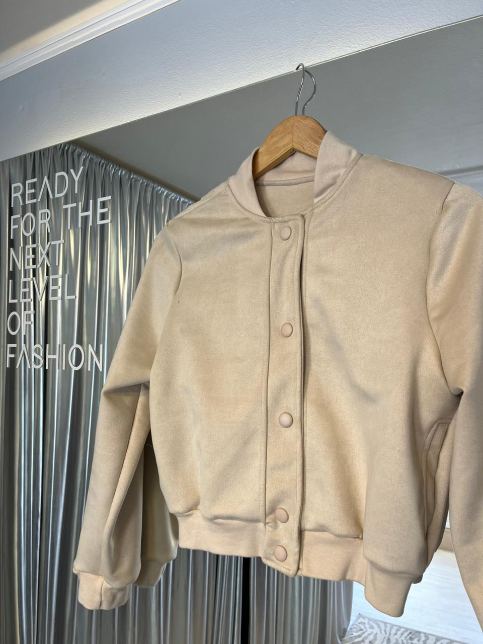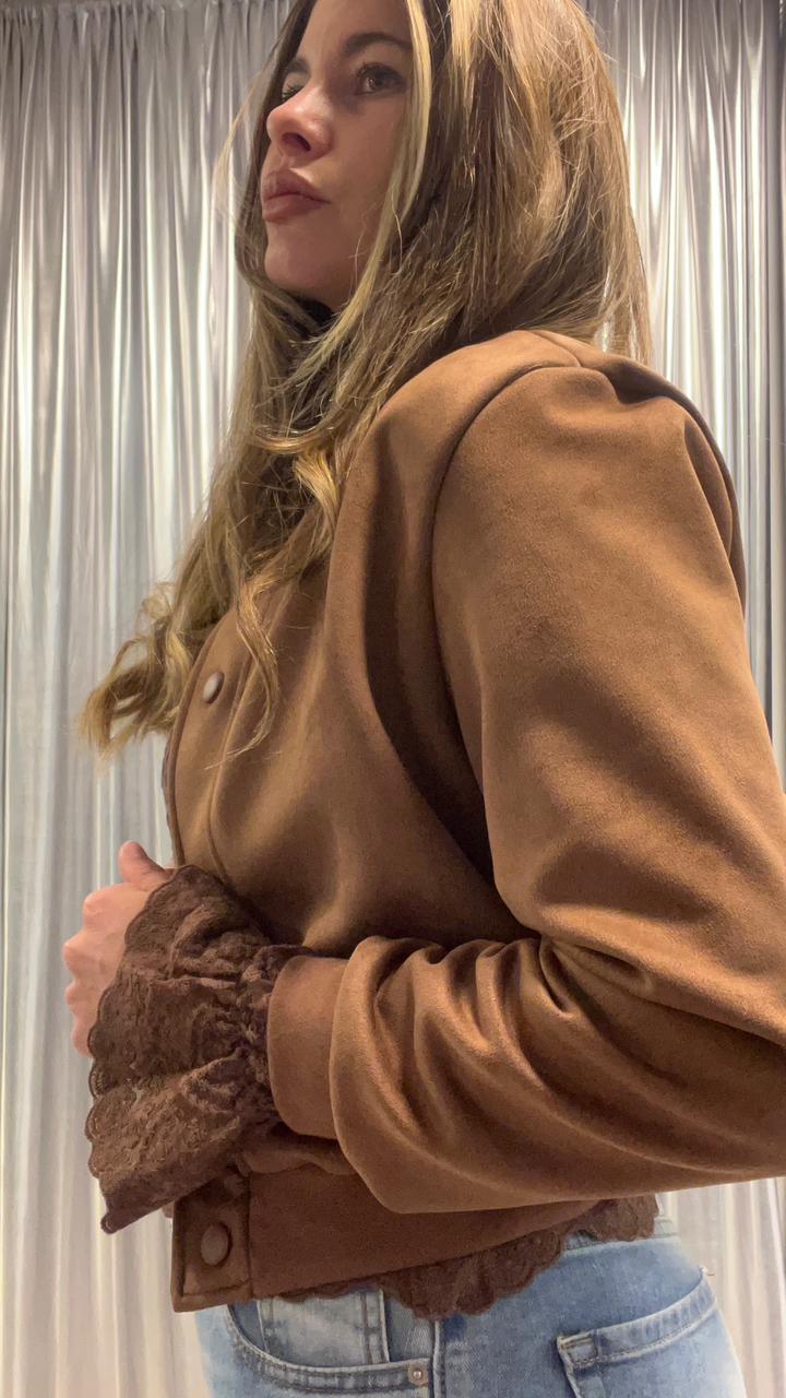 Campera bombera de cuero gamuzado con bordado en la espalda y detalles en ribs (cuello, puños terminacion)