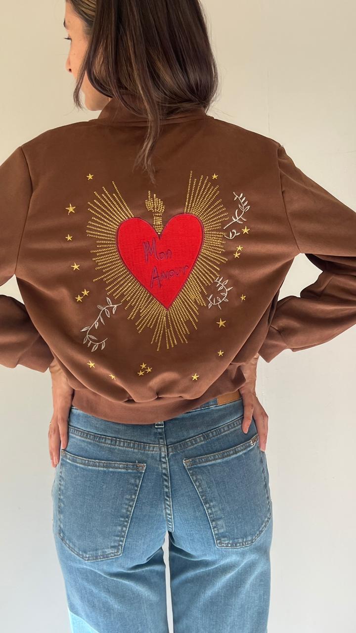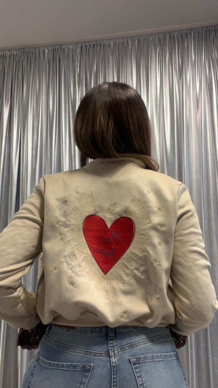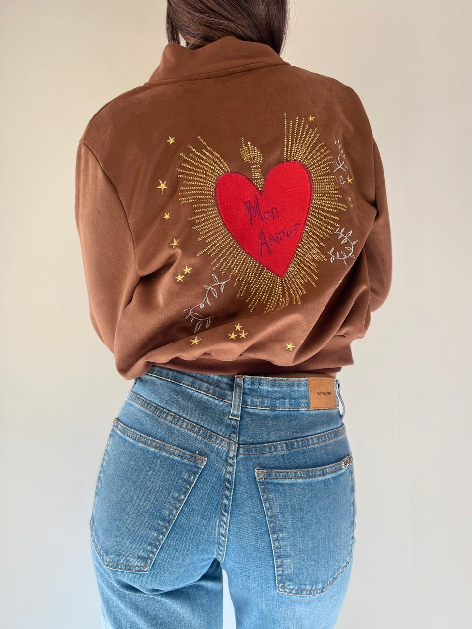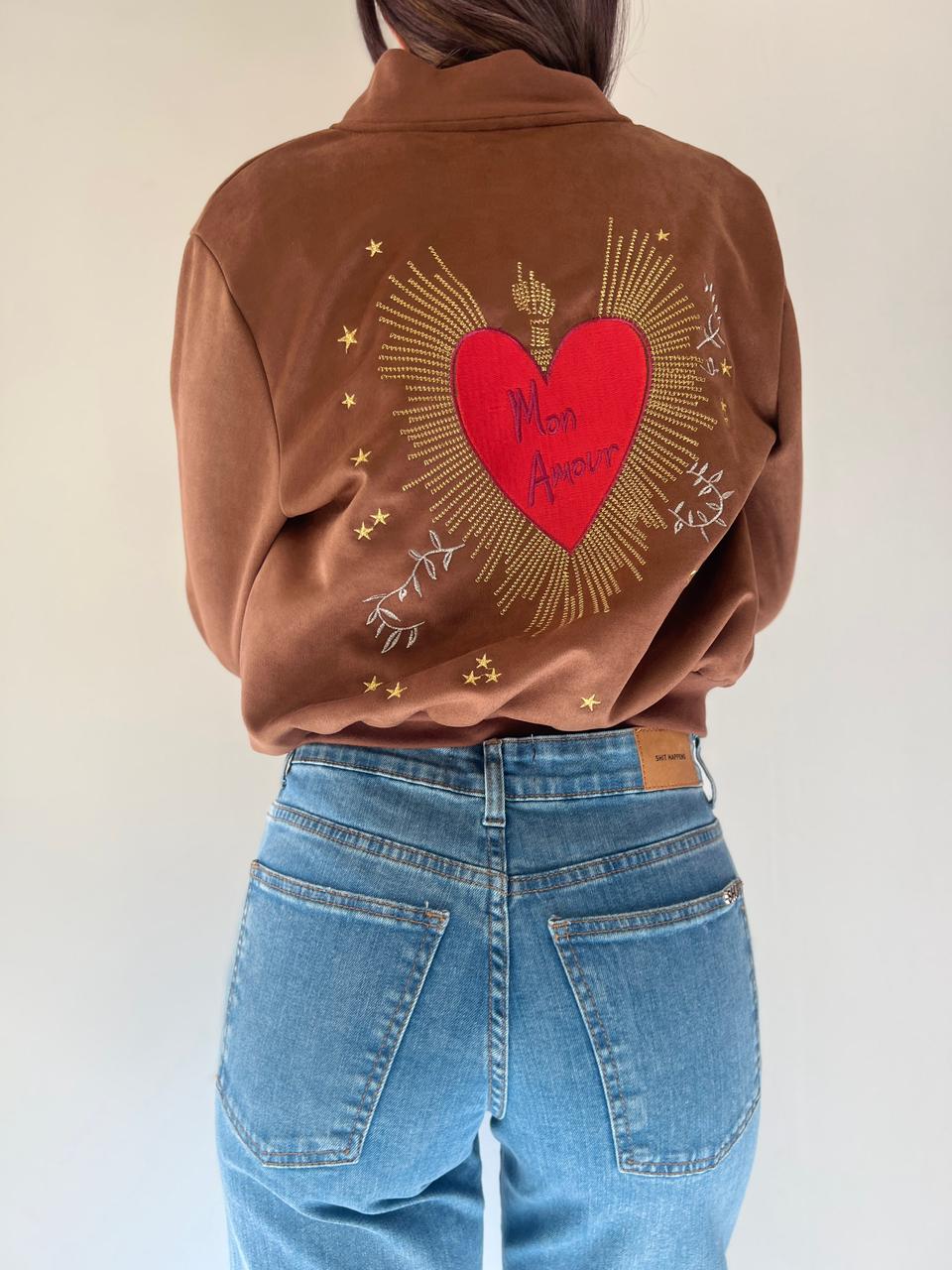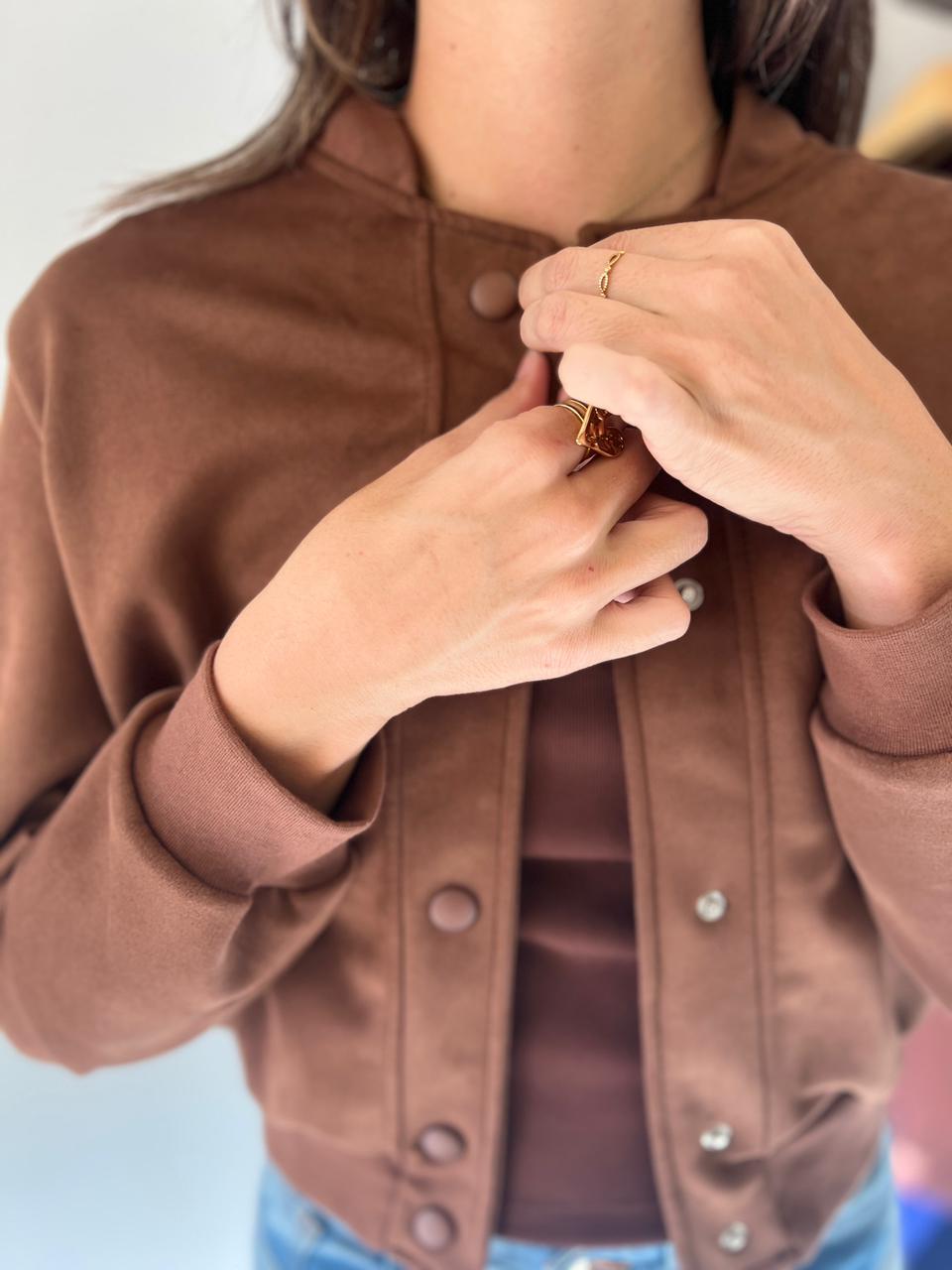 Campera bombera de cuero gamuzado con bordado en la espalda y detalles en ribs (cuello, puños terminacion)