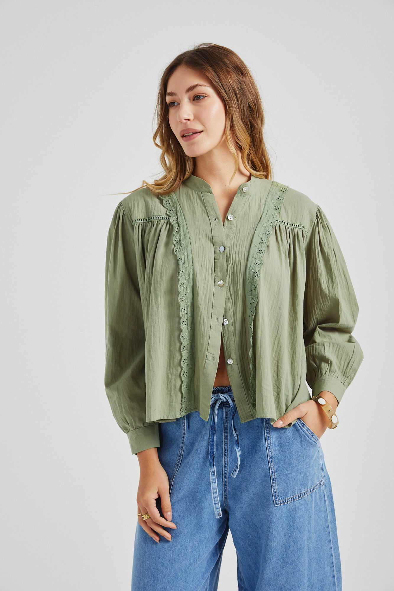 Camisa ancha en cotton wash con escote en v y puntilla en frentes.