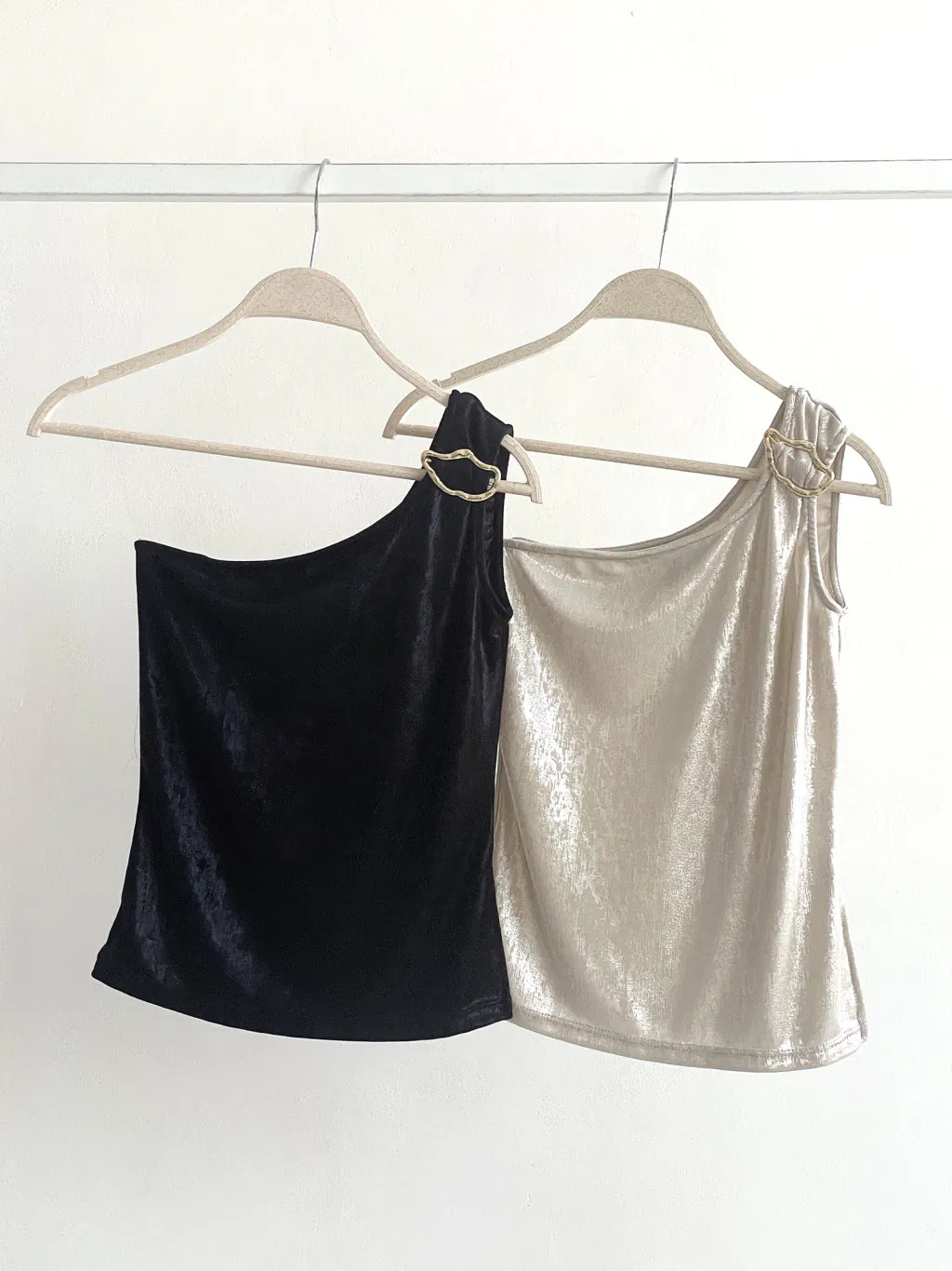 Descripción : Top asimétrico con detalle de avío dorado en el bretel. Tajo lateral.