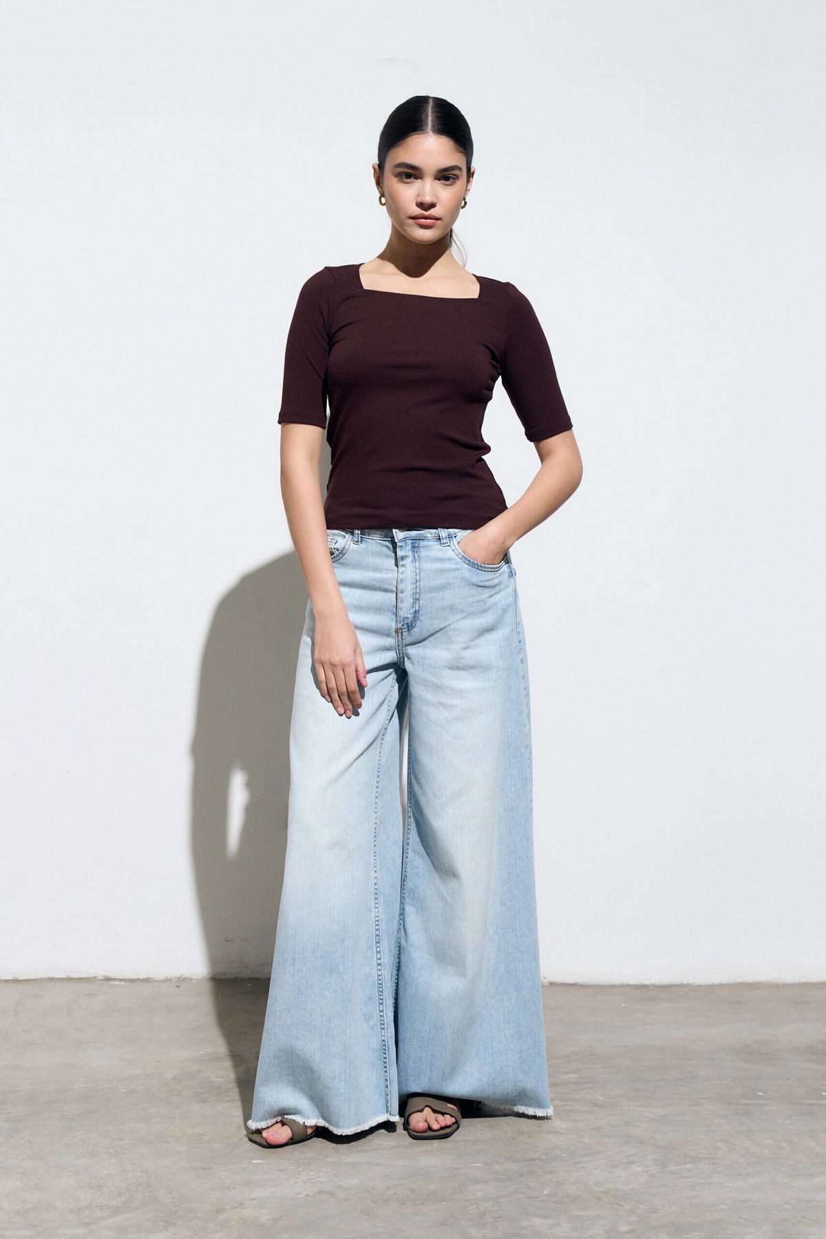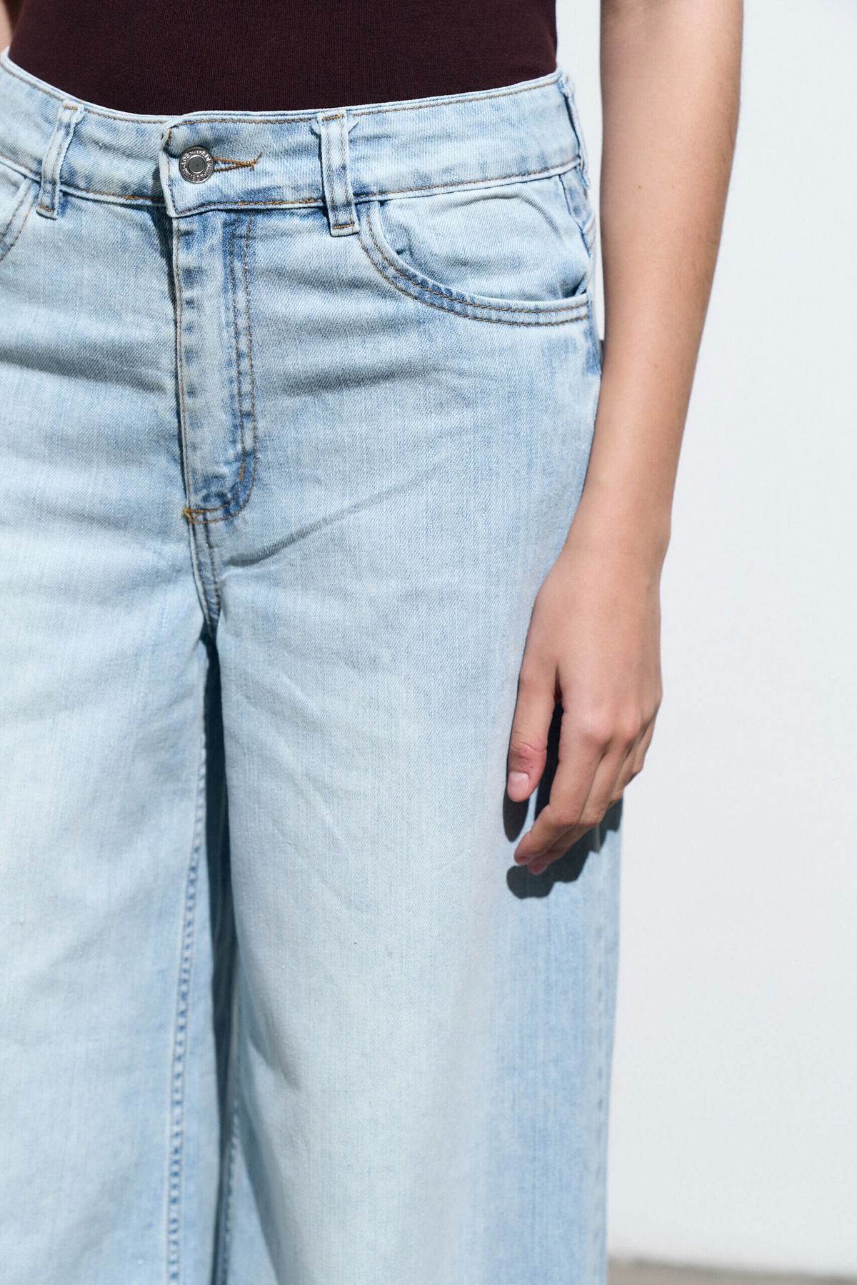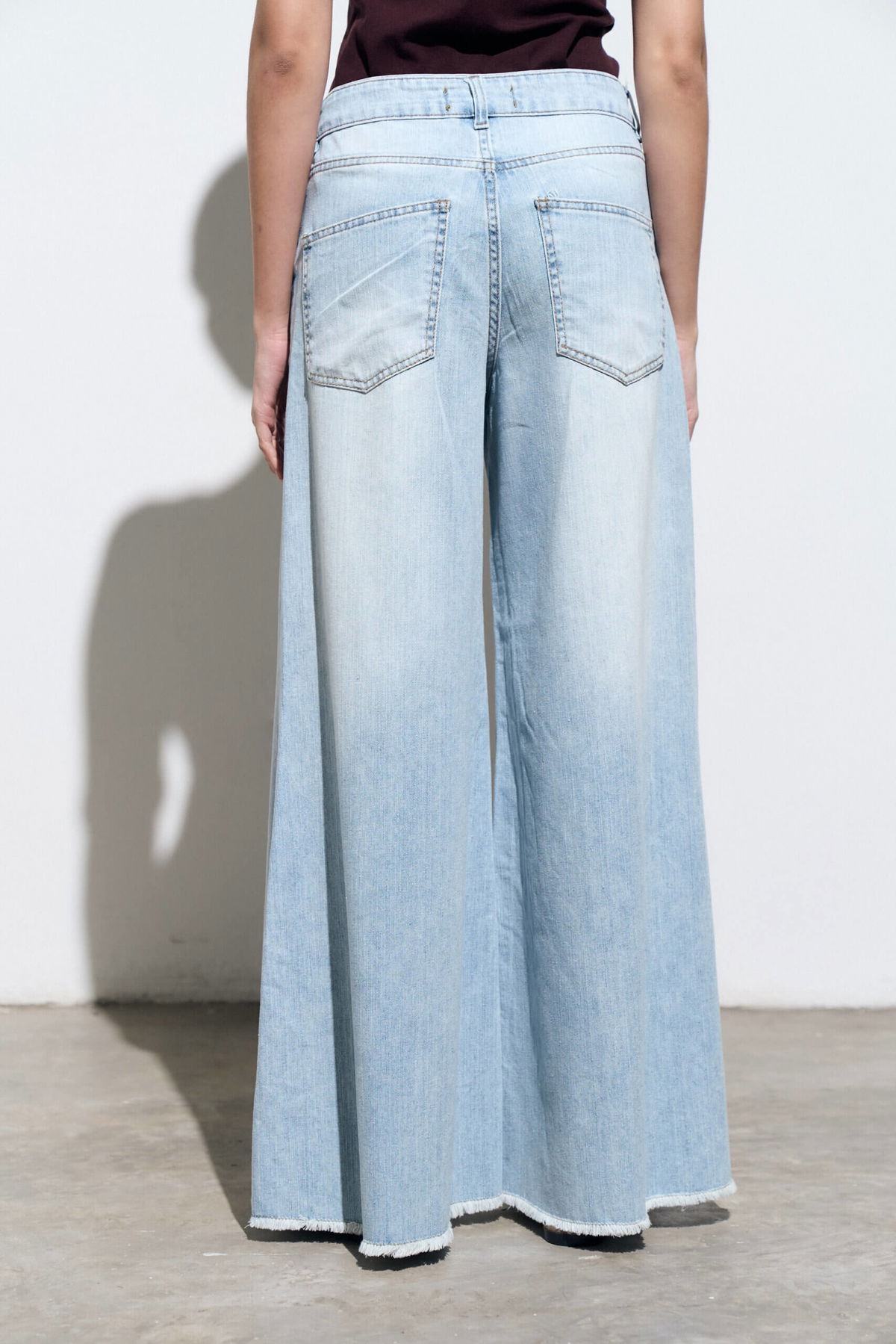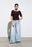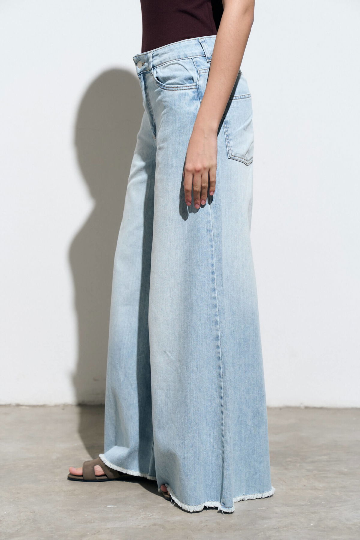 Jean palazzo elastizado tiro medio, 5 bolsillos con ruedo al corte.