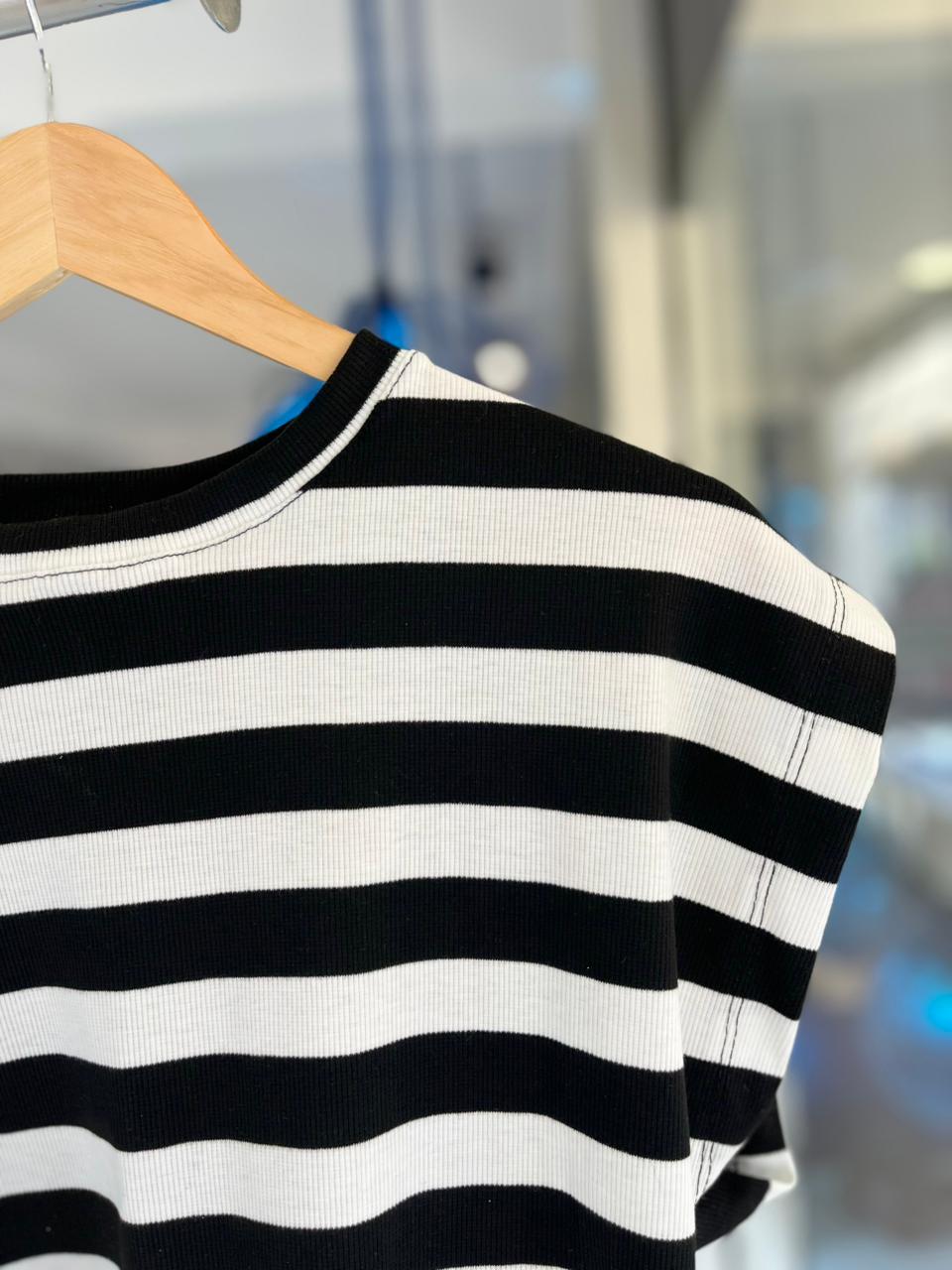 Remera amplia de morley con estampa a rayas, escorte redondo y manga japonesa.