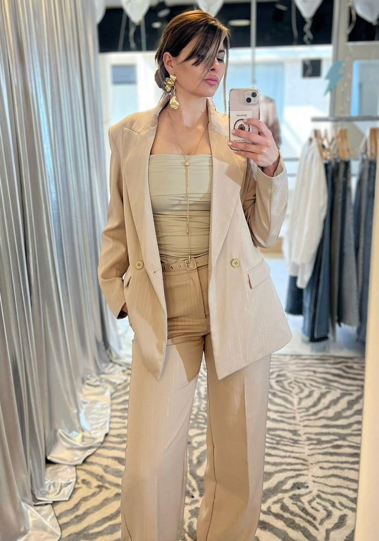 Hace conjutno con blazer oversize con lurex.